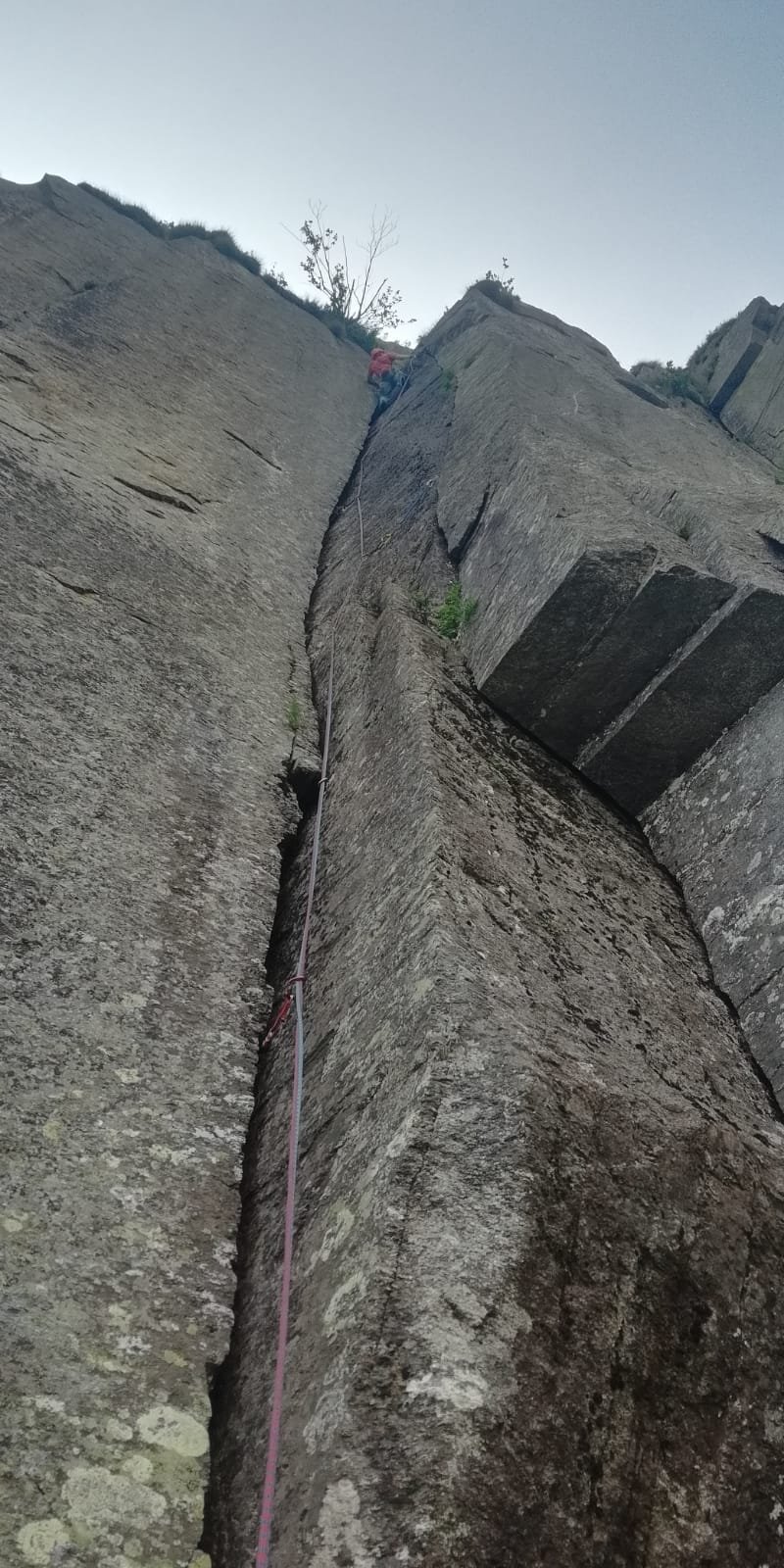 L4: fessura incastro per mani piccole, camalot 3-4-2-1-0,75 vari…25m 5.11d poi 30m 6a+ fino in sosta(mettere qualche nut).