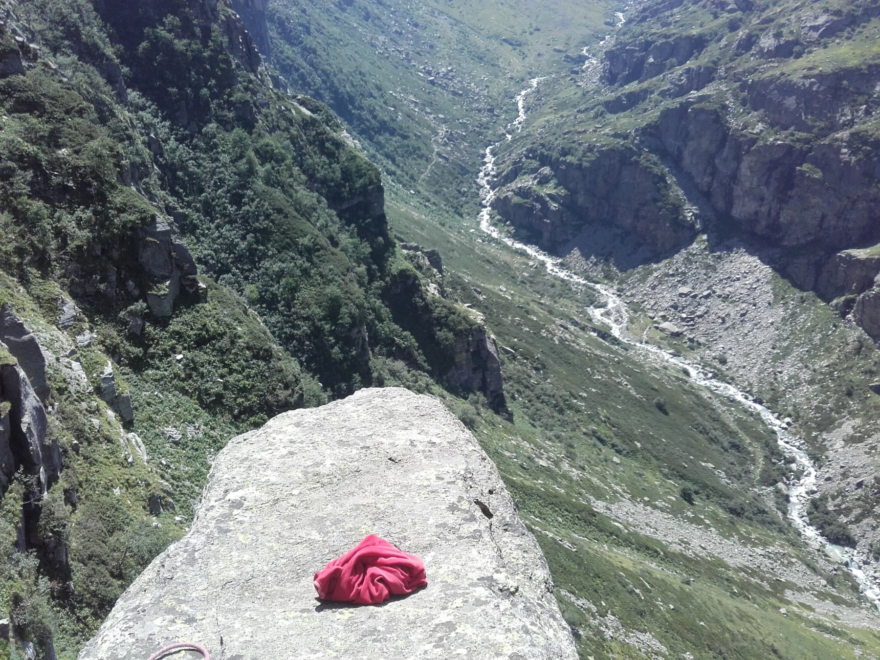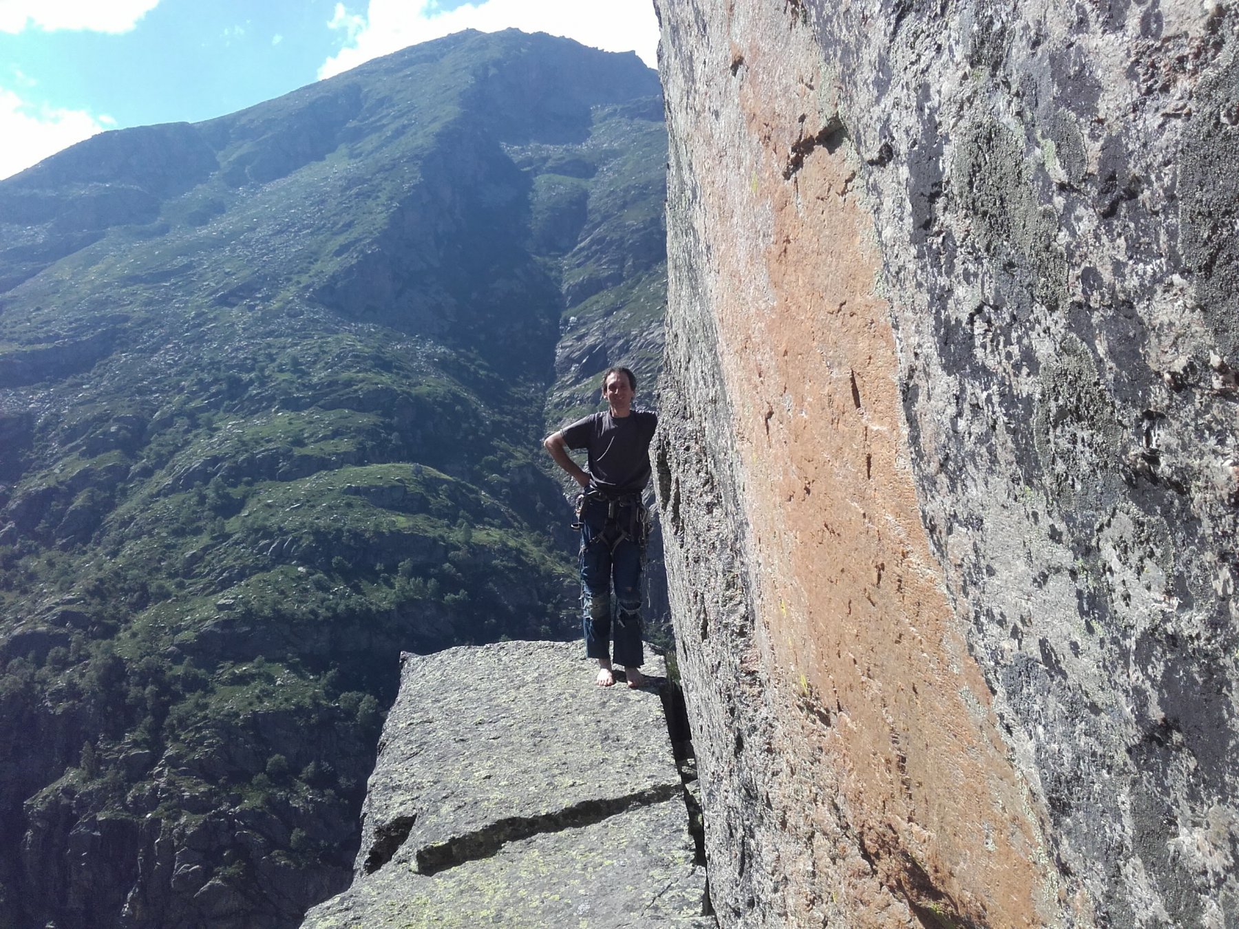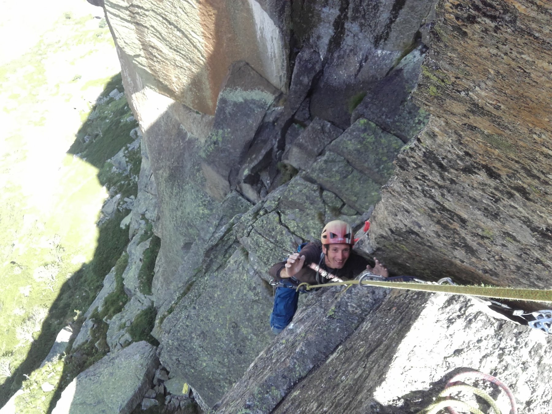 6° tiro) Tiro nuovo 2017. Tiro breve che segue l’aerea crestina fino a un bel ripiano di roccia, dove l’avancorpo è completamente staccato dalla successiva parete principale. Grado 5c. 2 fix+2 di sosta.