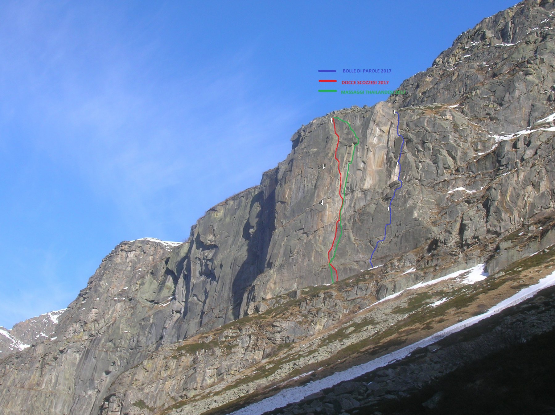 Bolle di parole fu aperta da G.C. Grassi, V. Rudatis e A. Siri il 14 giugno 1987 ed era di soli 60m. Nei giorni 16-22-23 luglio 2017 la via è stata allungata, completamente rivista e raddrizzata da Luca Brunati, Luca Enrico, Matteo Enrico. Dell’originale rimane in pratica solo il diedro tappezzato di quarzo bianco, in origine primo tiro.