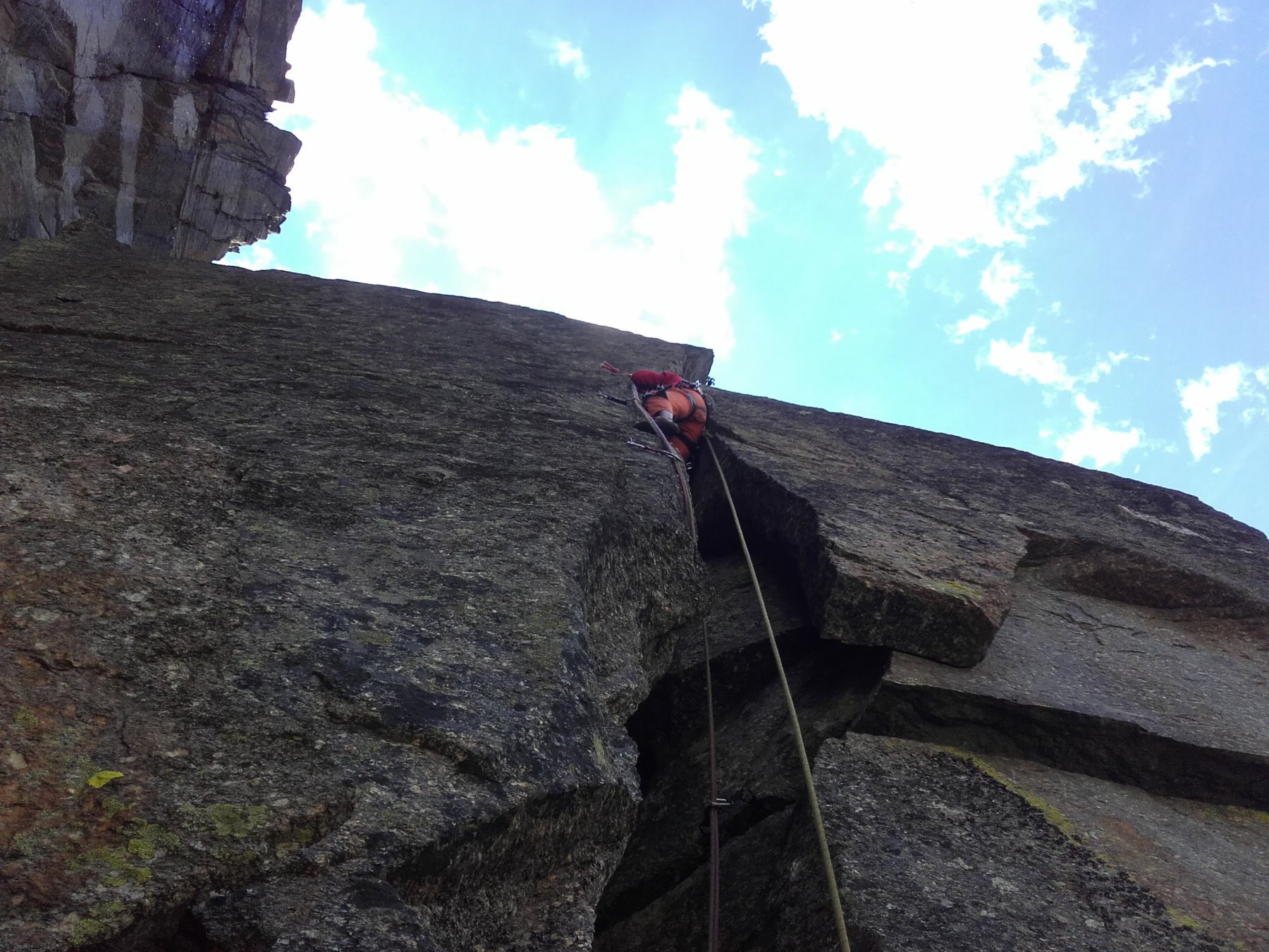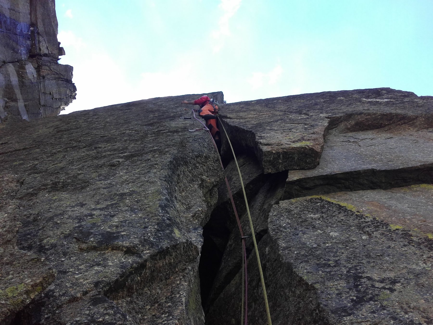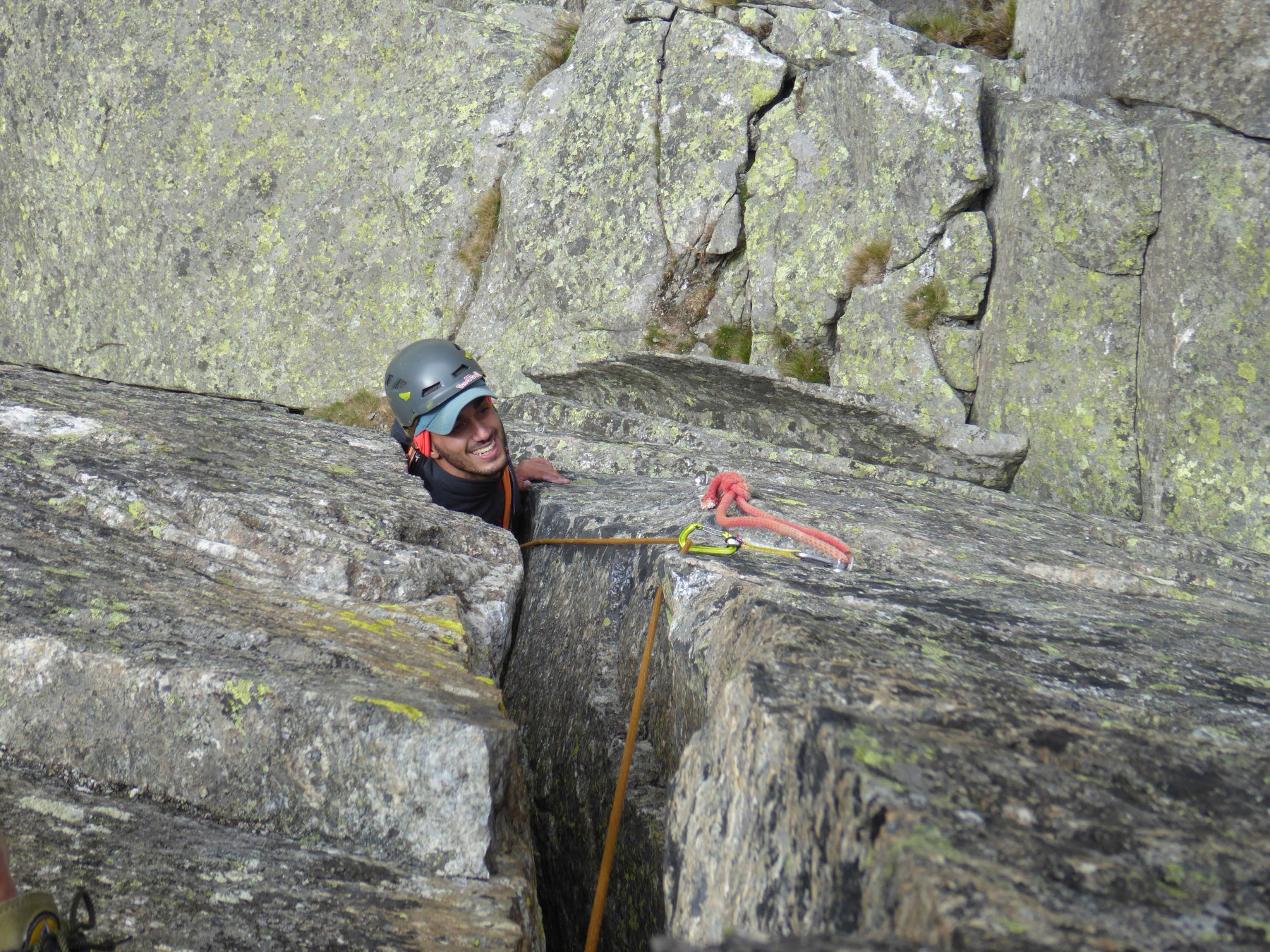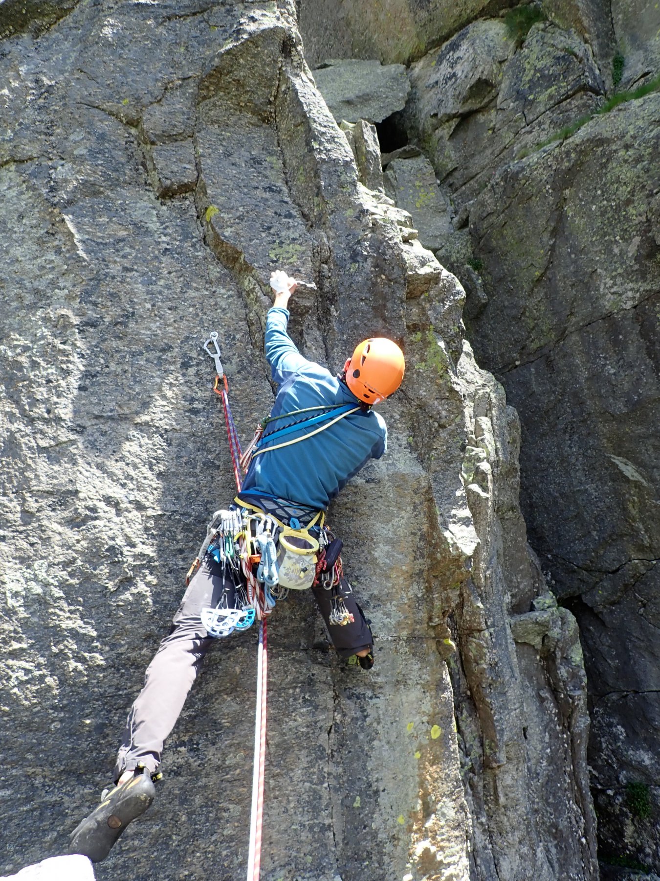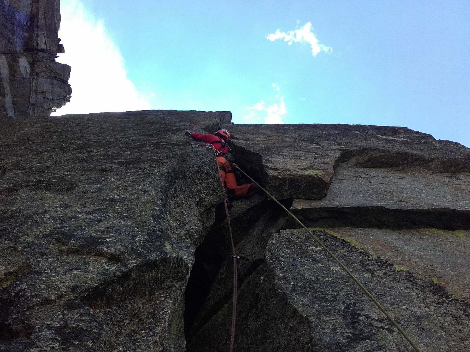 5° tiro) Tiro nuovo 2017. Salire interamente la fessura-camino “fuori misura”. Grado 6b+ per veri amanti del genere….3 fix + 2 di sosta.