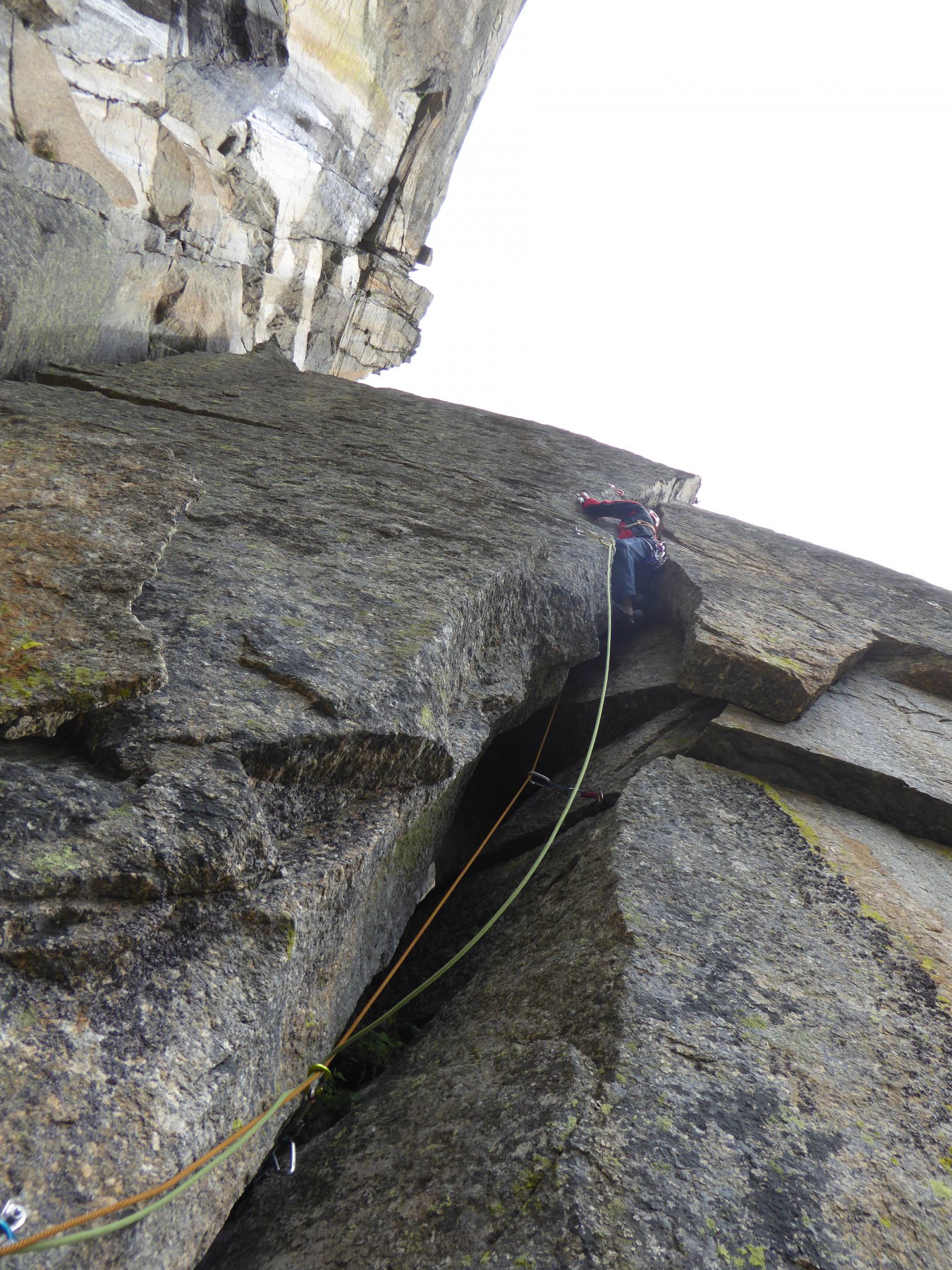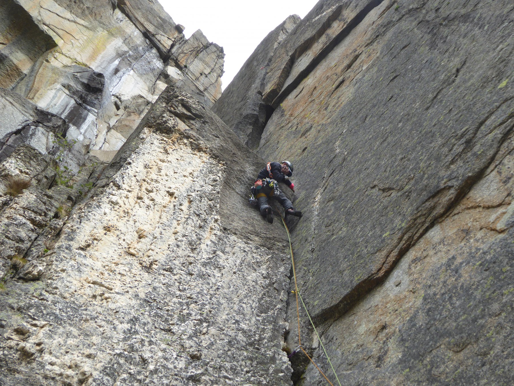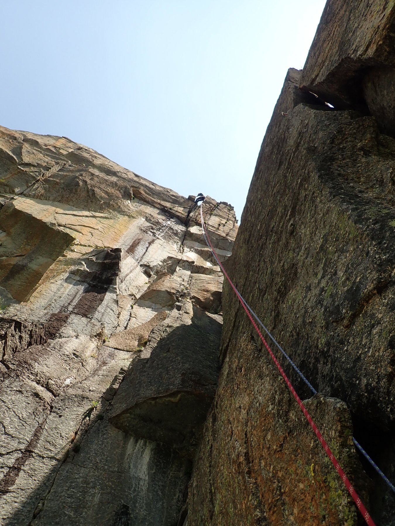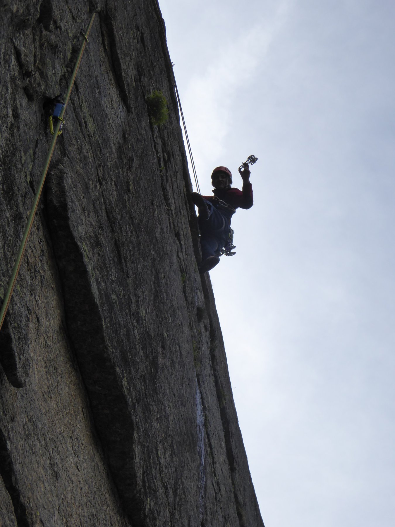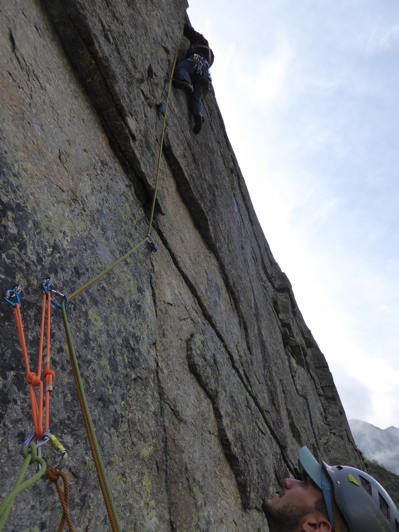 5° tiro) Tiro nuovo 2017. Salire interamente la fessura-camino “fuori misura”. Grado 6b+ per veri amanti del genere….3 fix + 2 di sosta.