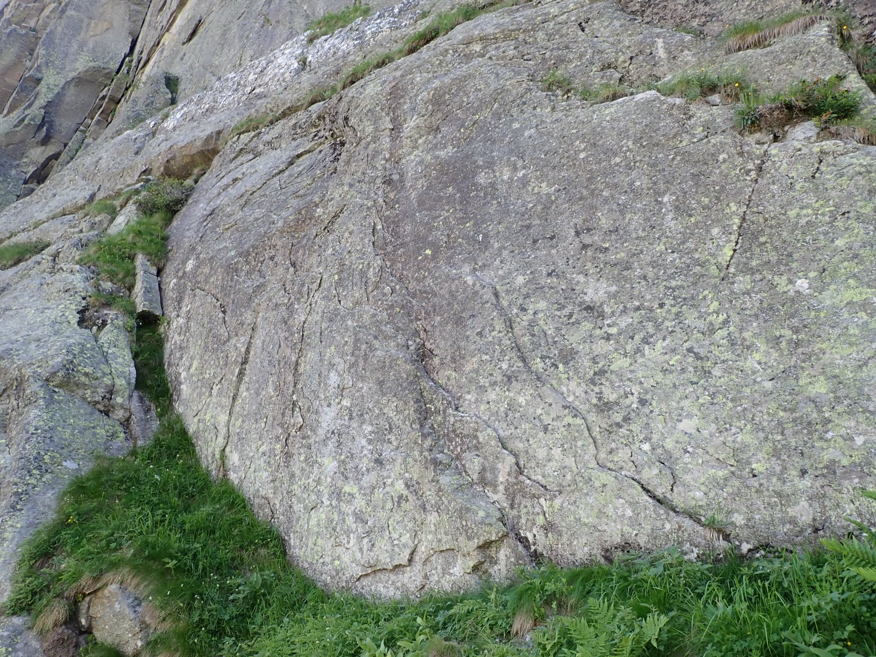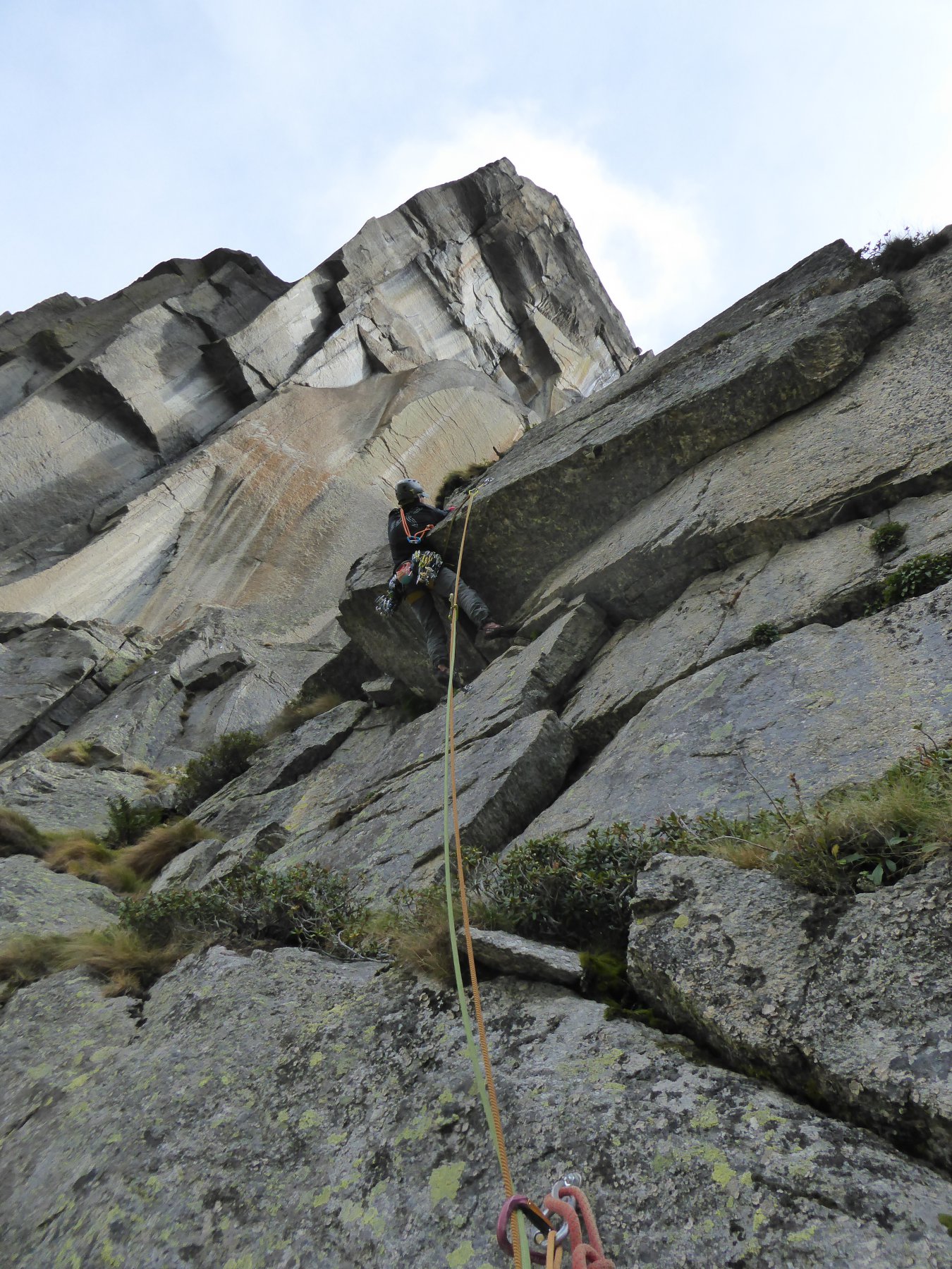 3° tiro) Tiro nuovo 2017. Diretti sopra la sosta, prima per il bordo dx di una larga fessura, poi in placca. Usciti sulla cengia erbosa salire a dx sullo stupendo ripiano erboso alla base del diedro con la faccia tappezzata di bianco quarzo. Grado 6b. 4 fix. Sosta con 1 fix+chiodo “stile Grassi”