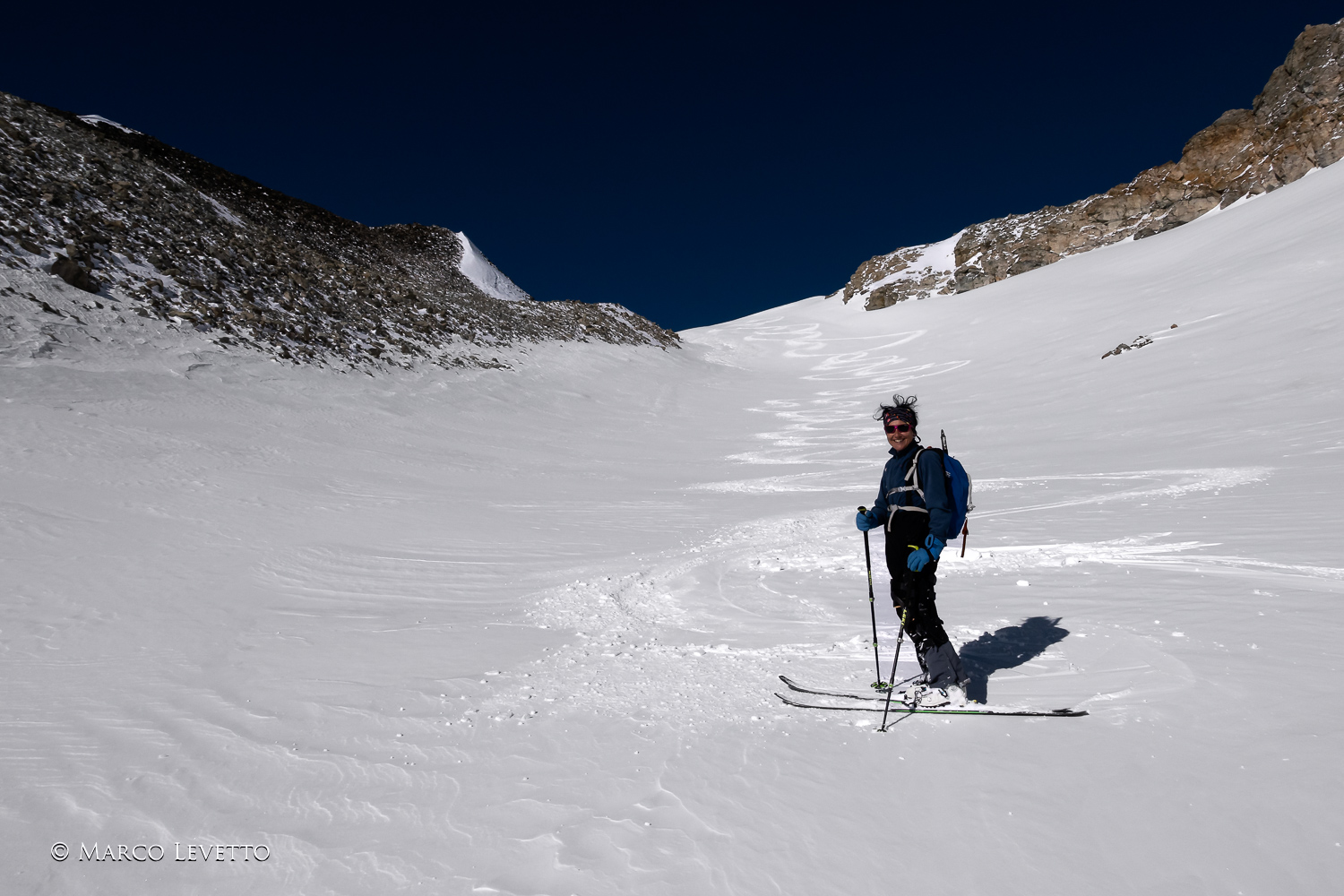 In discesa è più facile trovare i pendii giusti. Dal colle Chardoney scendere nel mezzo del vallone, poi, lasciato a sinistra l’intaglio del Col Berlon, tenersi a sinistra in modo da percorrere il cambio di pendenza sotto il Col Nord de la Sabbla tutto sulla sinistra orografica. In questo modo ci si raccorda bene ai pendii inferiori.
