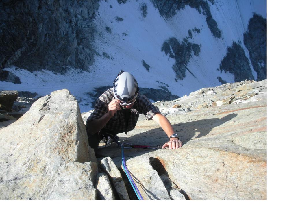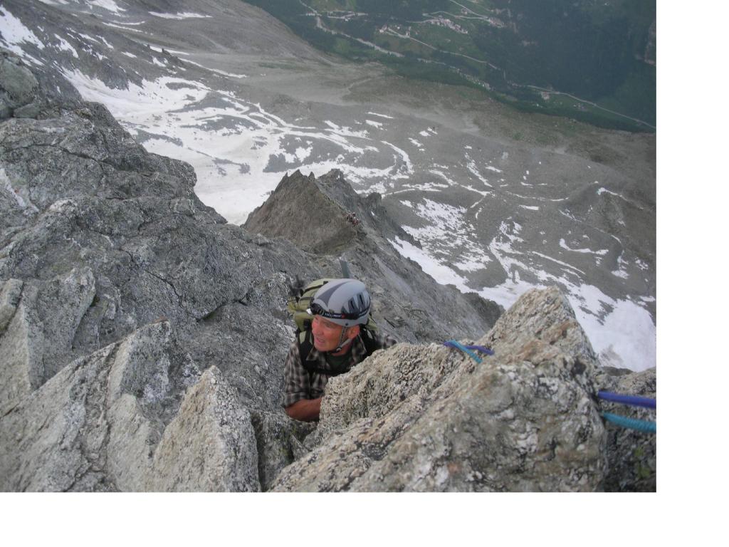 Lo si supera sul filo per un dislivello attorno ai 600m., su passaggi abbastanza continui di III III+ se si mantiene il filo. Volendo andandole a cercare si incontrano difficolta’ anche maggiori. In tre ore dalla base si arriva in cima al dent de Tsalion ad una forcella dalla quale si scende facilmente sul ghiacciaio della Tsa sul lato est.