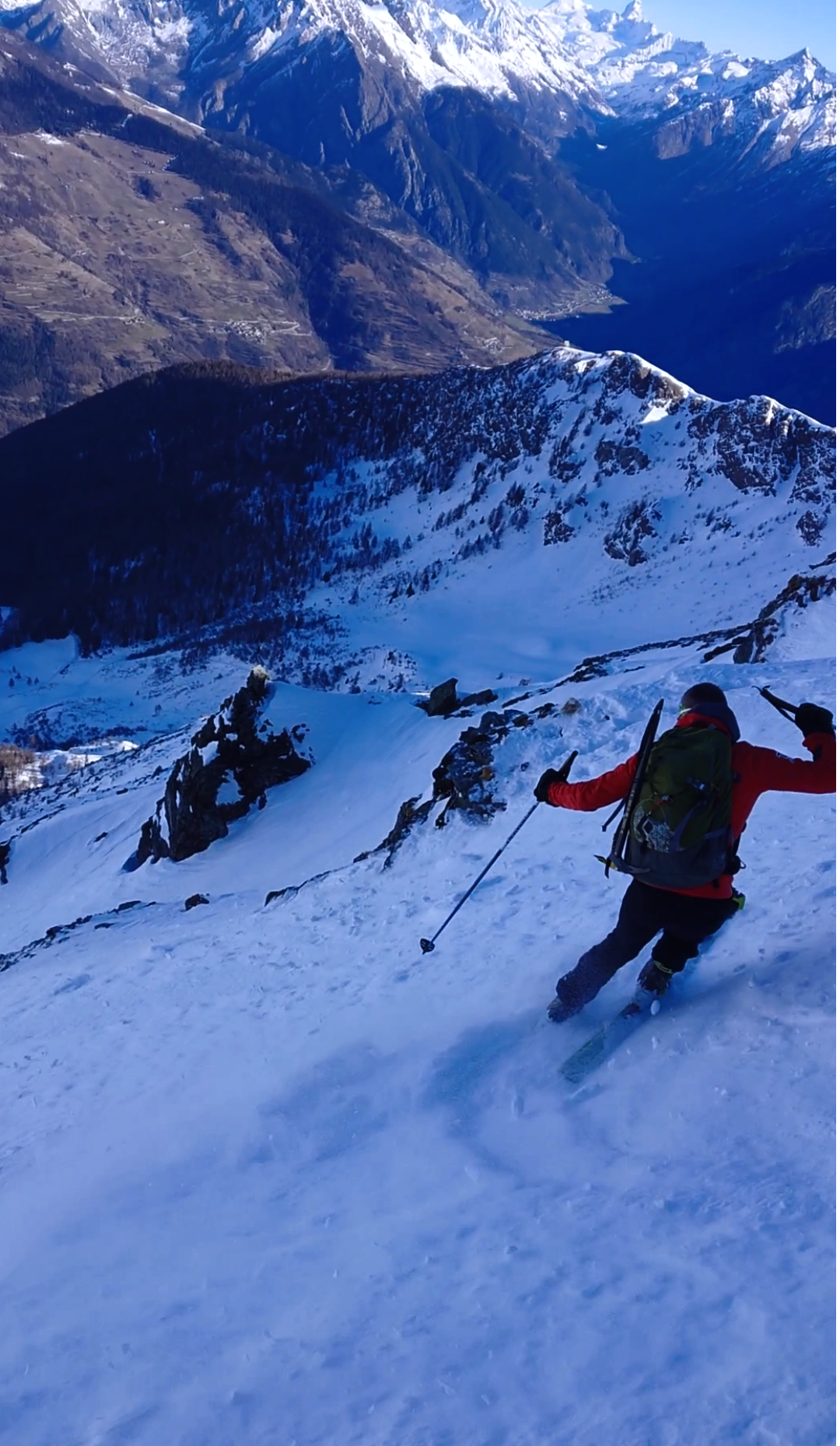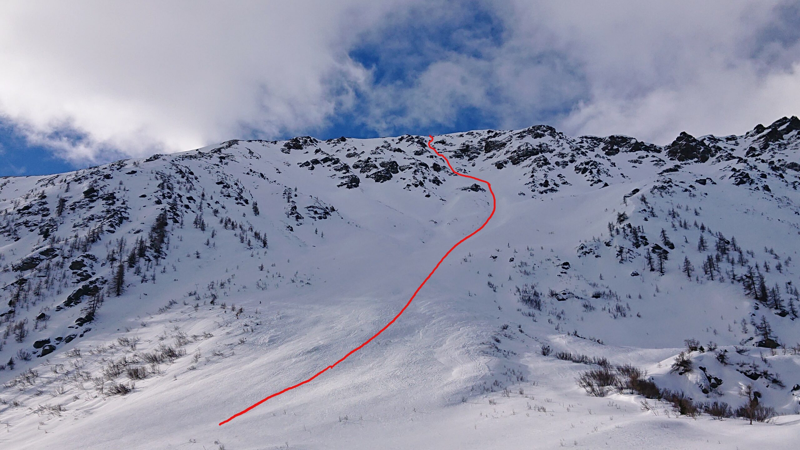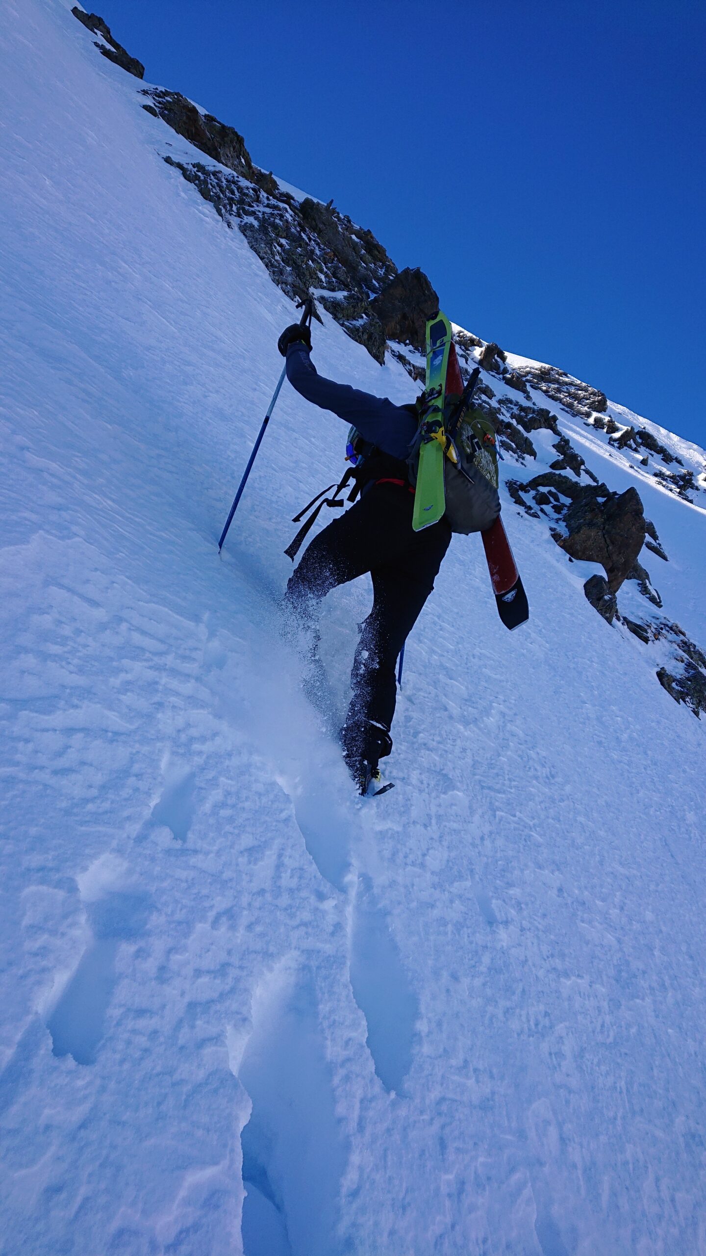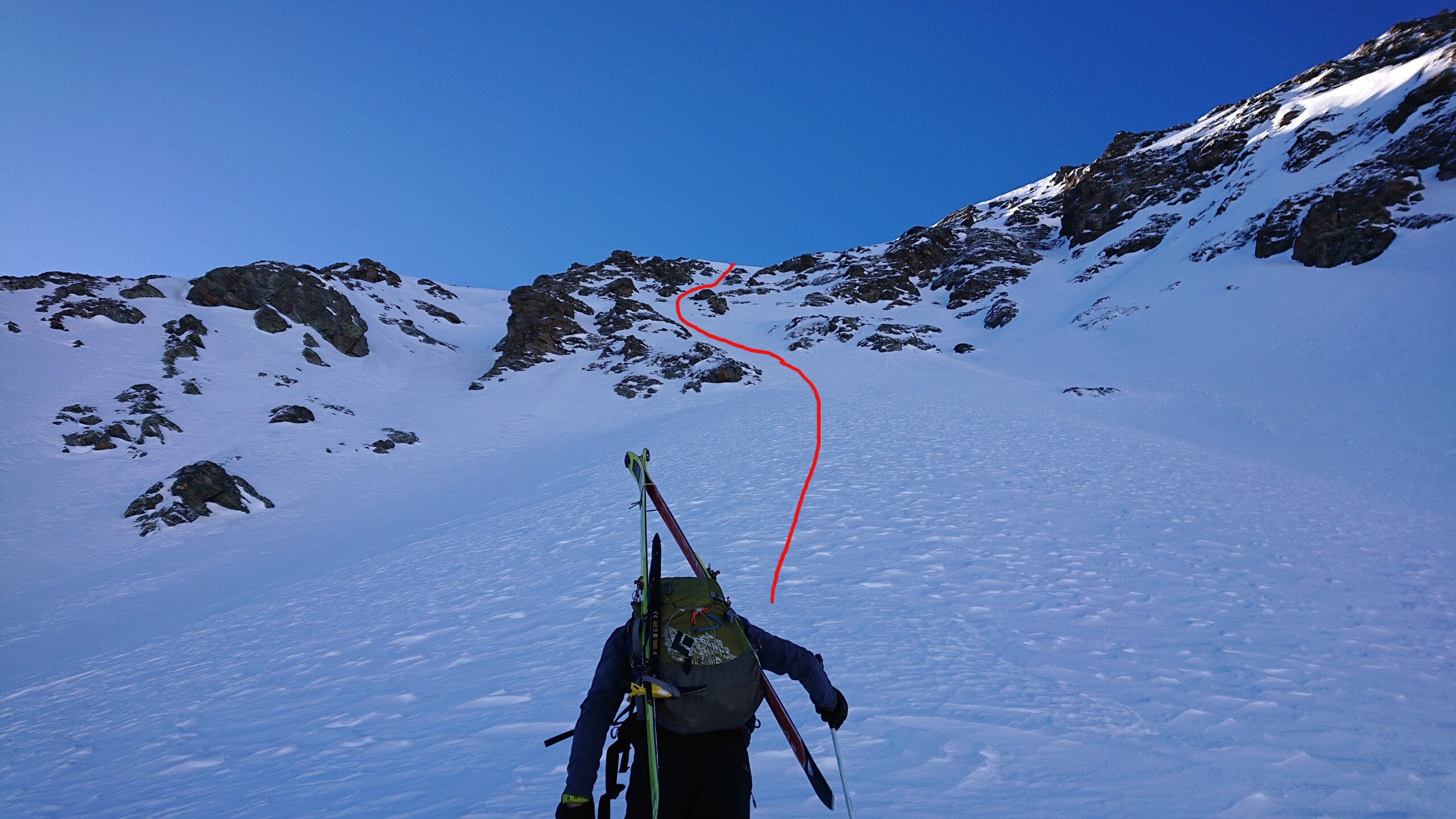 Appena si entra nel vallone d’Ars si vede subito l’ampio e regolare pendio da risalire, il primo dopo quello che porta al colle Tardiva. Si punta ad un evidente isolotto roccioso nel bel mezzo del pendio in alto, si sale con gli sci sino dove è possibile e poi si aggira sulla destra l’isolotto roccioso. Dopo diventa abbastanza intuibile la linea da seguire per uscire dalla parete anche se dal basso non è così evidente. In questo ultimo tratto le pendenze sono sempre sui 45°. Appena si esce si vede la vetta a cui mancano una sessantina di metri su pendii più dolci.