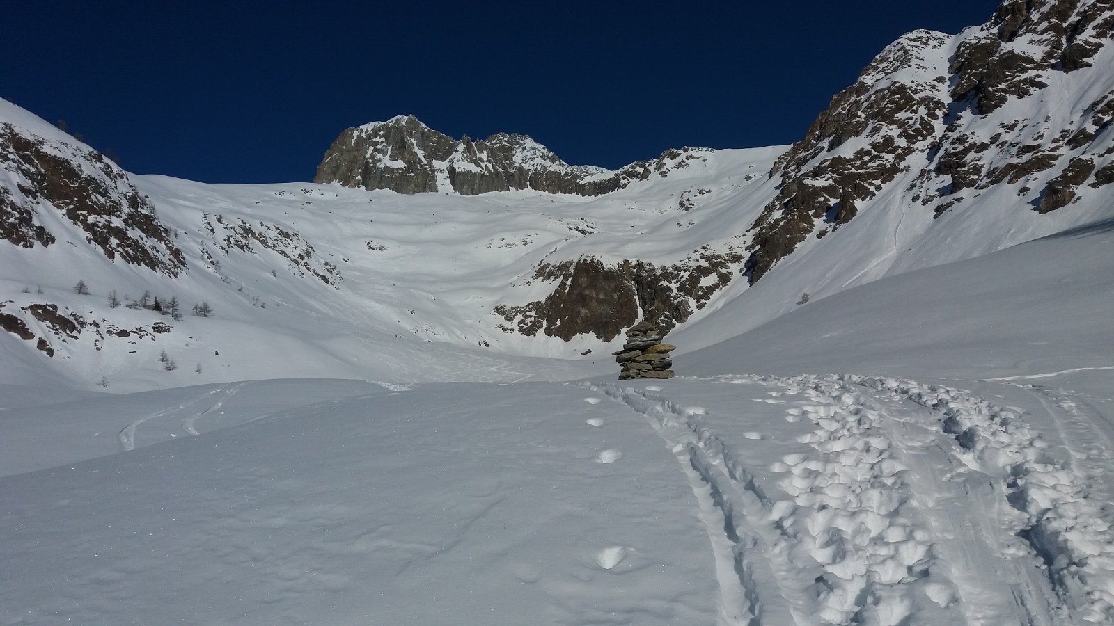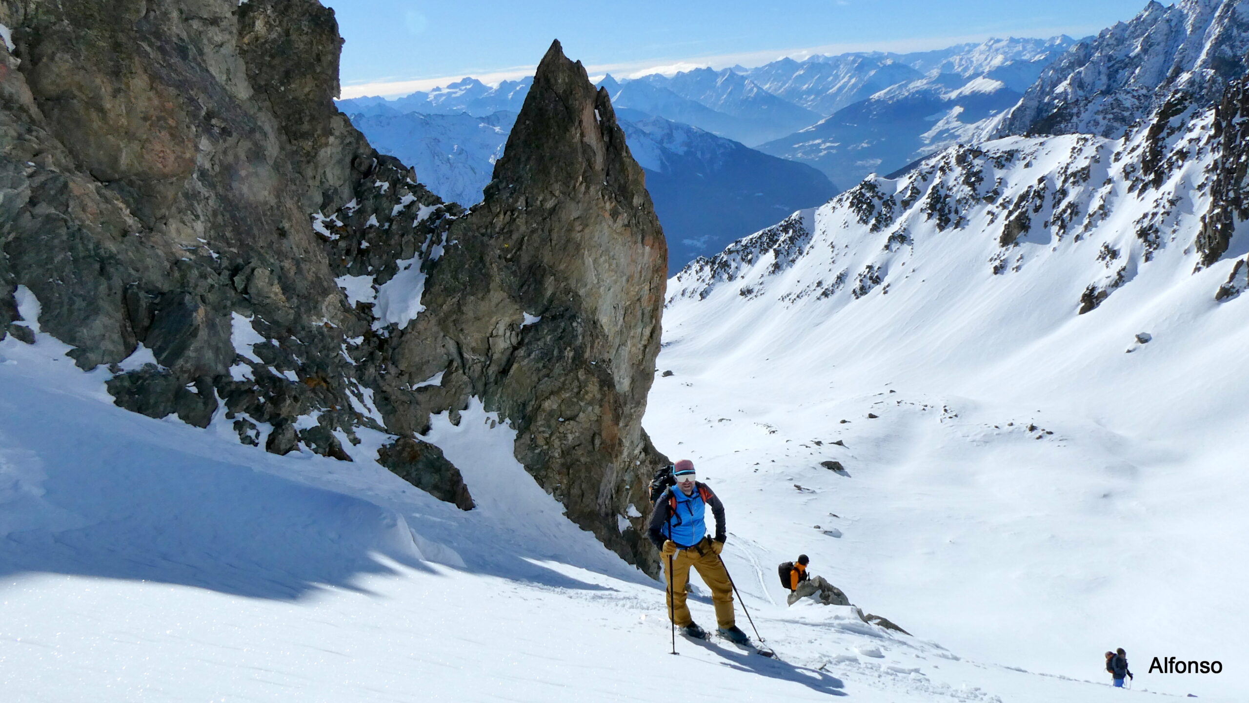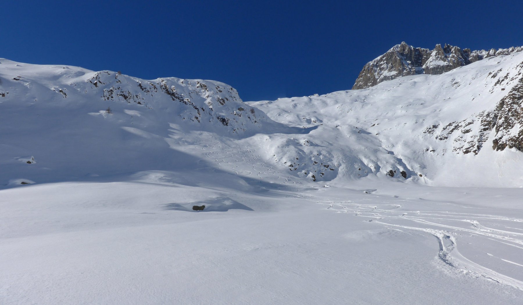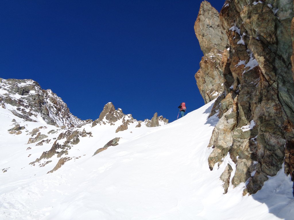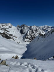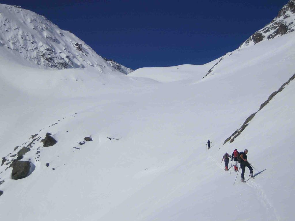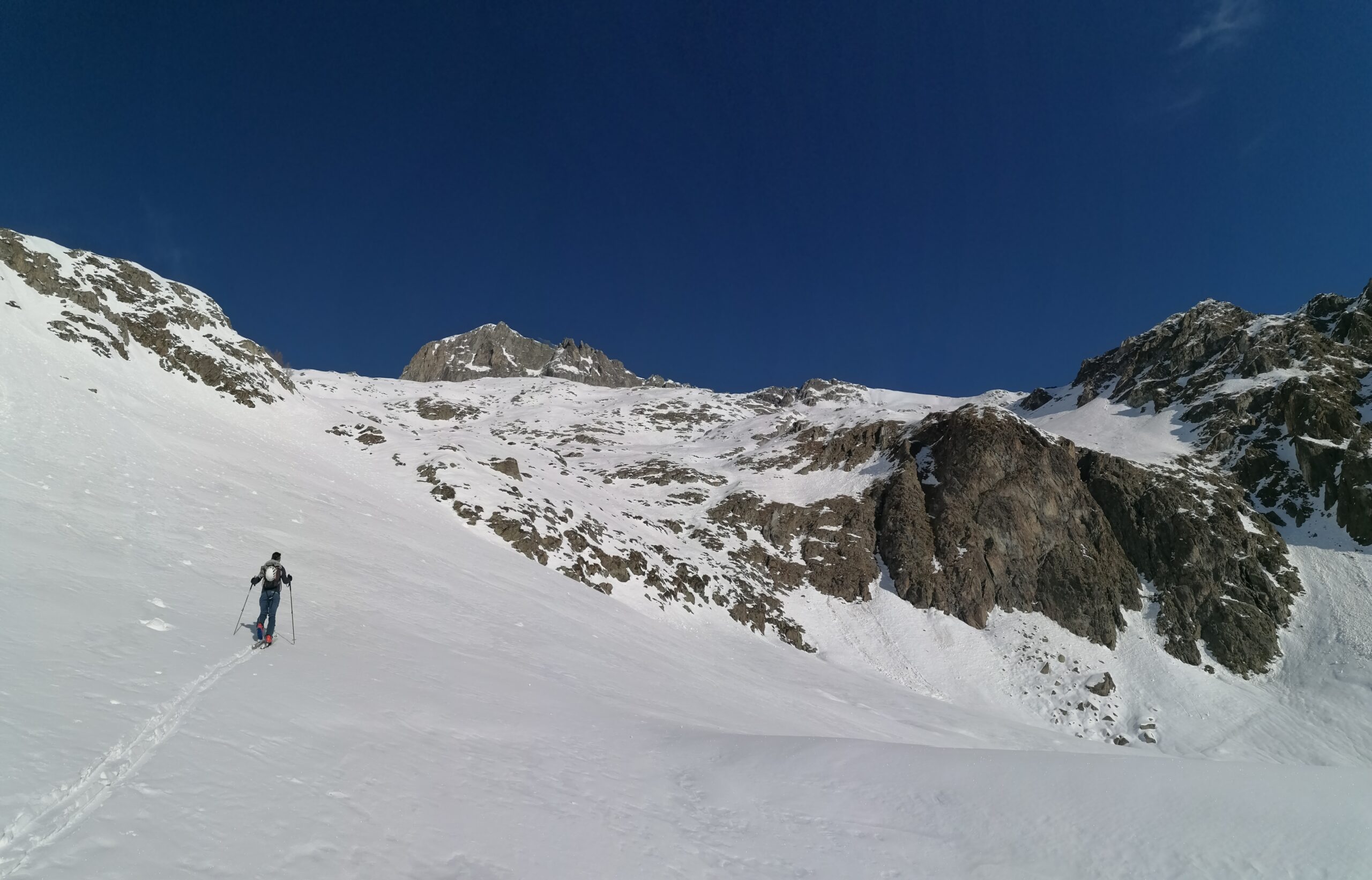 Si prosegue per dossi e pendii poco inclinati e aperti, puntando alla dorsale di sinistra che separa due valloni. Raggiunta la dorsale la si percorre oppure si risale il pendio di destra, per proseguire passando sotto le pareti sud della Tour de la Tsa.