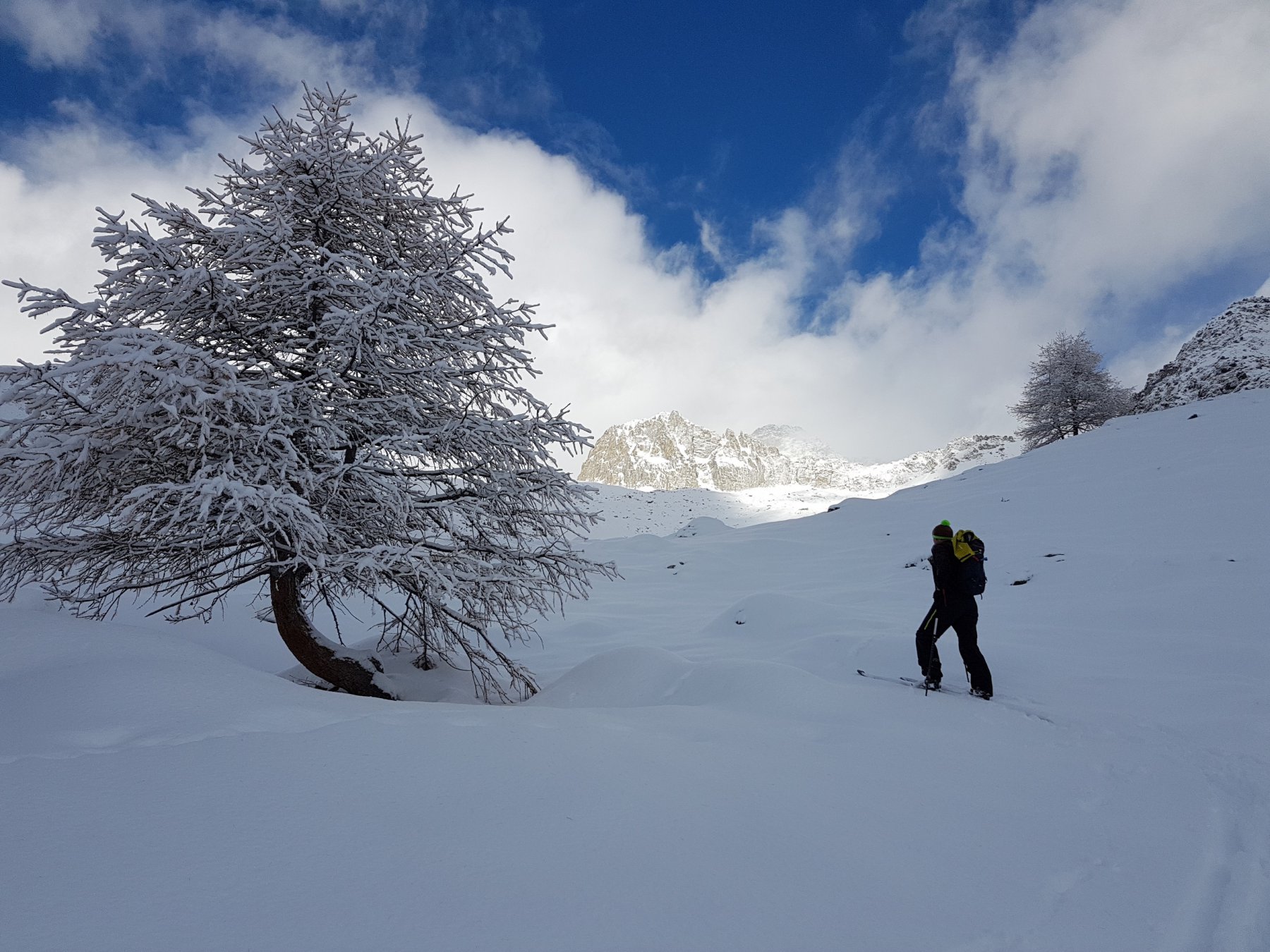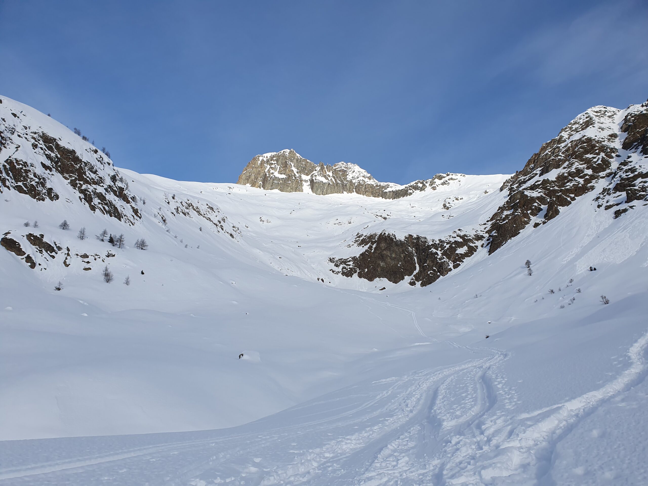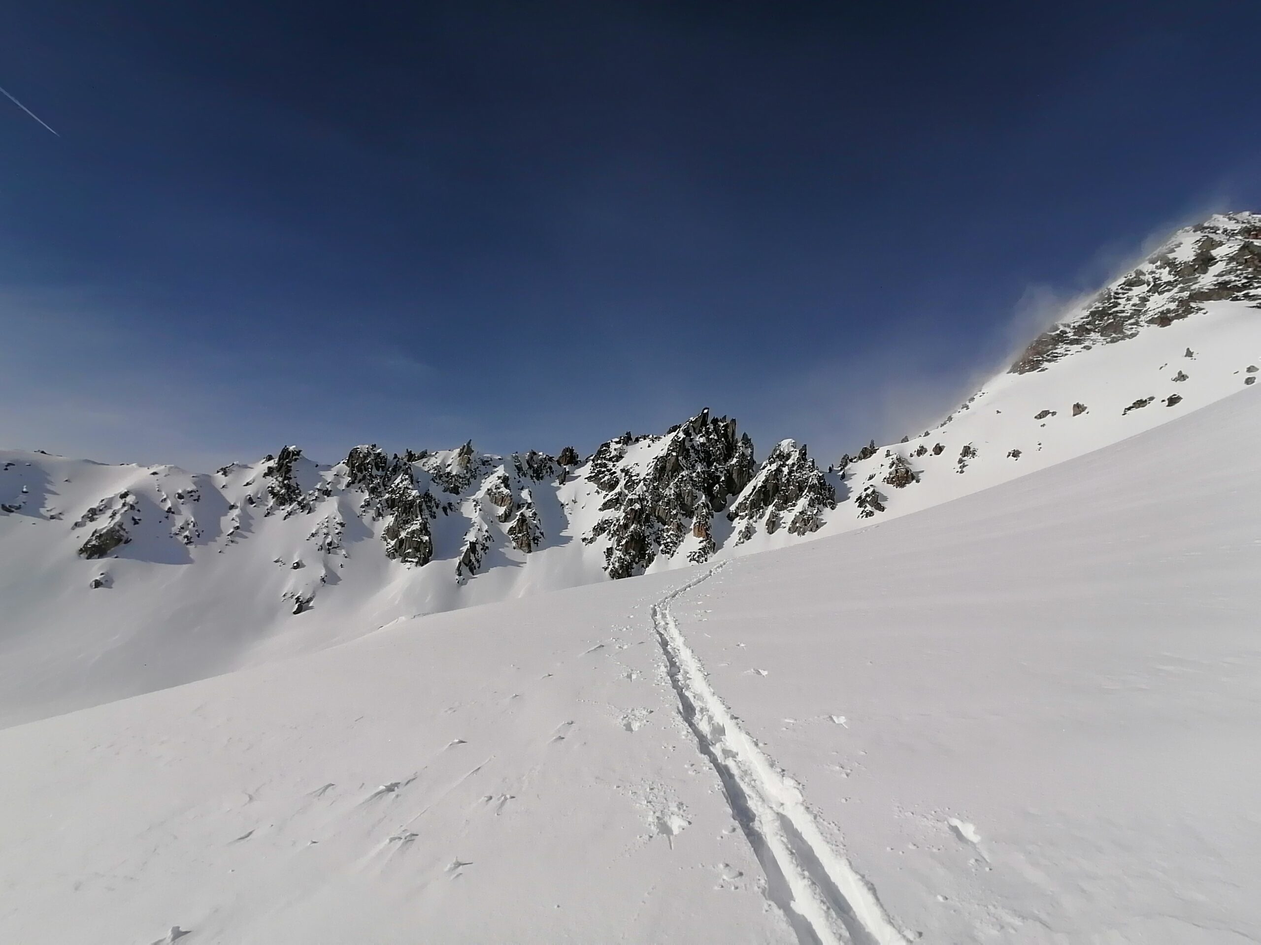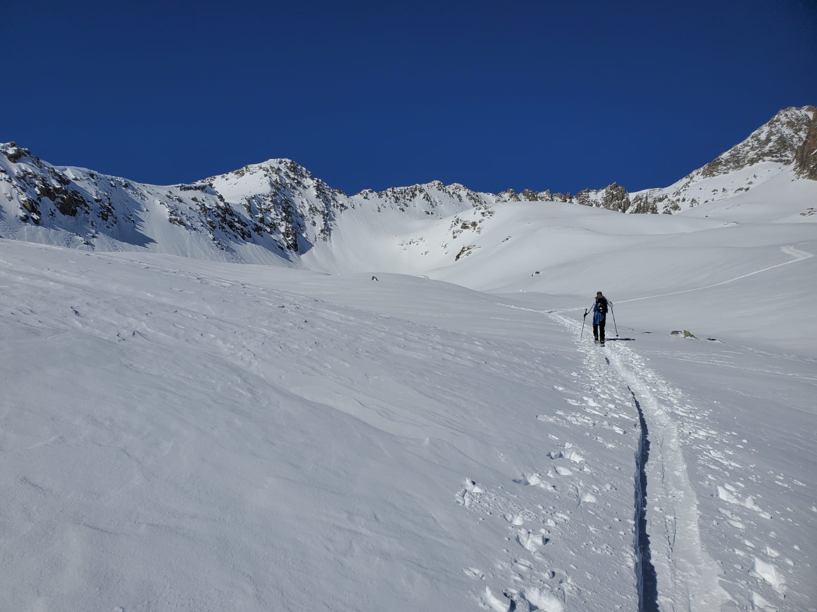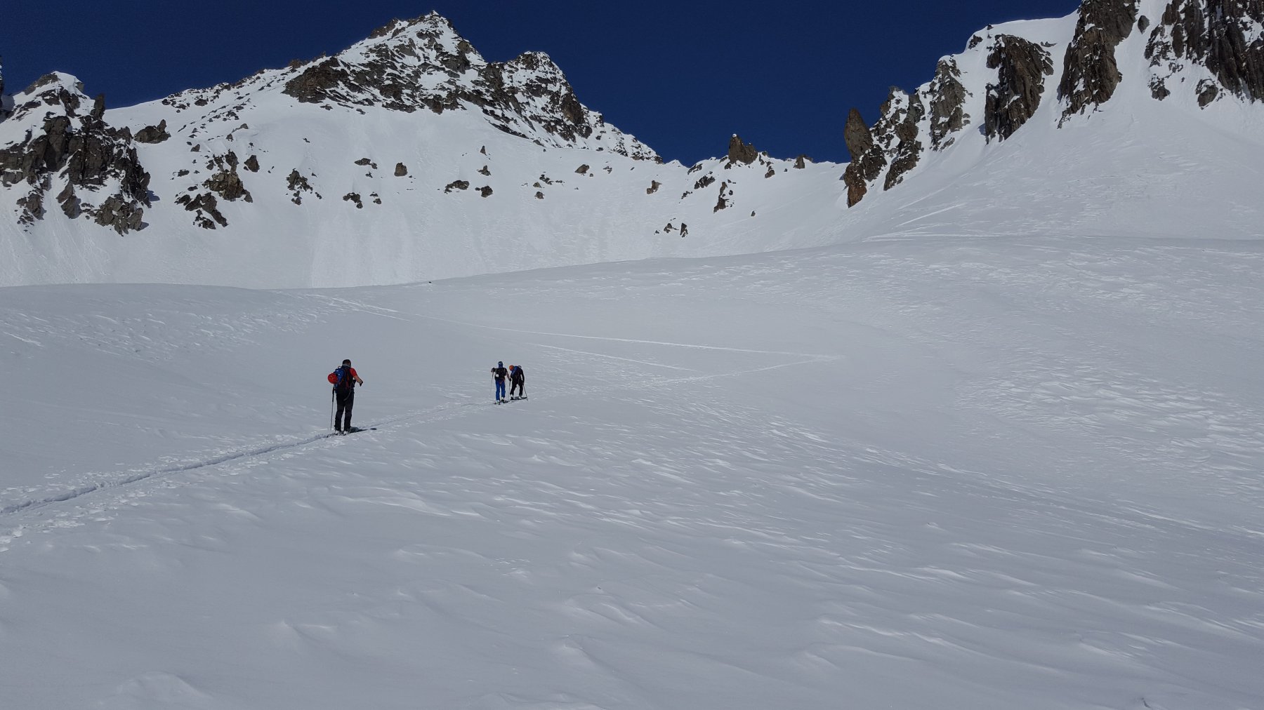Si prosegue per dossi e pendii poco inclinati e aperti, puntando alla dorsale di sinistra che separa due valloni. Raggiunta la dorsale la si percorre oppure si risale il pendio di destra, per proseguire passando sotto le pareti sud della Tour de la Tsa.