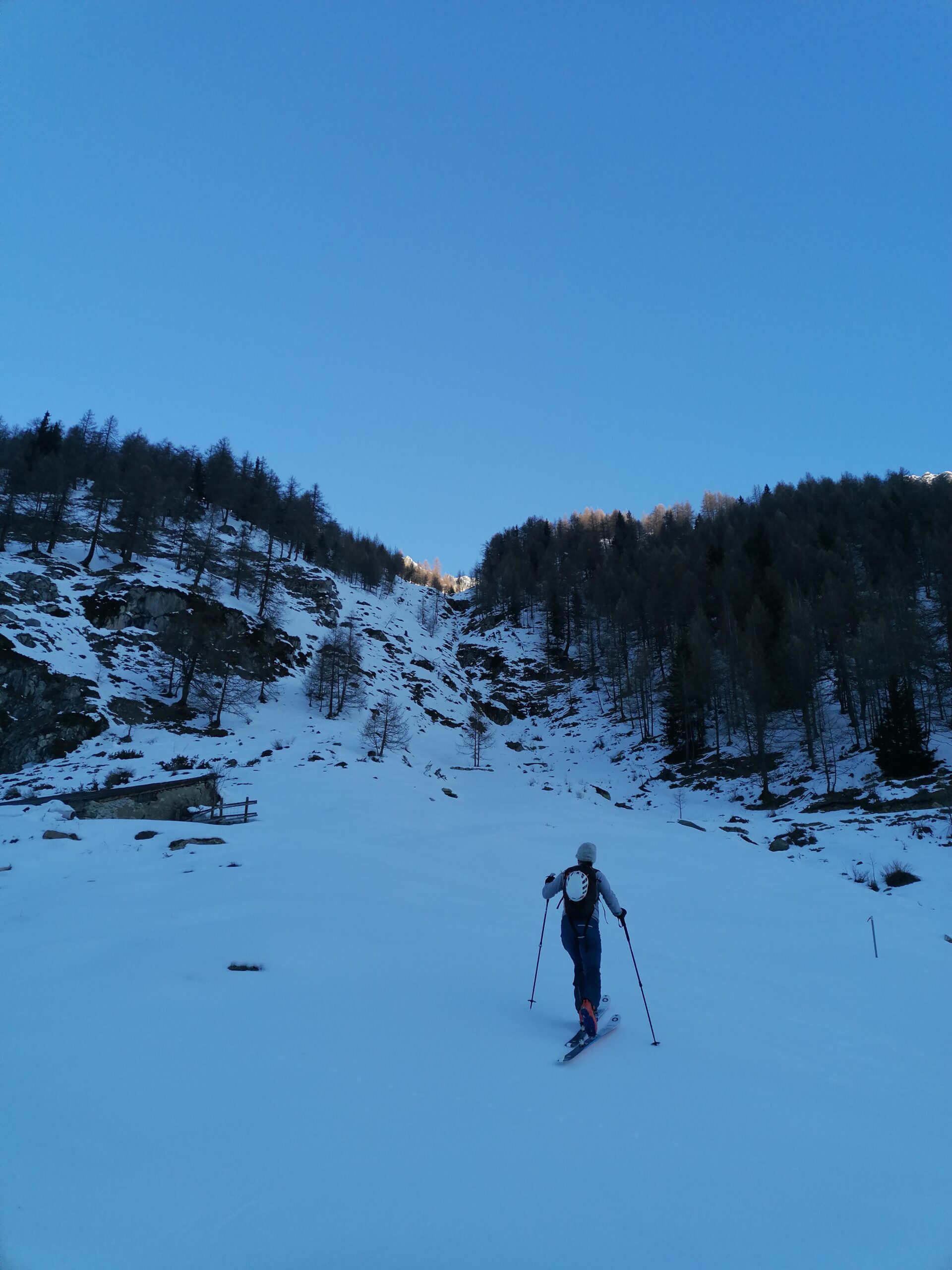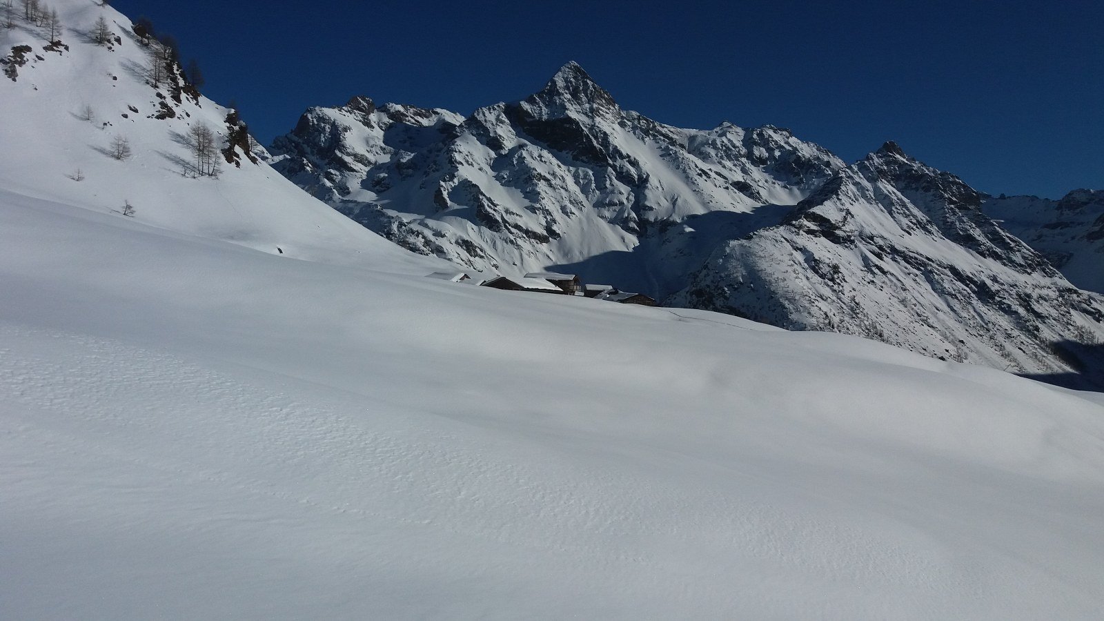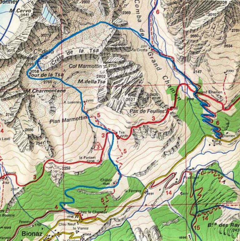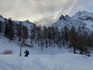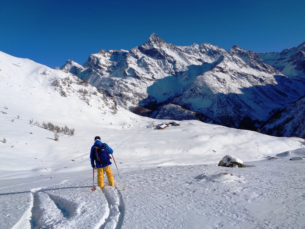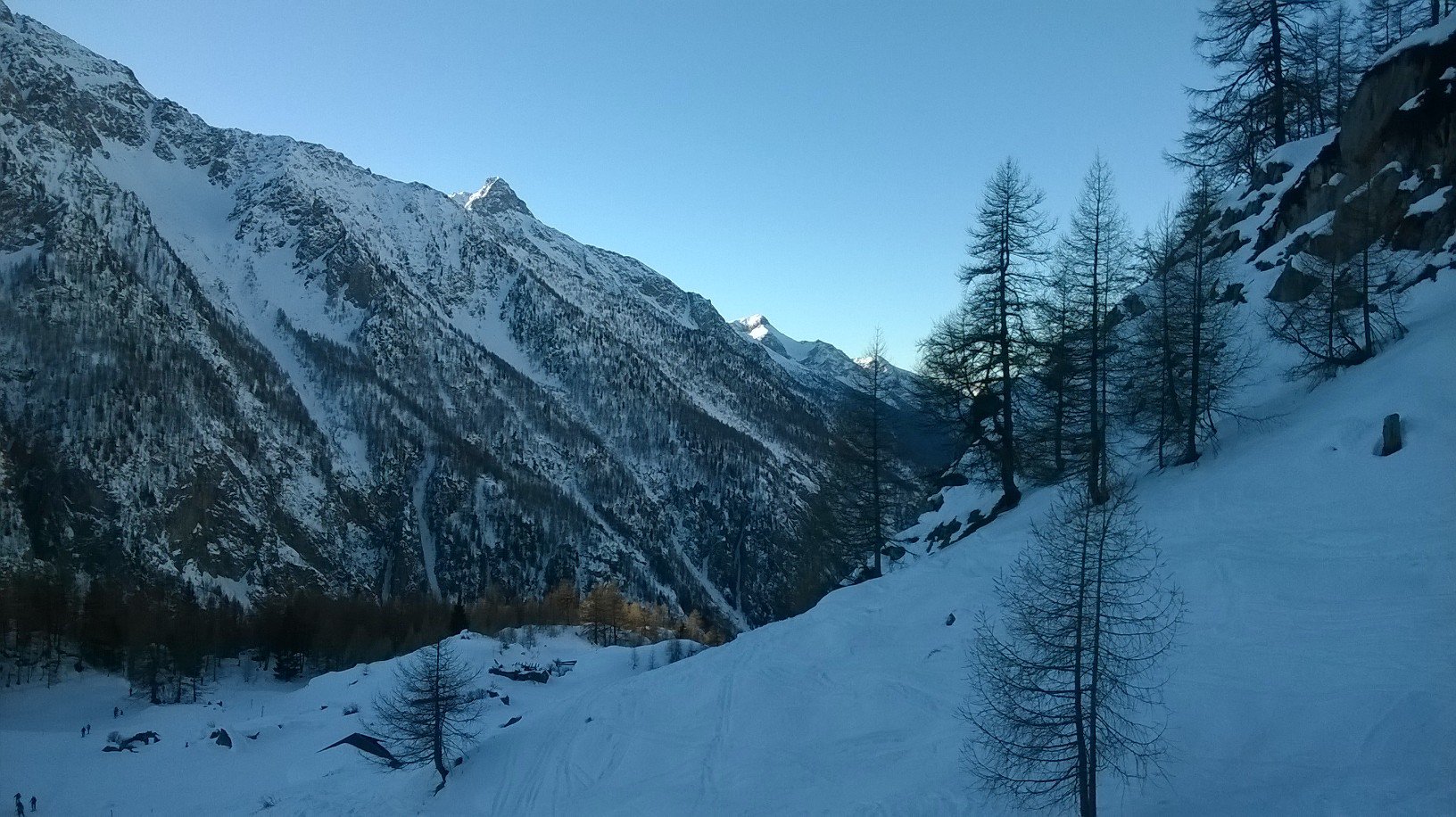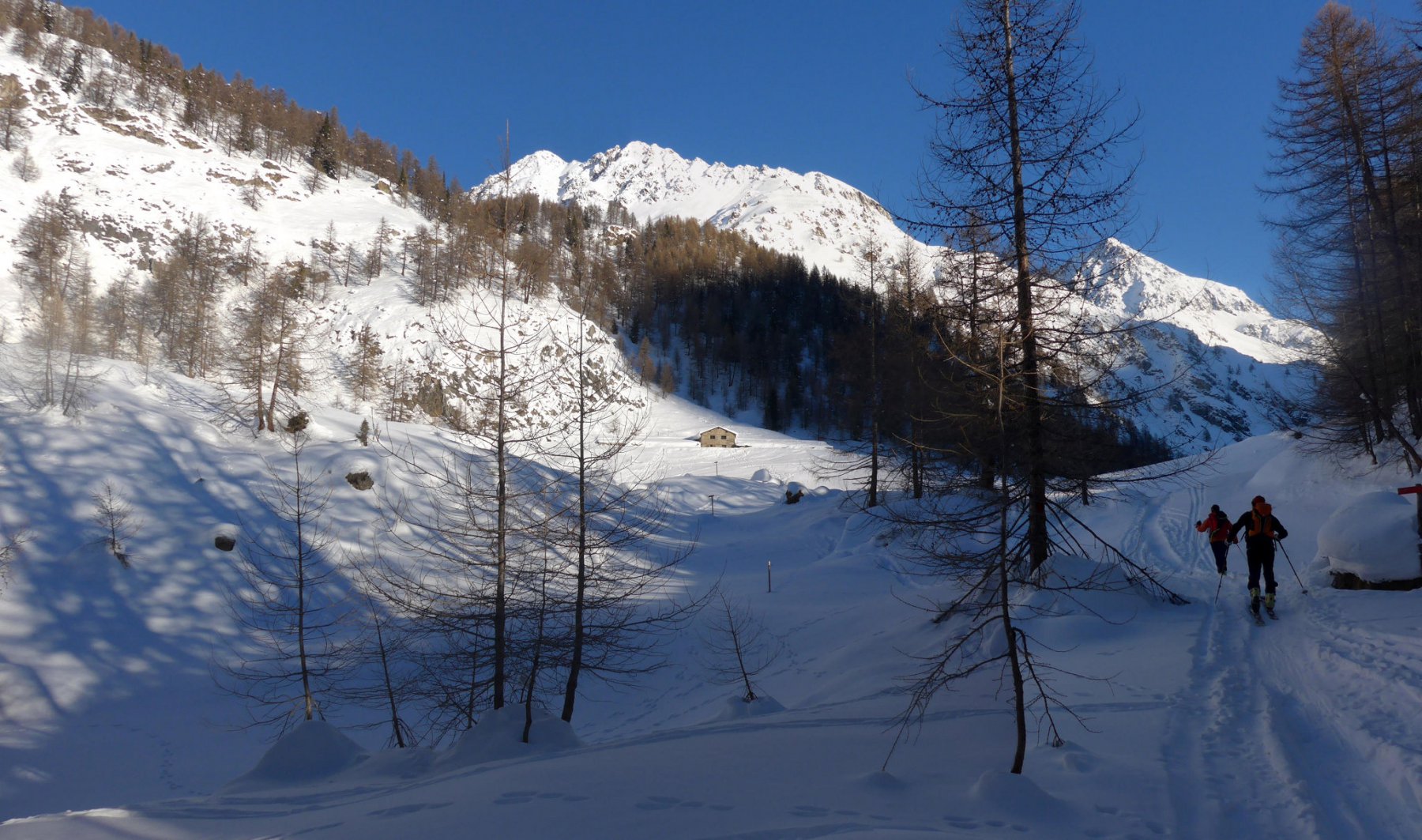 A sinistra dell’ultima baita, si inizia a salire nel ripido bosco di grossi larici, cercando di seguire la traccia del sentiero estivo che compie numerose serpentine, evitando i tratti più ripidi. Terminato il bosco si raggiunge il bellissimo anfiteatro con a destra su un dosso gli alpeggi di la Tsa 2245 m (o Tsa de Fontaney).