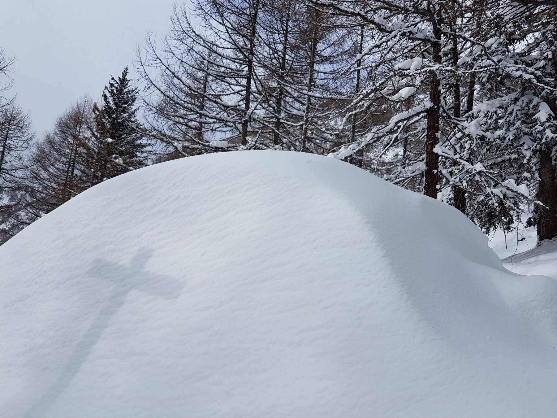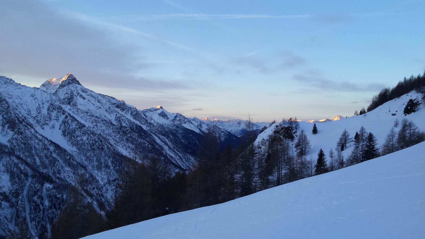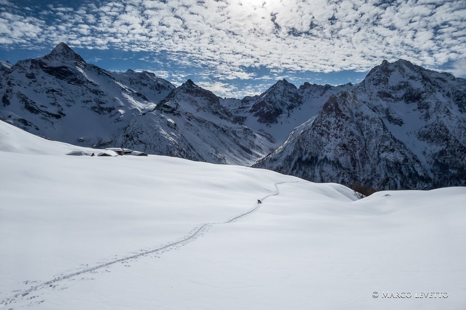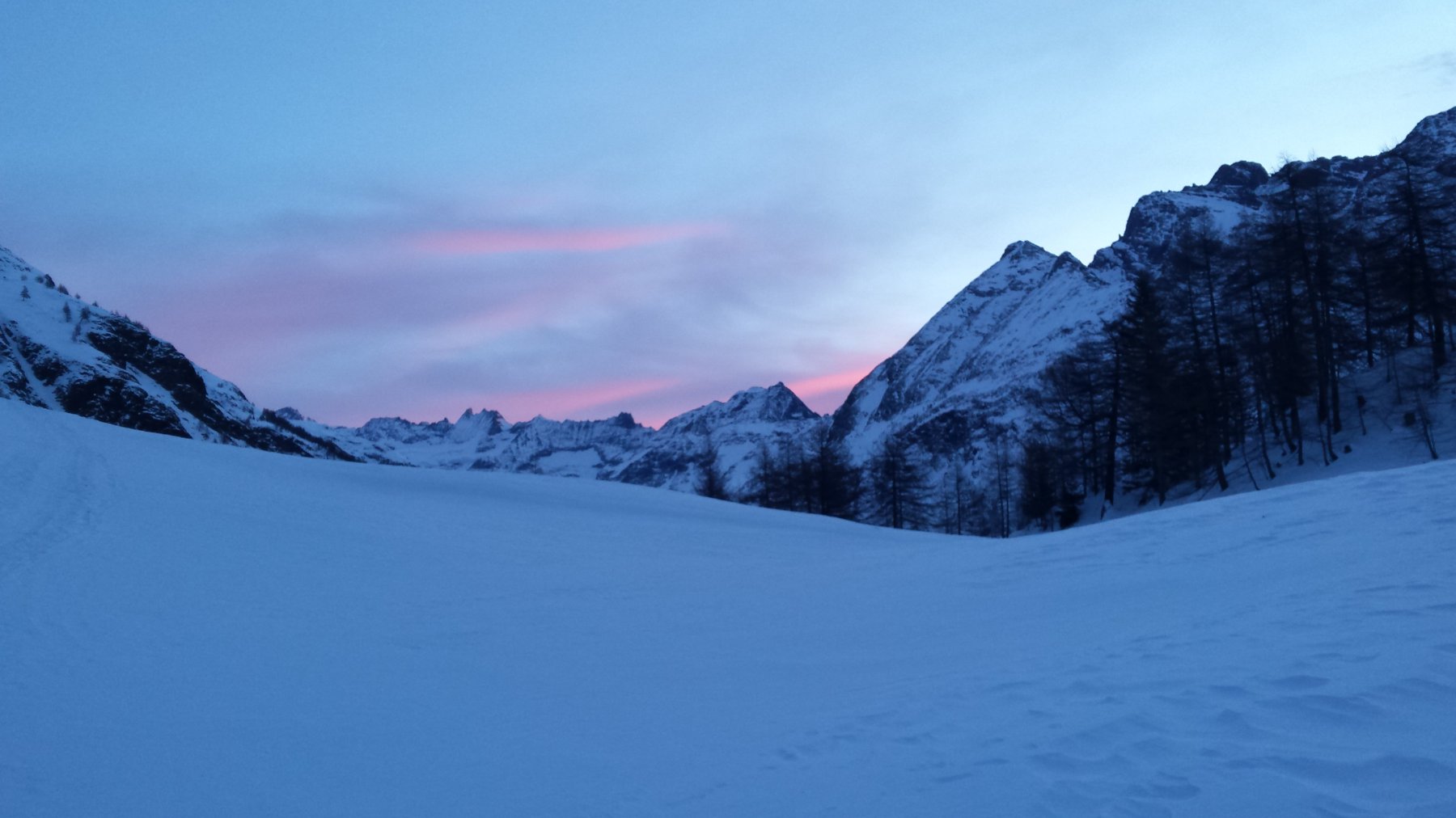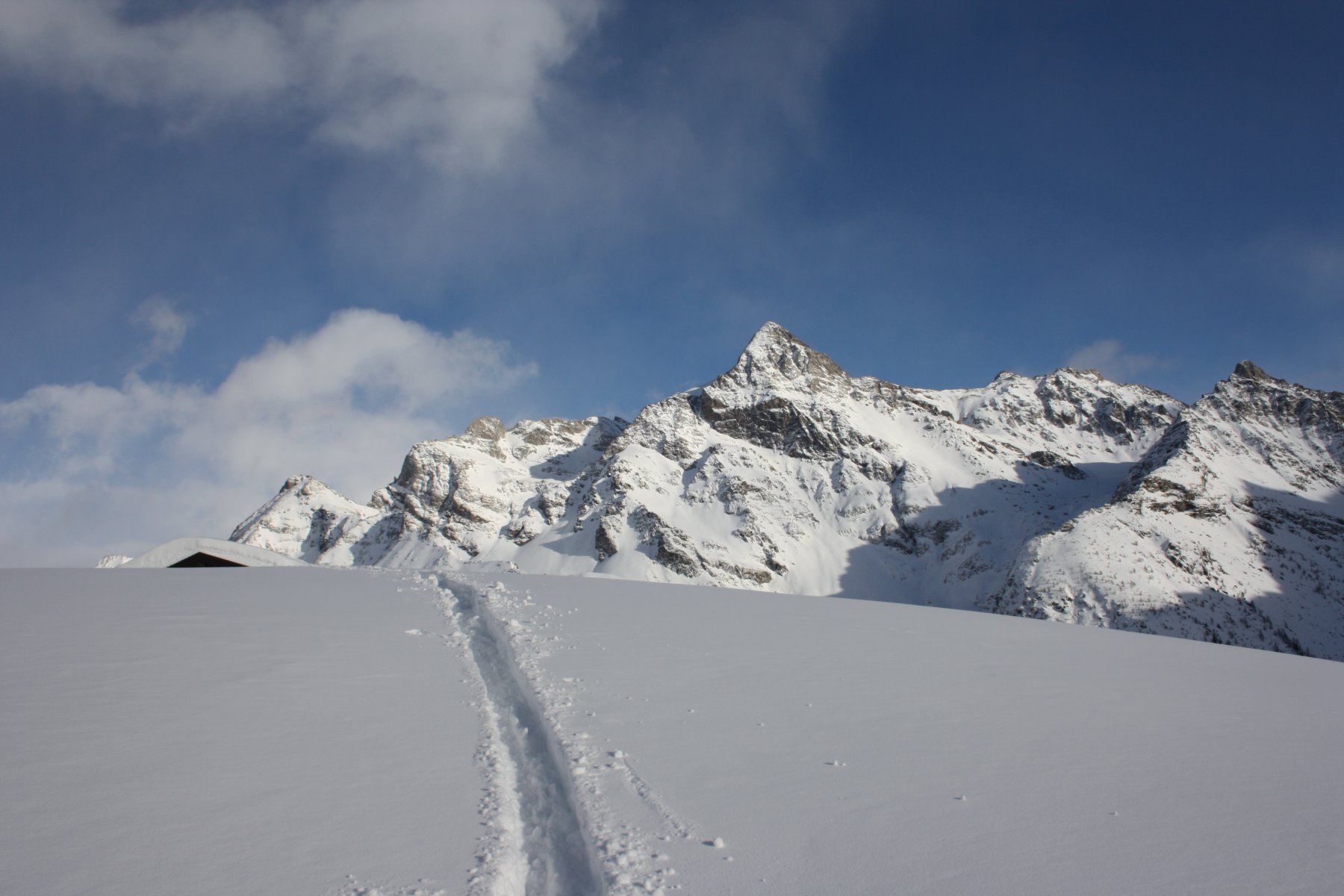 A sinistra dell’ultima baita, si inizia a salire nel ripido bosco di grossi larici, cercando di seguire la traccia del sentiero estivo che compie numerose serpentine, evitando i tratti più ripidi. Terminato il bosco si raggiunge il bellissimo anfiteatro con a destra su un dosso gli alpeggi di la Tsa 2245 m (o Tsa de Fontaney).