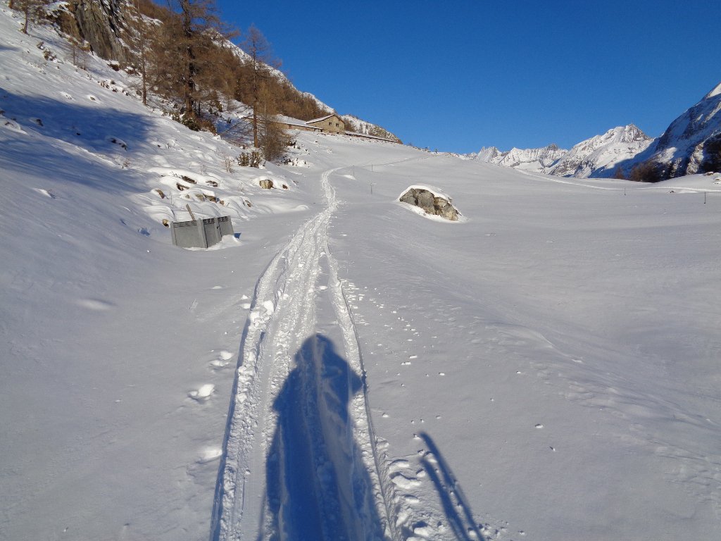 La discesa si può effettuare per lo stesso percorso di salita (esposizione sud), oppure facendo un giro ad anello verso Chamen, scendendo dal Vallone della Sassa: scendere per l’alternanza di pendii più o meno sostenuti fino alla confluenza del vallone che sale verso il colle di Sassa. Raggiungere il tracciato dell’interpoderale sul lato sinistro orografico e seguirla (con tagli a piacere nella zona a tornanti) fino a Chamen. Da qui si dovrà rientrare al Chez les Chenaux seguendo la strada dell’alta Valpelline per circa 3 km.