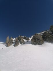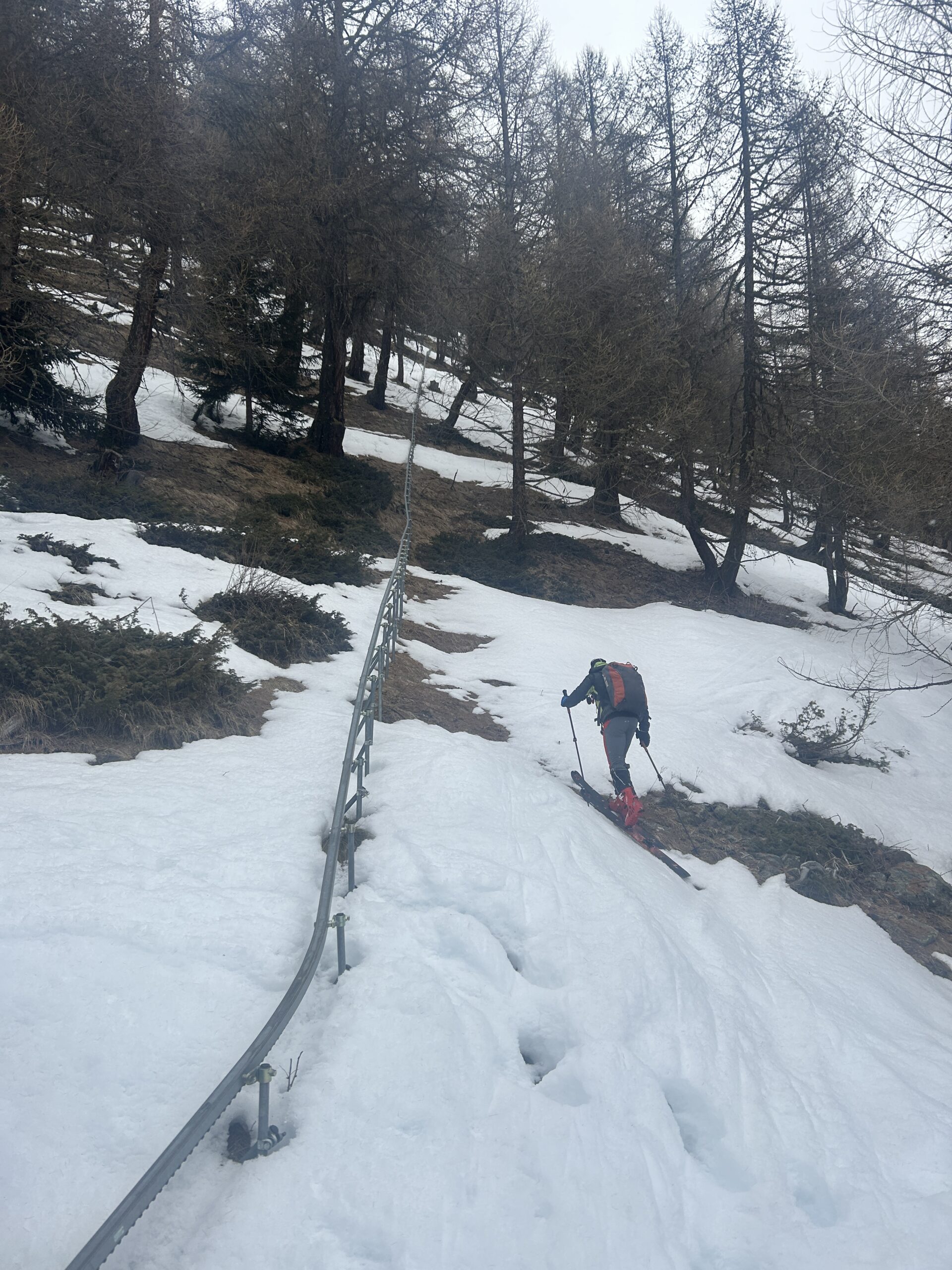 A questo punto appare evidente la balza rocciosa che precede il Pian Marmottin, la si supera generalmente sulla sinistra per un breve ma ripido pendio e poi traversando sotto una piccola paretina, oppure al centro in una sorta di canalino fra barriere rocciose.