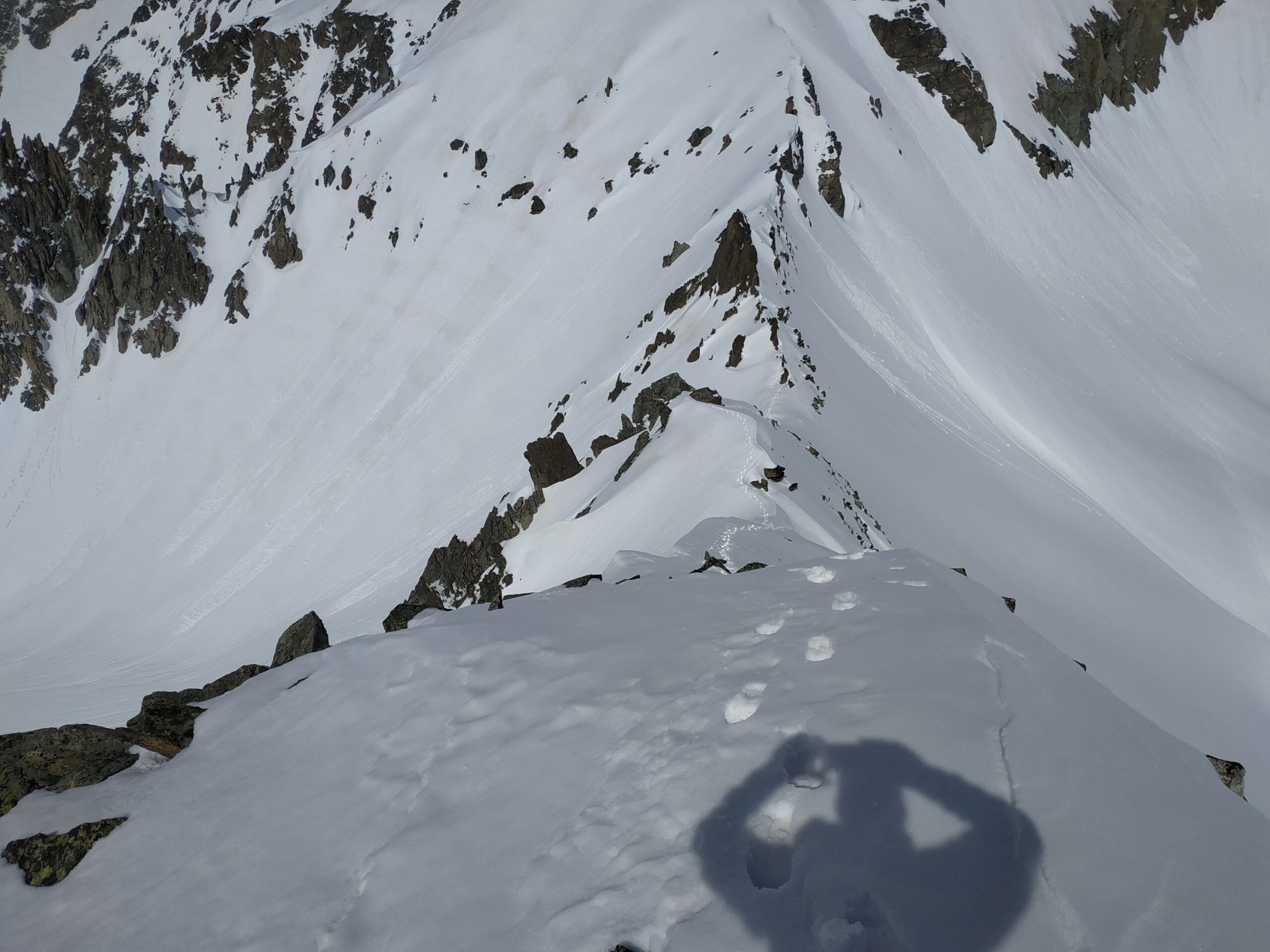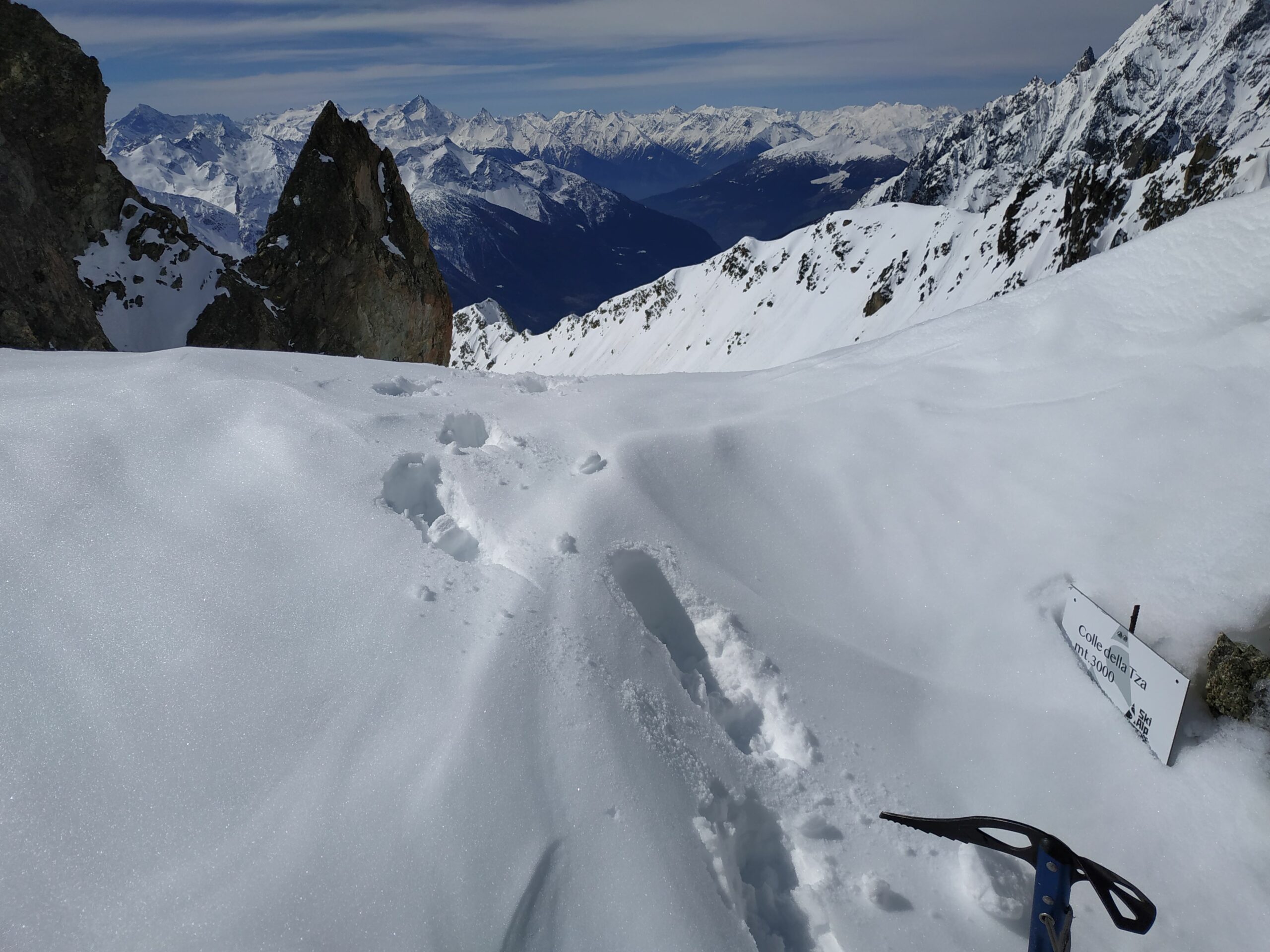 Calzato le ciaspole a quota 2000 e tenute fino a 50 m sotto il colle. Poi calzati i ramponi e tracciato su cresta intonsa facendo attenzione alle evidenti cornici. Trovato neve di tutti i tipi, essendo vari e numerosi i contesti e le esposizioni, avendo percorso l’anello con discesa su Chamen. In salita è andata abbastanza bene, ricalcando un po’ il sentiero estivo delle mappe e un po’ una traccia GPS di skialp. Invece in discesa è stato un delirio: la neve mollava vistosamente causa scarso rigelo e si faticava sia con le ciaspole che coi ramponi. Lo zero termico a 4k non perdona: di questo passo, gite come questa, si dovranno gestire come le uscite su ghiacciaio con partenza in piena notte alla luce delle frontali, in modo da poter scendere presto con neve ancora decente. Nessuno in giro, visto solo vecchie tracce verso i primi alpeggi dei rispettivi valloni. Allego traccia GPS dell’anello.