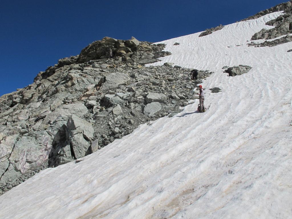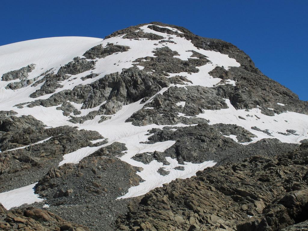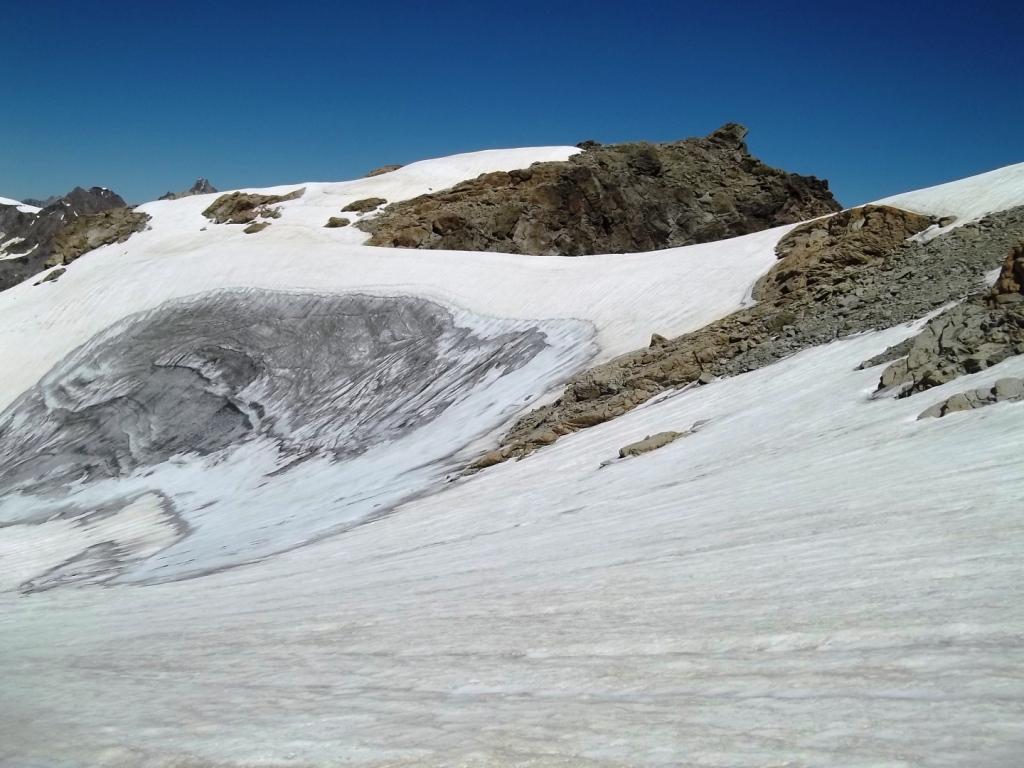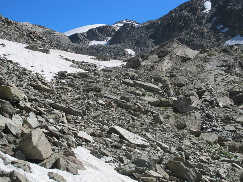 Dal colle volgere a dx e risalire più o meno diagonalmente l’ultimo lembo del ghiacciaio di Chavacour in direzione NE superando o aggirando qualche affioramento roccioso. Si giunge così ad una costola rocciosa dalla quale si accede alla cresta che culmina verso S con le Pointes de Chavacour: risalirla per ripida pietraia (qualche ometto) e volgere a dx, continuando su pietraia in falsopiano sino ad arrivare di fronte all’anticima S del Dome.