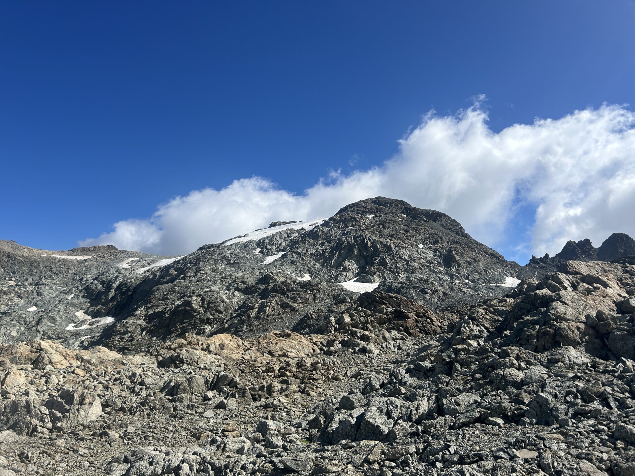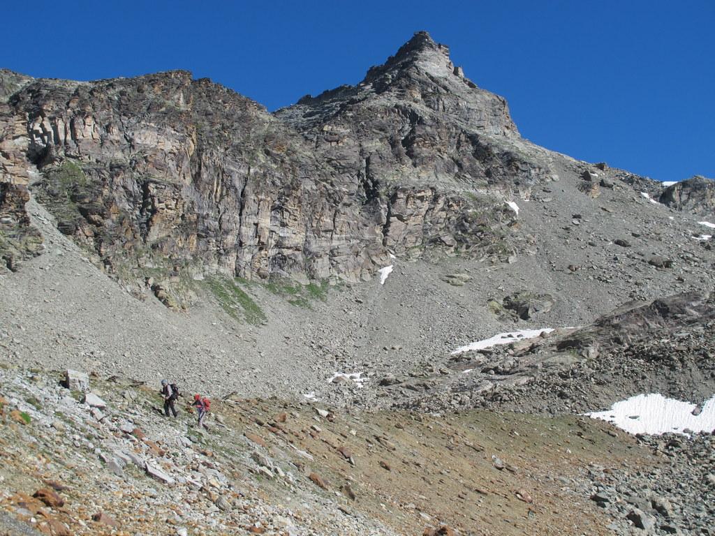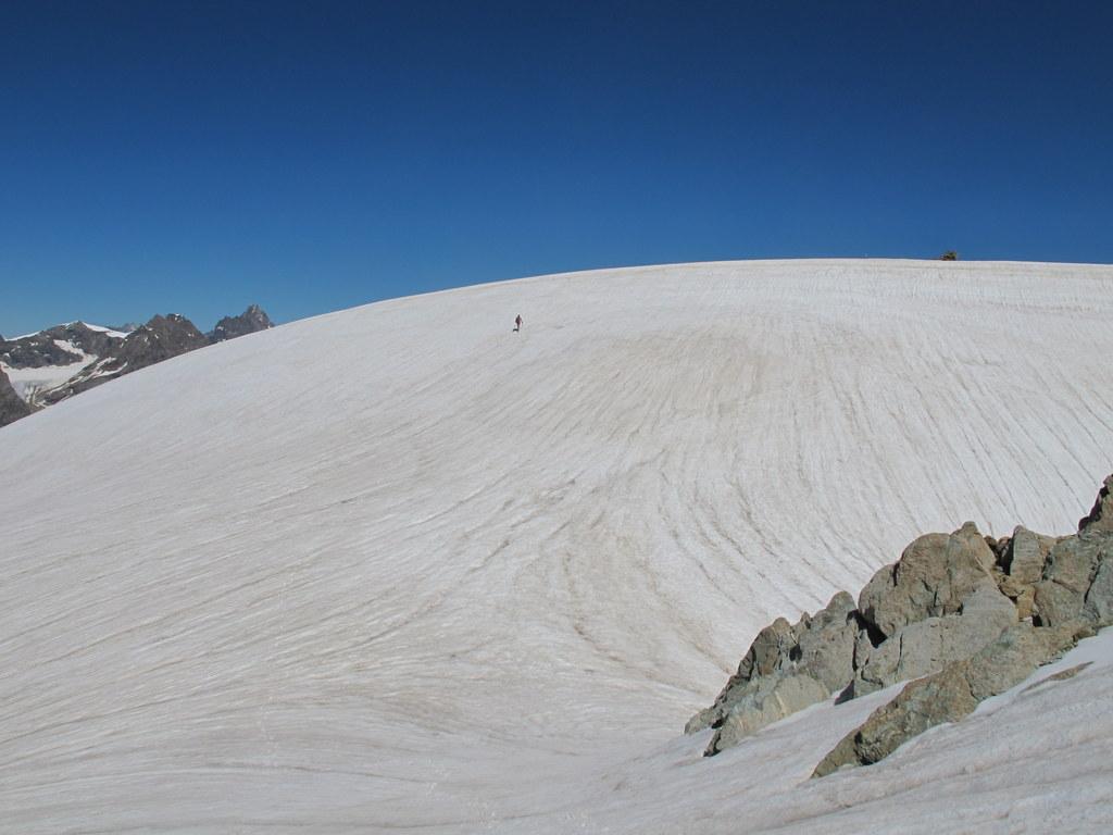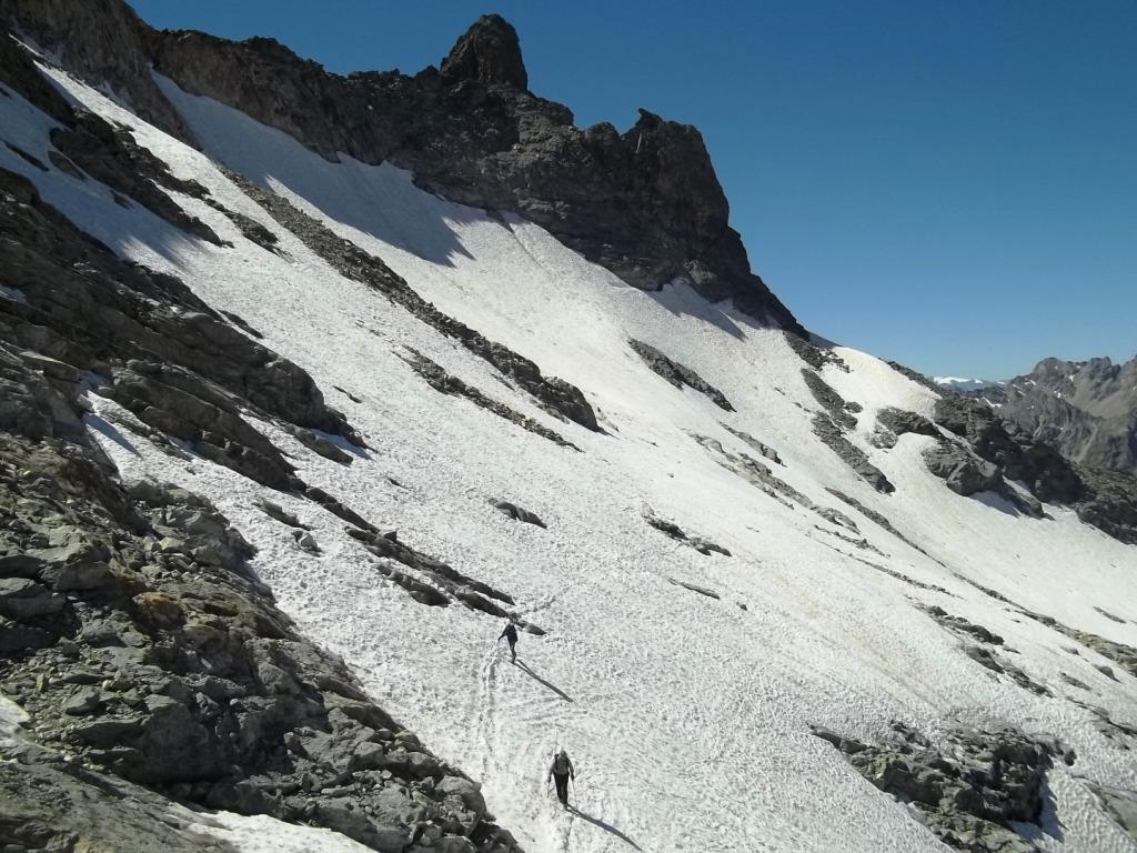 Dal colle volgere a dx e risalire più o meno diagonalmente l’ultimo lembo del ghiacciaio di Chavacour in direzione NE superando o aggirando qualche affioramento roccioso. Si giunge così ad una costola rocciosa dalla quale si accede alla cresta che culmina verso S con le Pointes de Chavacour: risalirla per ripida pietraia (qualche ometto) e volgere a dx, continuando su pietraia in falsopiano sino ad arrivare di fronte all’anticima S del Dome.