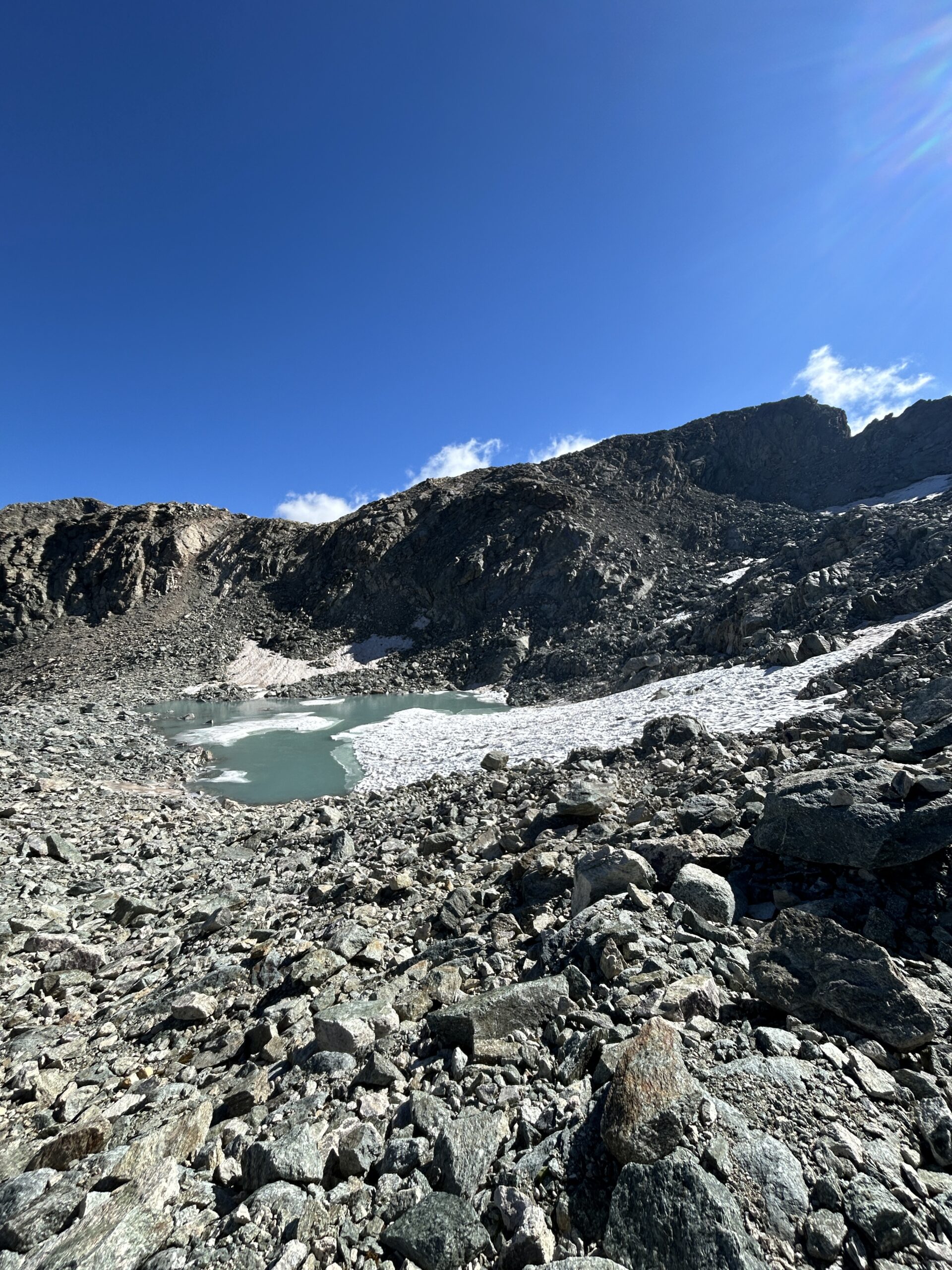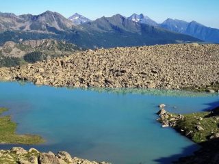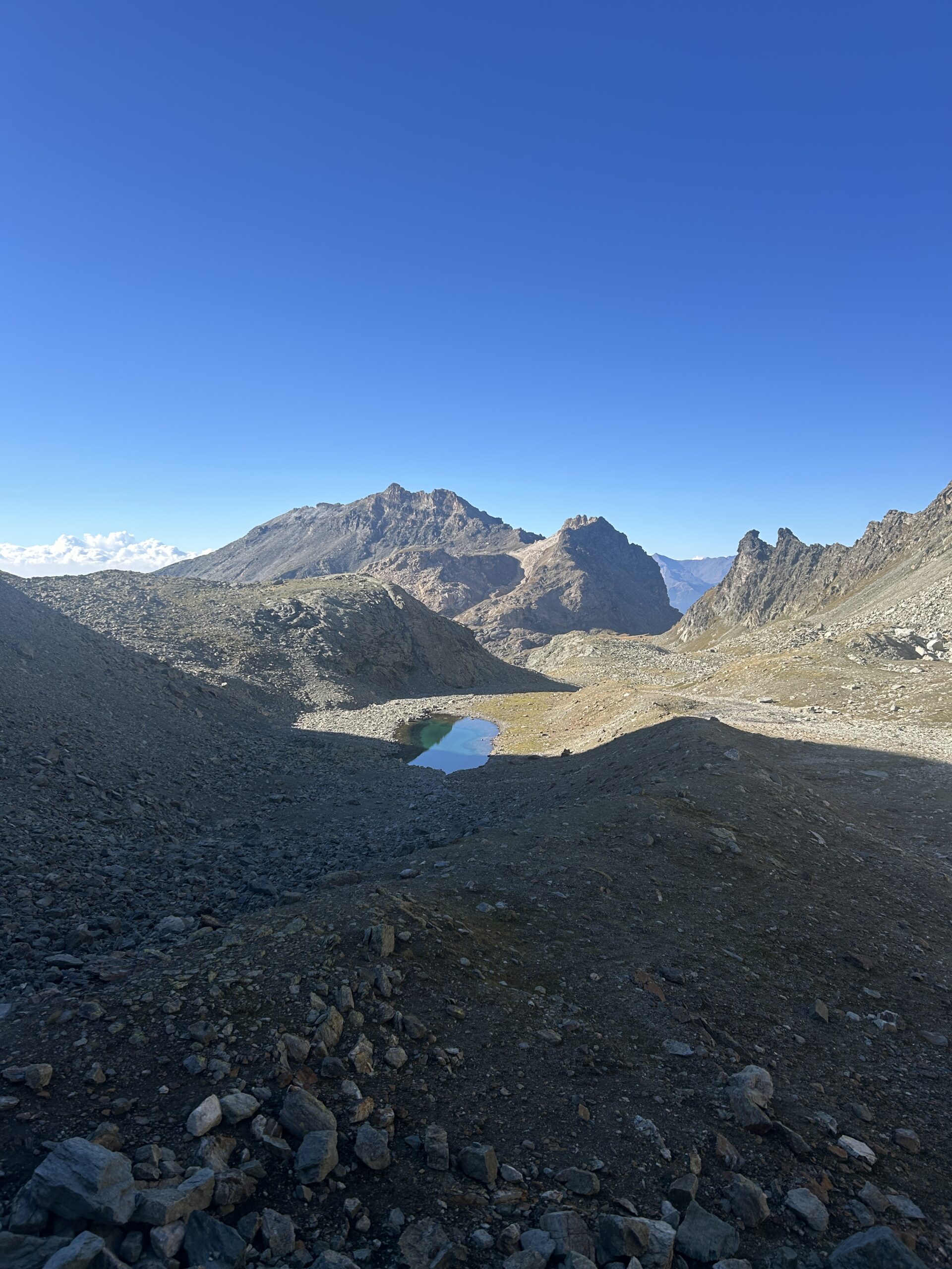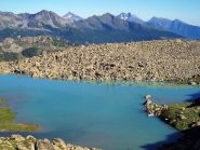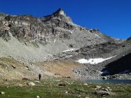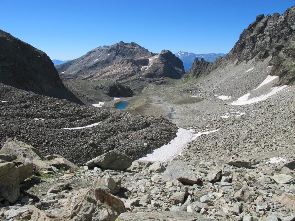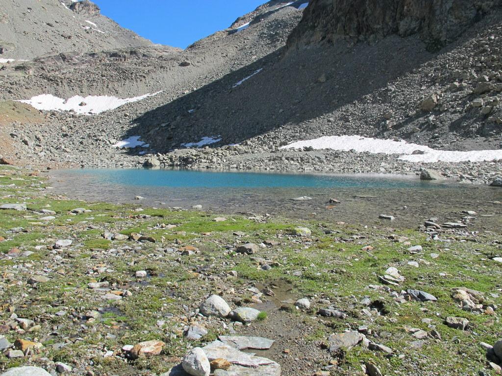 Proseguire intorno al lago fino ad incrociare e a seguire l’Alta Via n.1. A 2600 m circa imboccare la Comba de Chavacour voltando a dx e tralasciando l’AV. 1, che prosegue per il Col Fenetre du Tzan (bivio non molto visibile, l’ometto con paletto in legno si trova un po’ scostato dall’Alta Via 1), costeggiare prima in falsopiano un torrentello, poi, dopo averlo guadato, risalire il ripido canale a fianco del corso d’acqua (tacche gialle e ometti). Si raggiunge così un ripiano, a fianco del cordone morenico alle cui spalle è posto uno splendido laghetto.