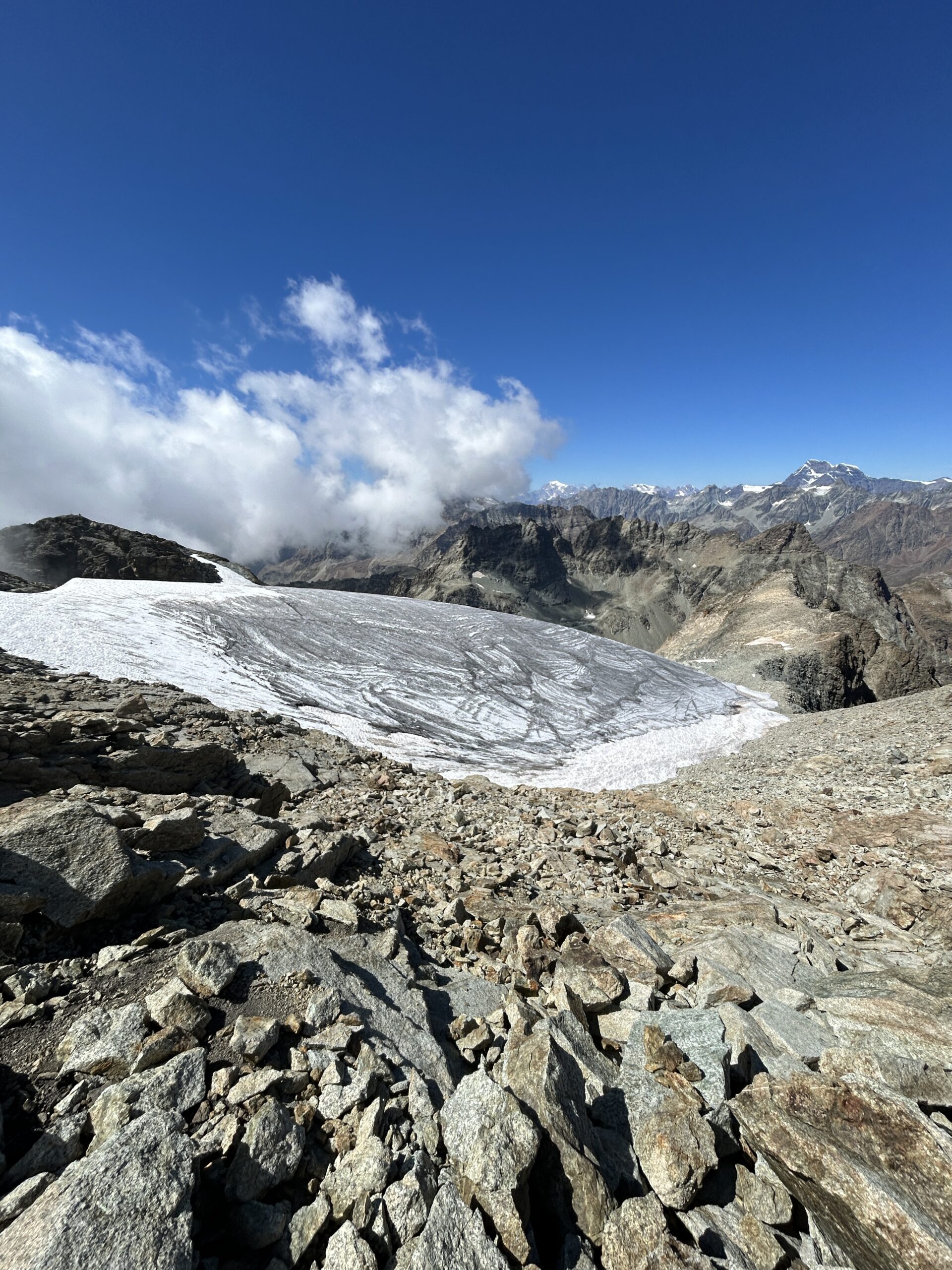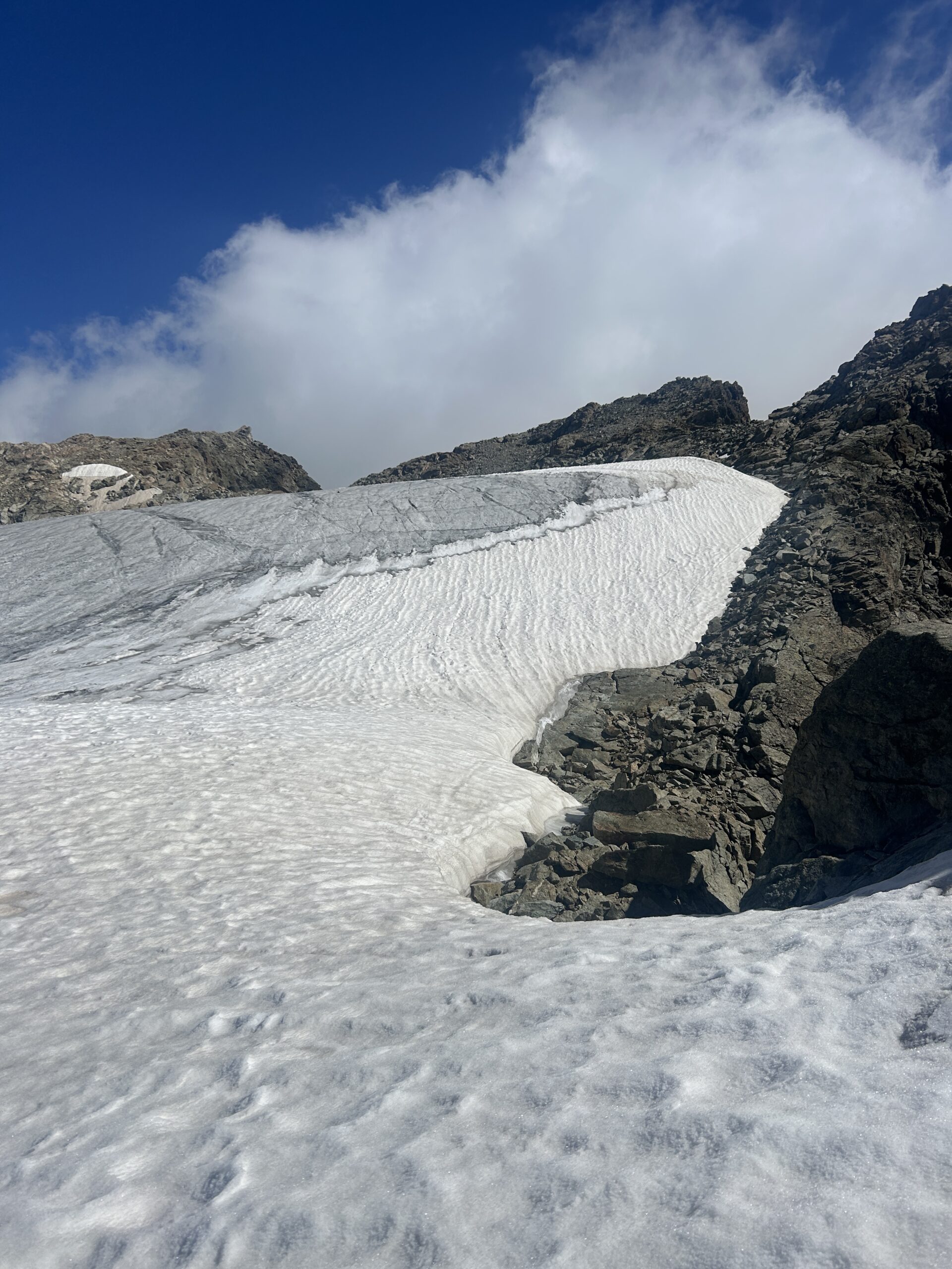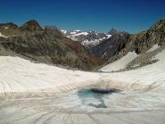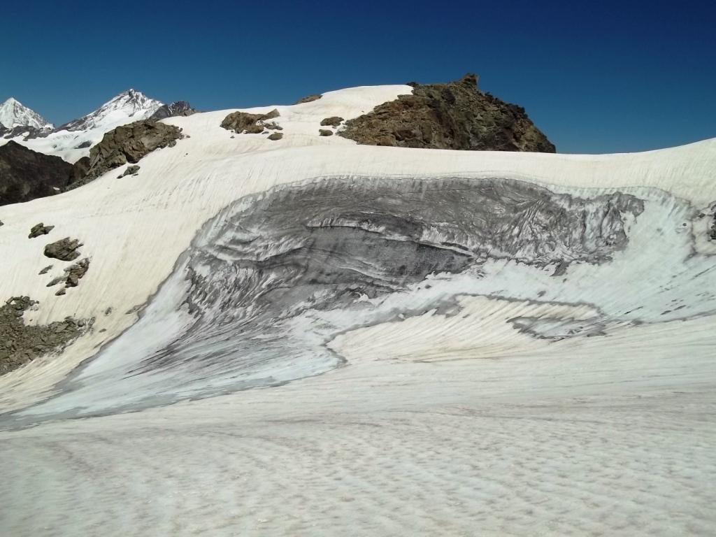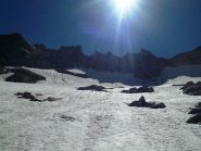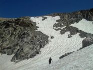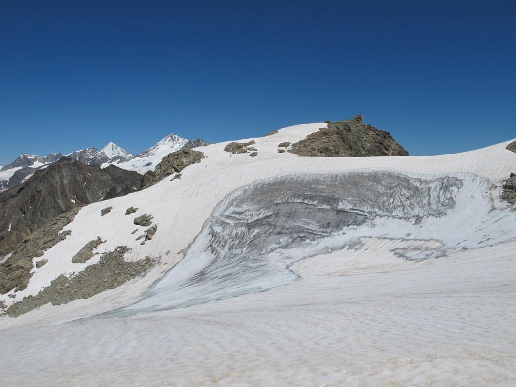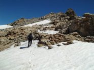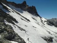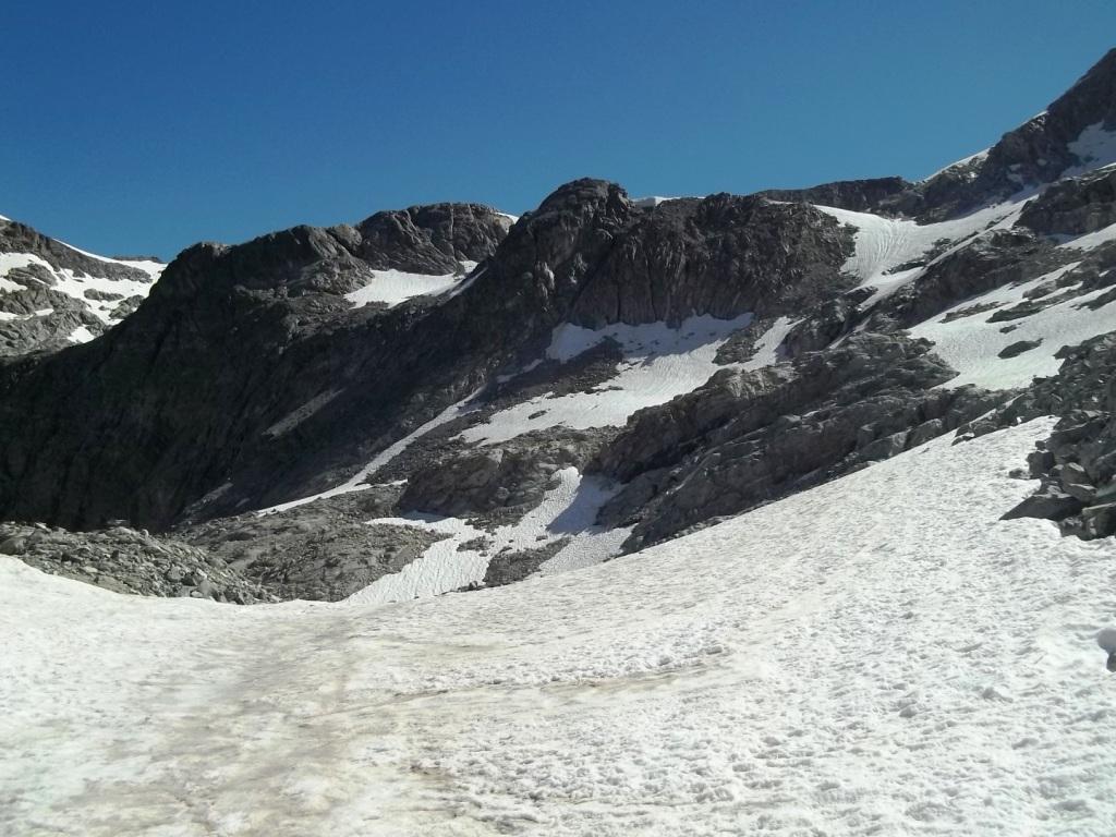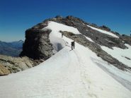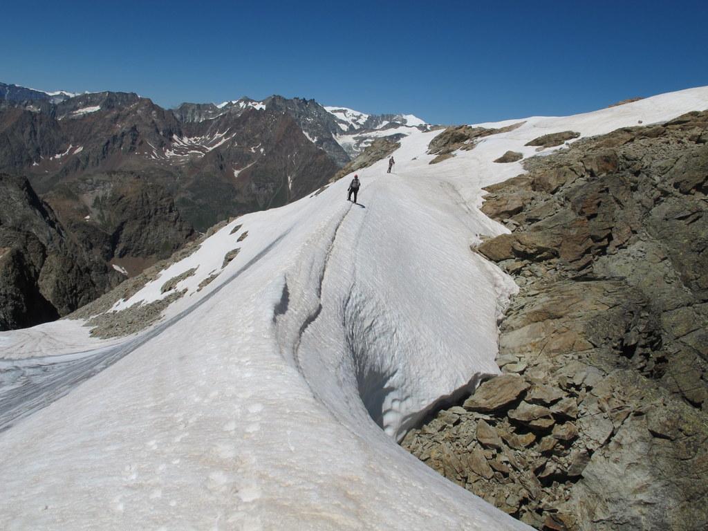 In alternativa, si può evitare la parte più ripida del ghiacciaio della Punta Tzan, dalla quale si accede al calottone, risalendo il versante SO dell’anticima Sud su pietraia e/o nevai che, in base alle condizioni e al periodo, possono essere più o meno estesi: giunti al culmine si attraversa verso sx a raggiungere il calottone ed il successivo bacino glaciale.