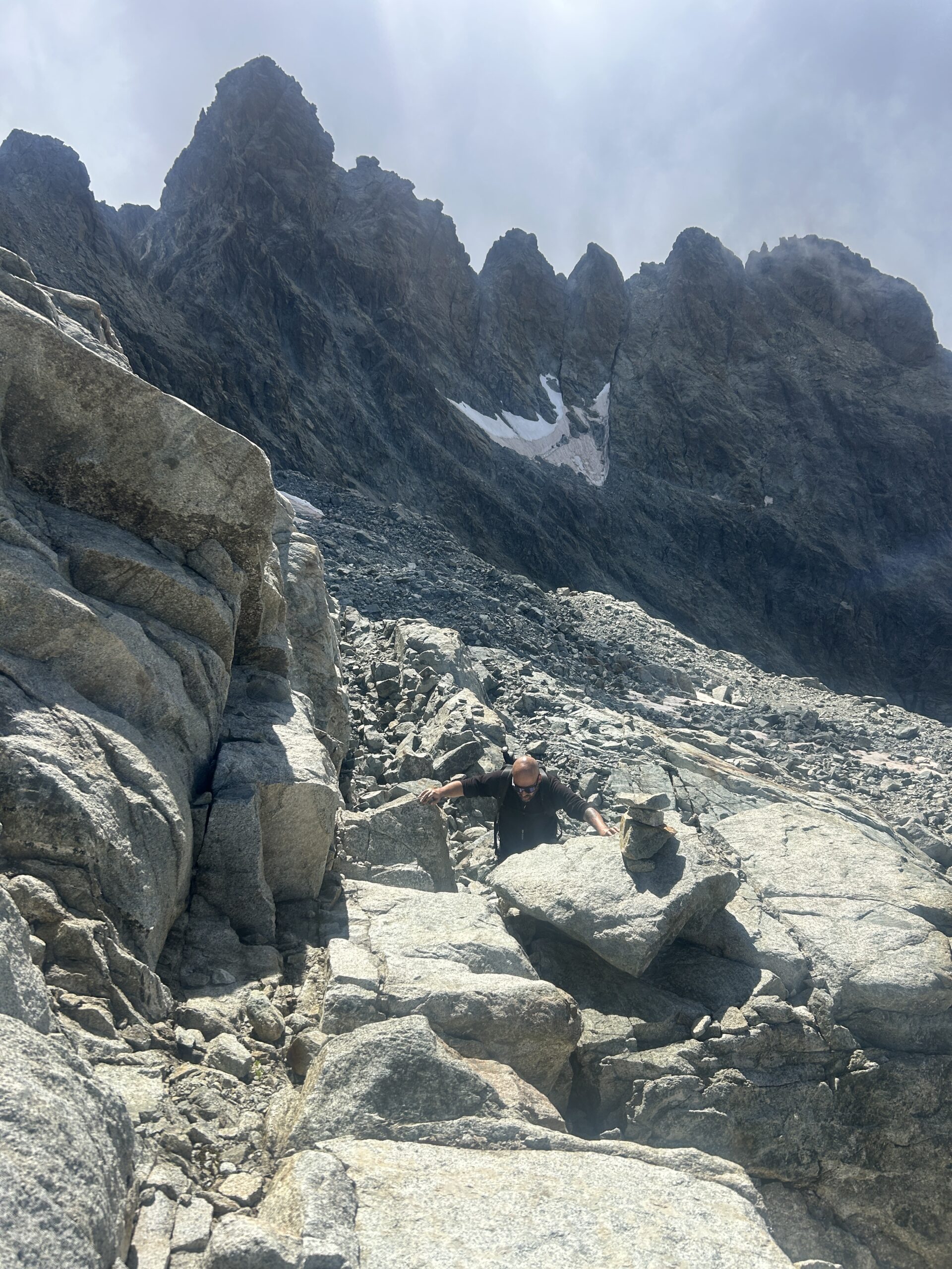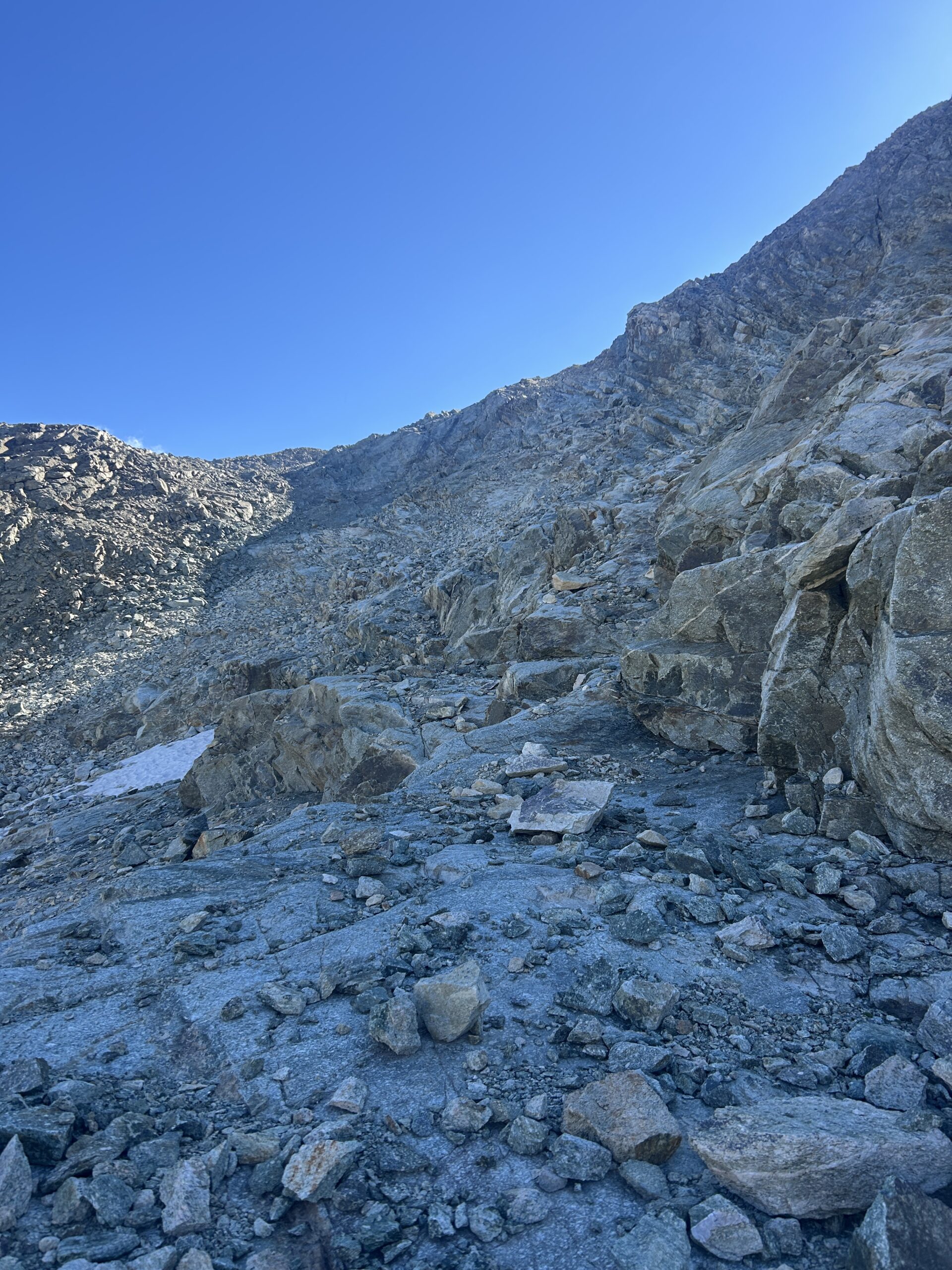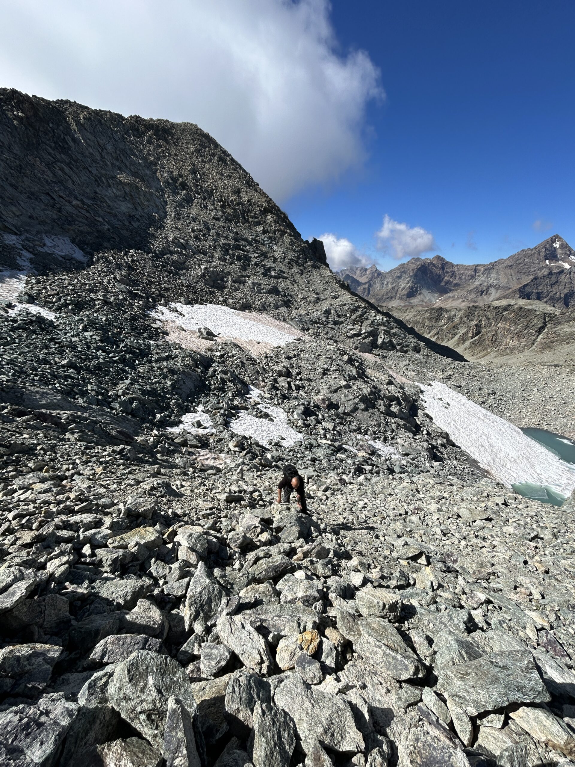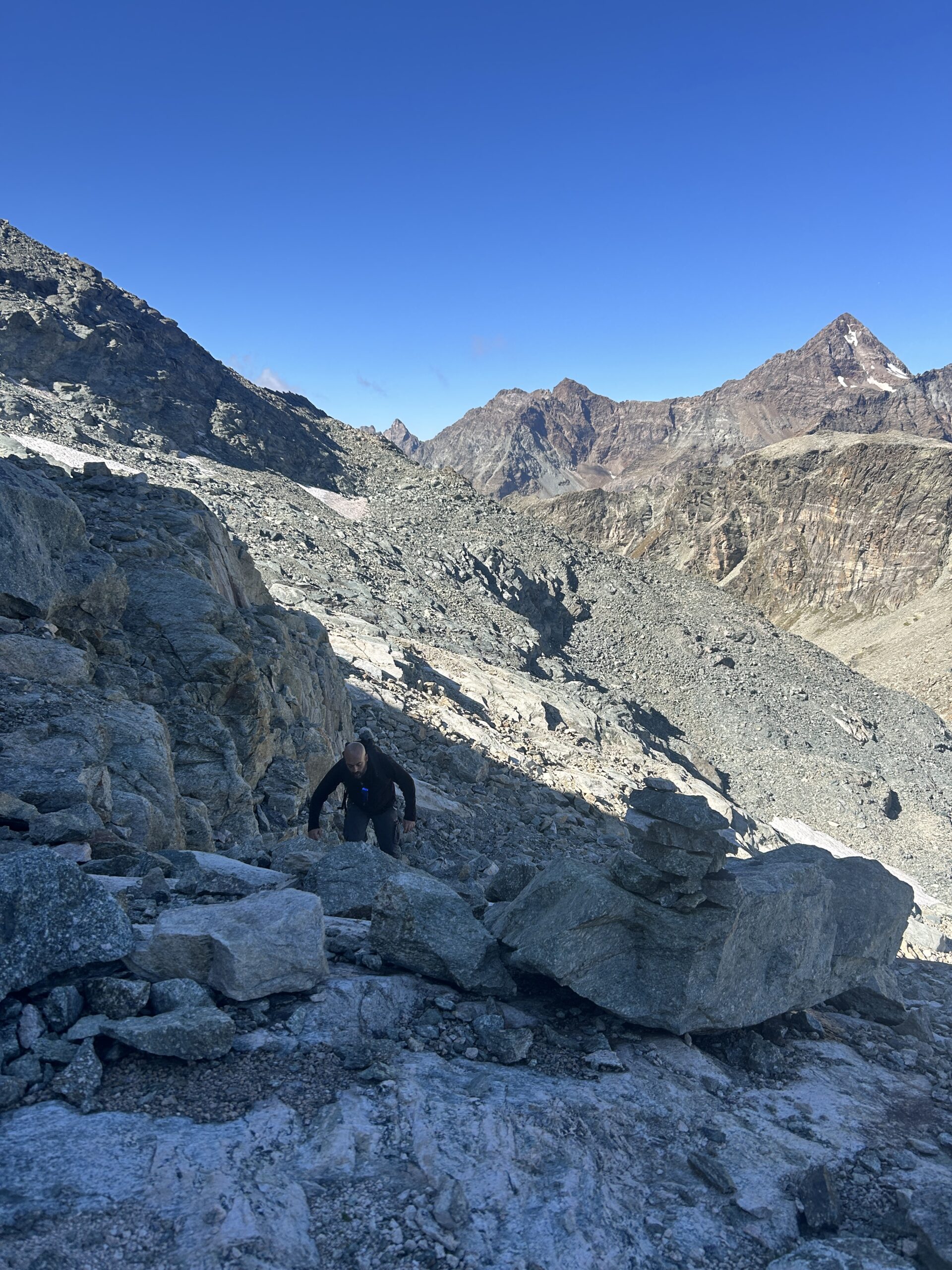 Seguire gli ometti (non molto numerosi) e imboccare una larga rampa tra grandi blocchi, giungendo alla base del grande accumulo detritico su cui poggia il colle. Si rimonta l’ultimo tratto fino a raggiungere la larga sella del Col de Chavacour.