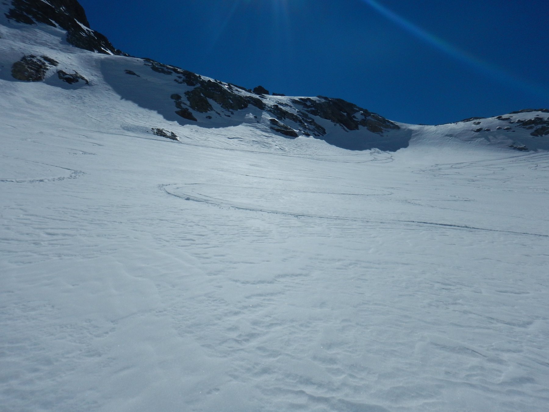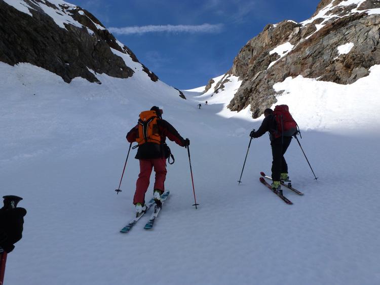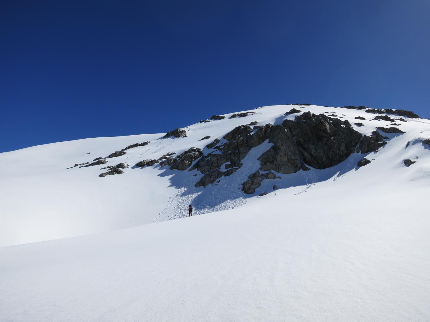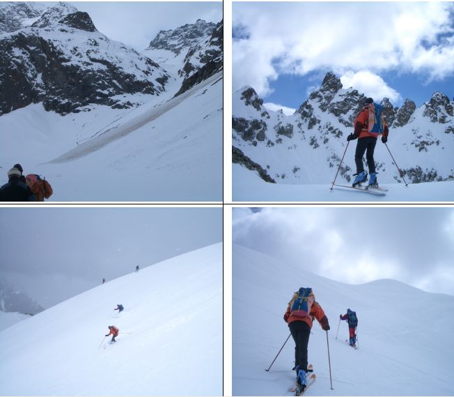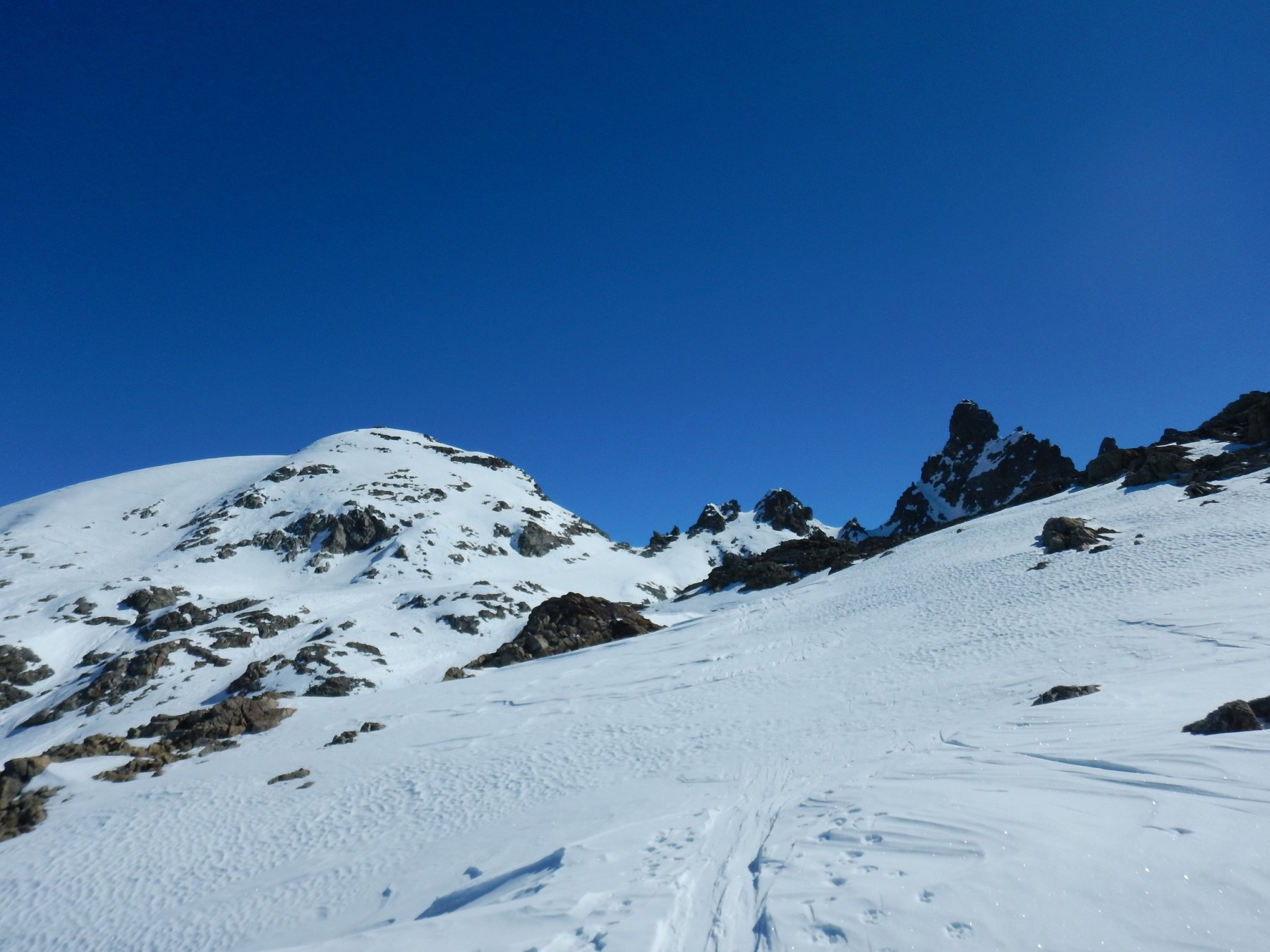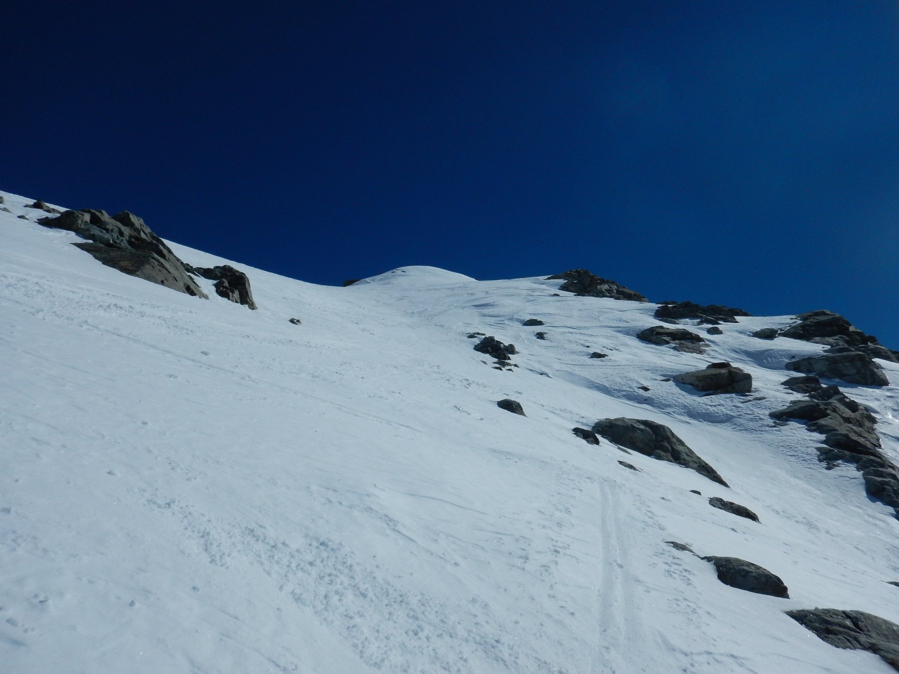 Al fondo si svolta a dx e attraverso canali e ampi pendii a 2800 m. circa si vira a sinistra e attraversando ampi canali sulle creste si giunge alla vetta (3351 m.)