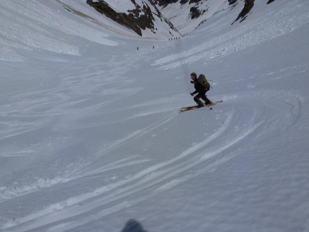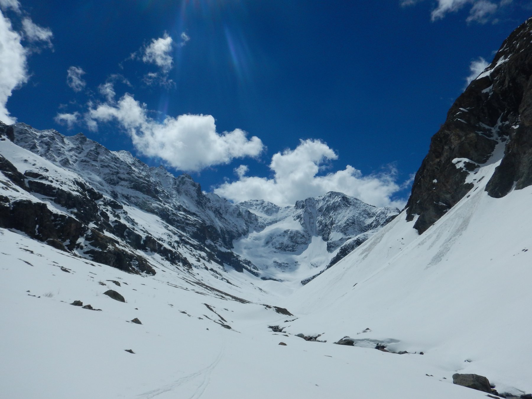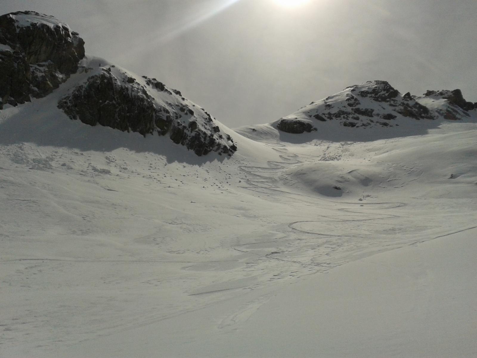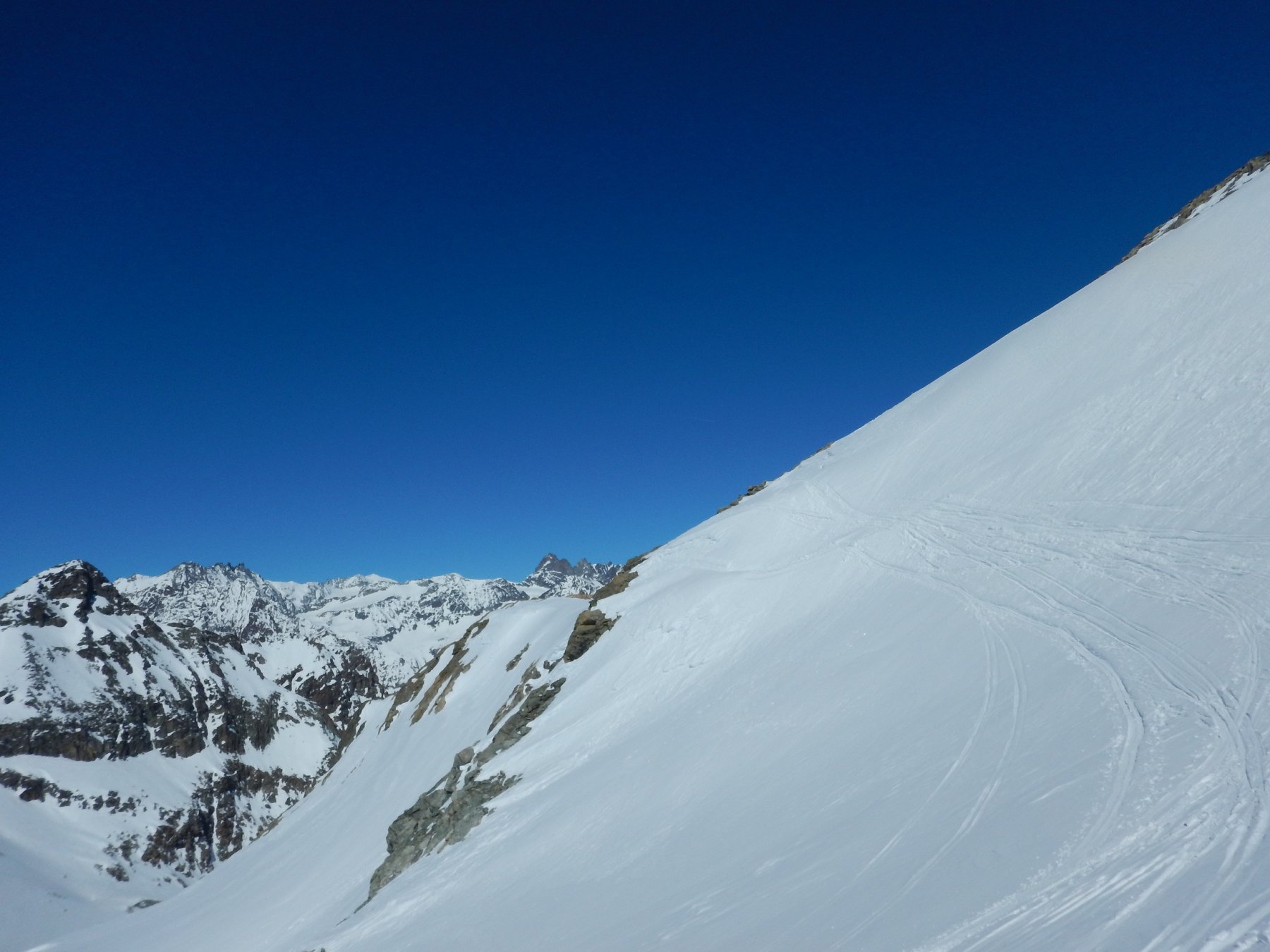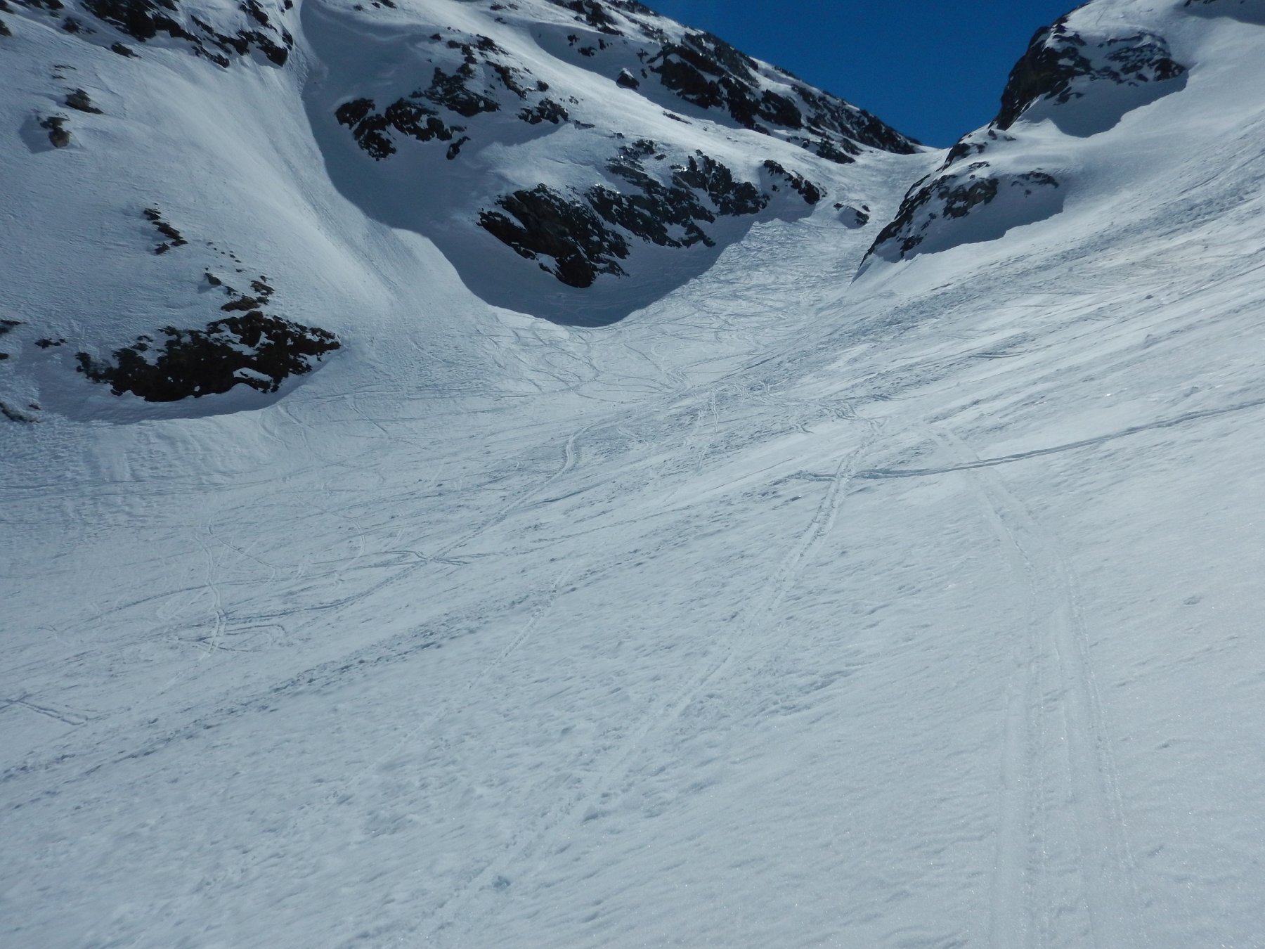 Al fondo si svolta a dx e attraverso canali e ampi pendii a 2800 m. circa si vira a sinistra e attraversando ampi canali sulle creste si giunge alla vetta (3351 m.)