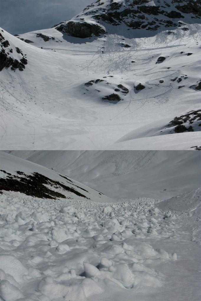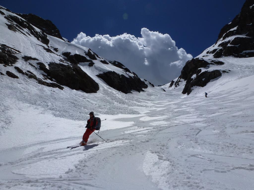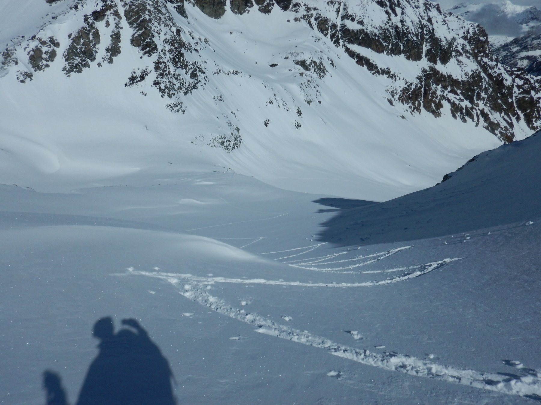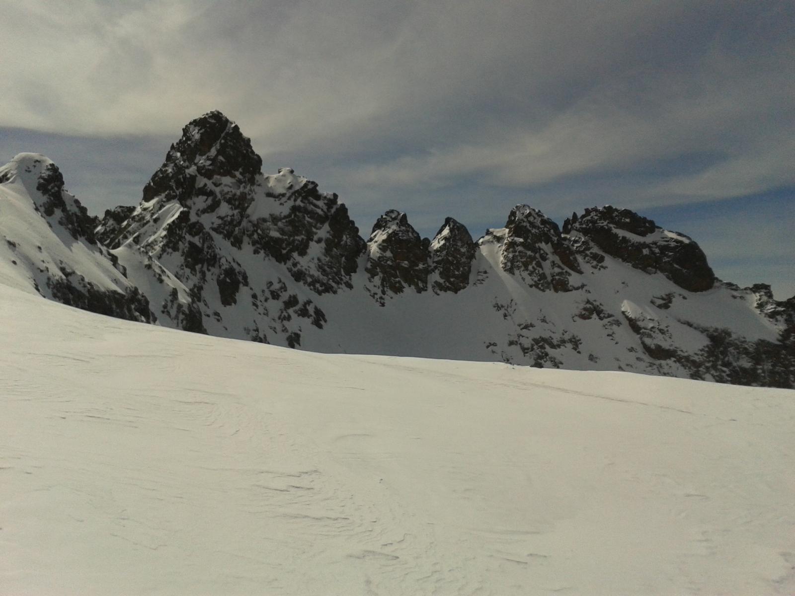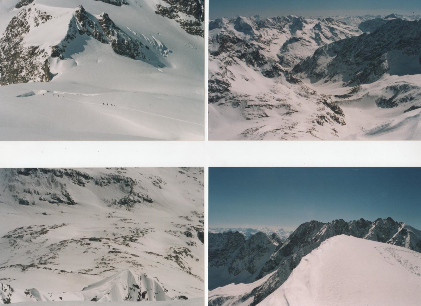 Al fondo si svolta a dx e attraverso canali e ampi pendii a 2800 m. circa si vira a sinistra e attraversando ampi canali sulle creste si giunge alla vetta (3351 m.)