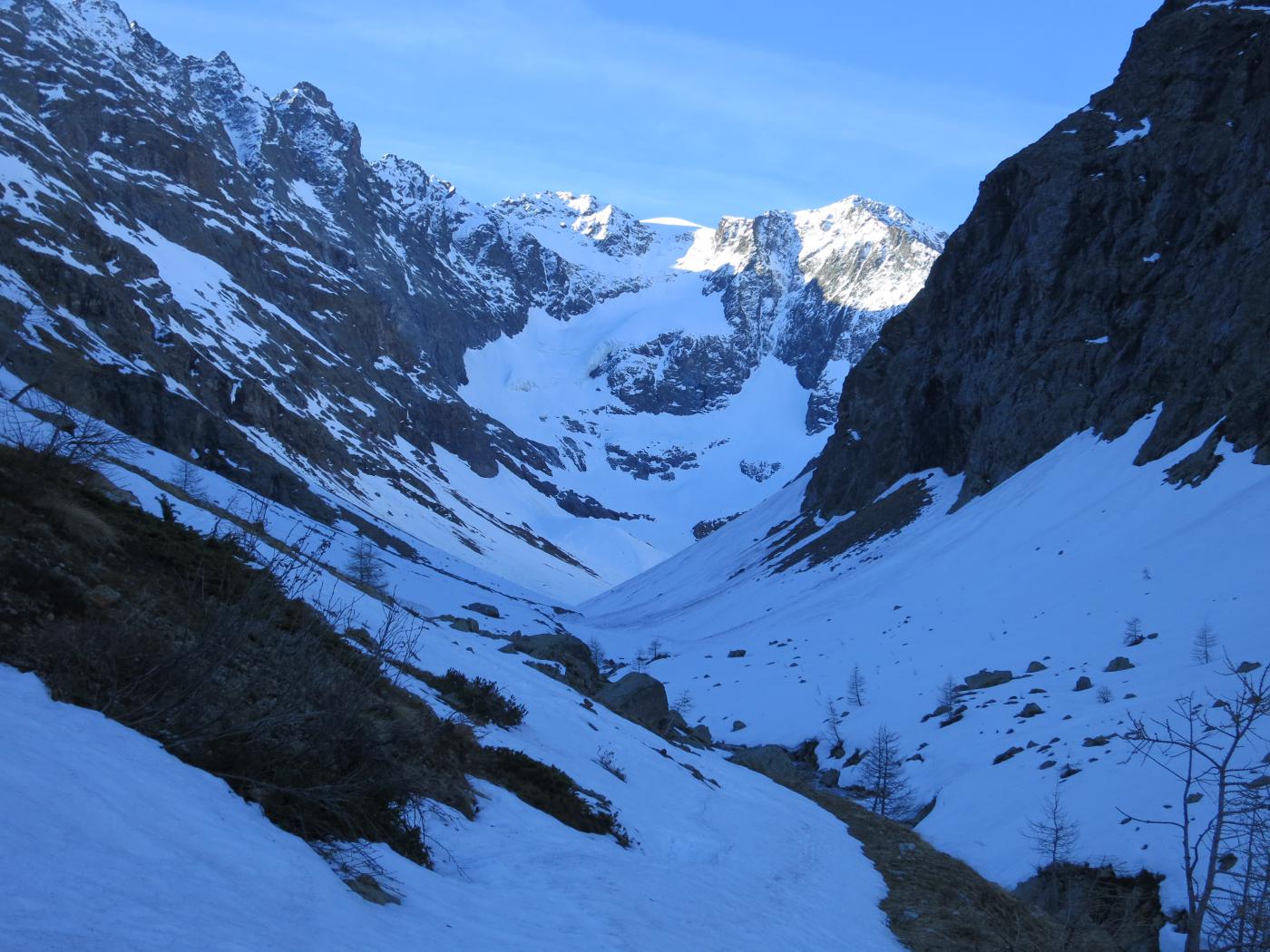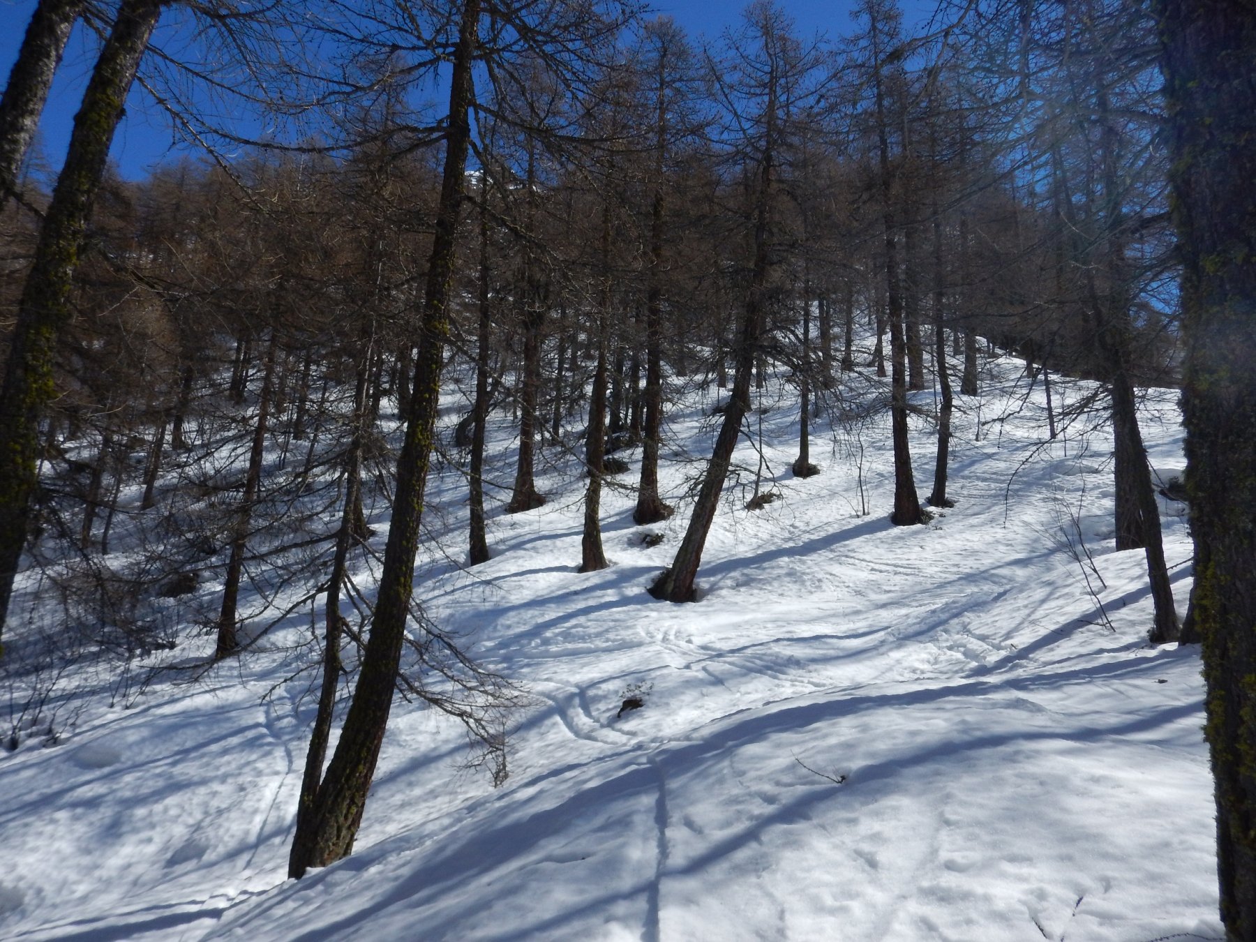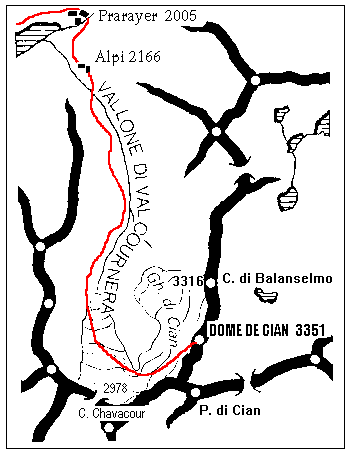 dal rif. Prarayer, percorso il ripido lariceto che immette nel vallone di Valcournera lo si percorre interamente sul lato dx orografico (sn di salita).