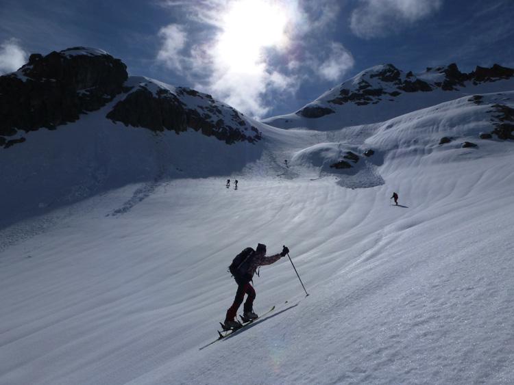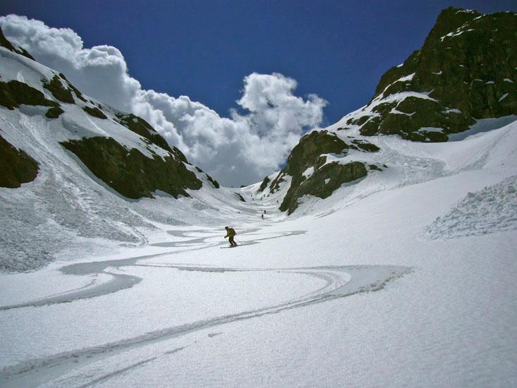 Discesa iniziata alle 12.45, nel frattempo la neve ha mollato il giusto, trasformata e facile anche nei tratti piu’ impegnativi.