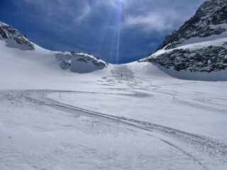 Nel canale di accesso in basso , sopra il bosco, presenti delle valanghe. Situazione generale comunque sicura; le pareti laterali del vallone sono, per lo più sgombere di neve e la traccia rimane (a mio avviso) al sicuro. Sopra condizioni super
