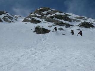 bella parete sui 50° di pendenza, condizioni ottime della neve, solo le punte dei ramponi mordevano il pendio, progressione di conserva, fatte solo alcune soste più che altro per riposare i polpacci.