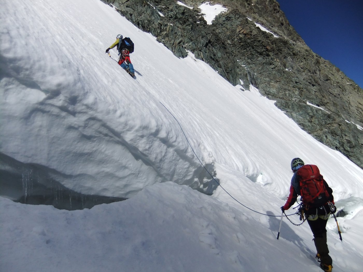 Partiti dal rif. Prarayer alle 4.30, la salita fino alla punta ci ha richiesto poco meno di 5 ore. Seguito il sentiero fin dove possibile, poi proseguito lungo il torrentello (tracce) fino ad arrivare al ghiacciaio. Da qui superata la prima fascia di rocce sfruttando una lingua di neve ghiacciata (messo alcuni chiodi), mentre un’altra cordata presente ha optato per un giro più largo passando tutto a dx su neve e ricongiungendosi con noi sui pendii superiori. Passato un grosso crepaccio sfruttando un ponte abb solido, invece per la terminale la questione è un po’ più complessa: è parecchio aperta, noi abbiamo sfruttato un punto nel centro in qui rimane una lingua di neve dura (che è meglio non caricare cmq). Una volta andata via anche quella forse rimane da tentare tutto a sx ma poi si arriva su rocce montonate che non sembrano il massimo da scalare. Il pendio ripido superiore è invece in ottime condizioni, neve dura, si procede con due picche e senza chiodi.