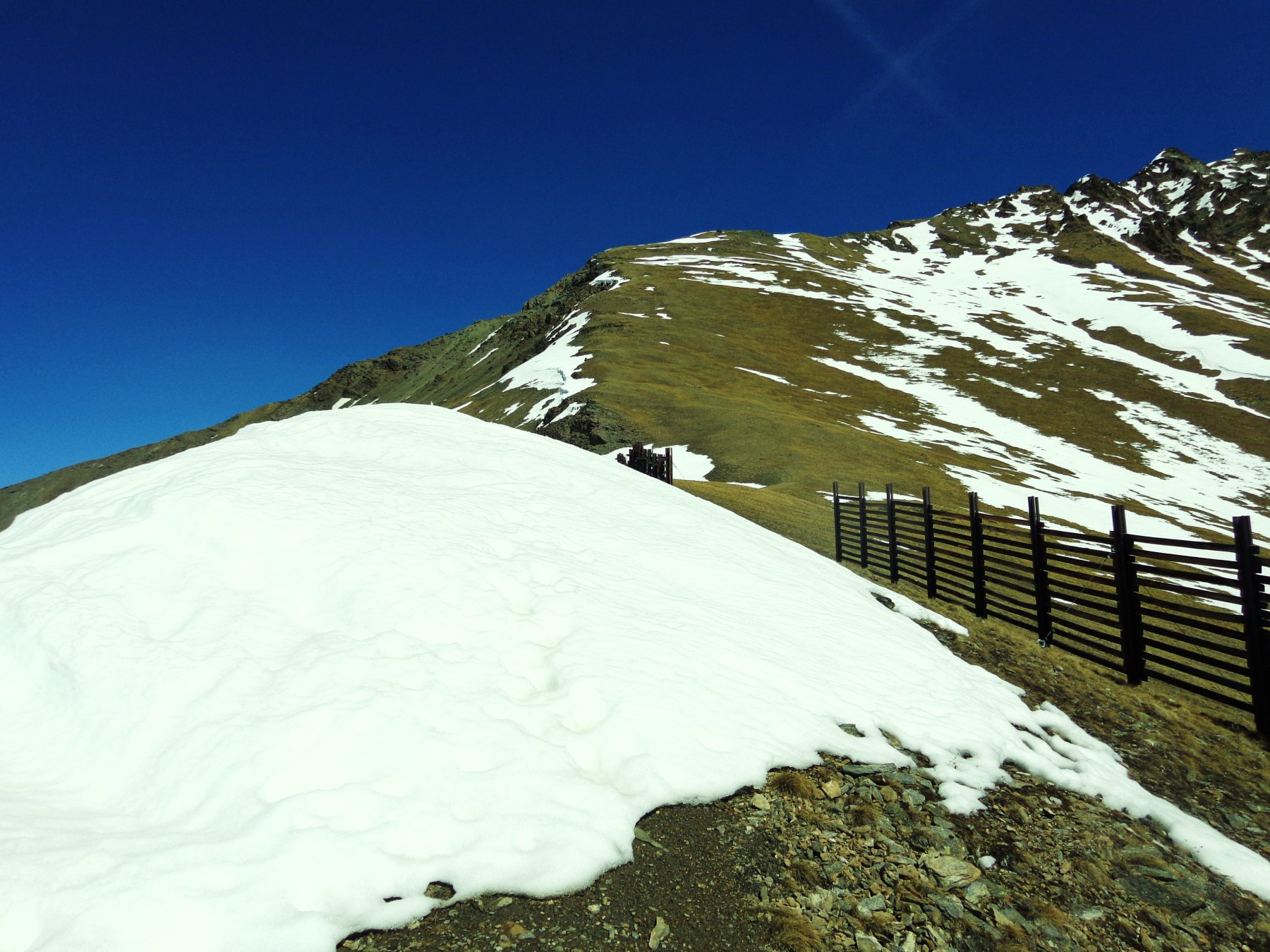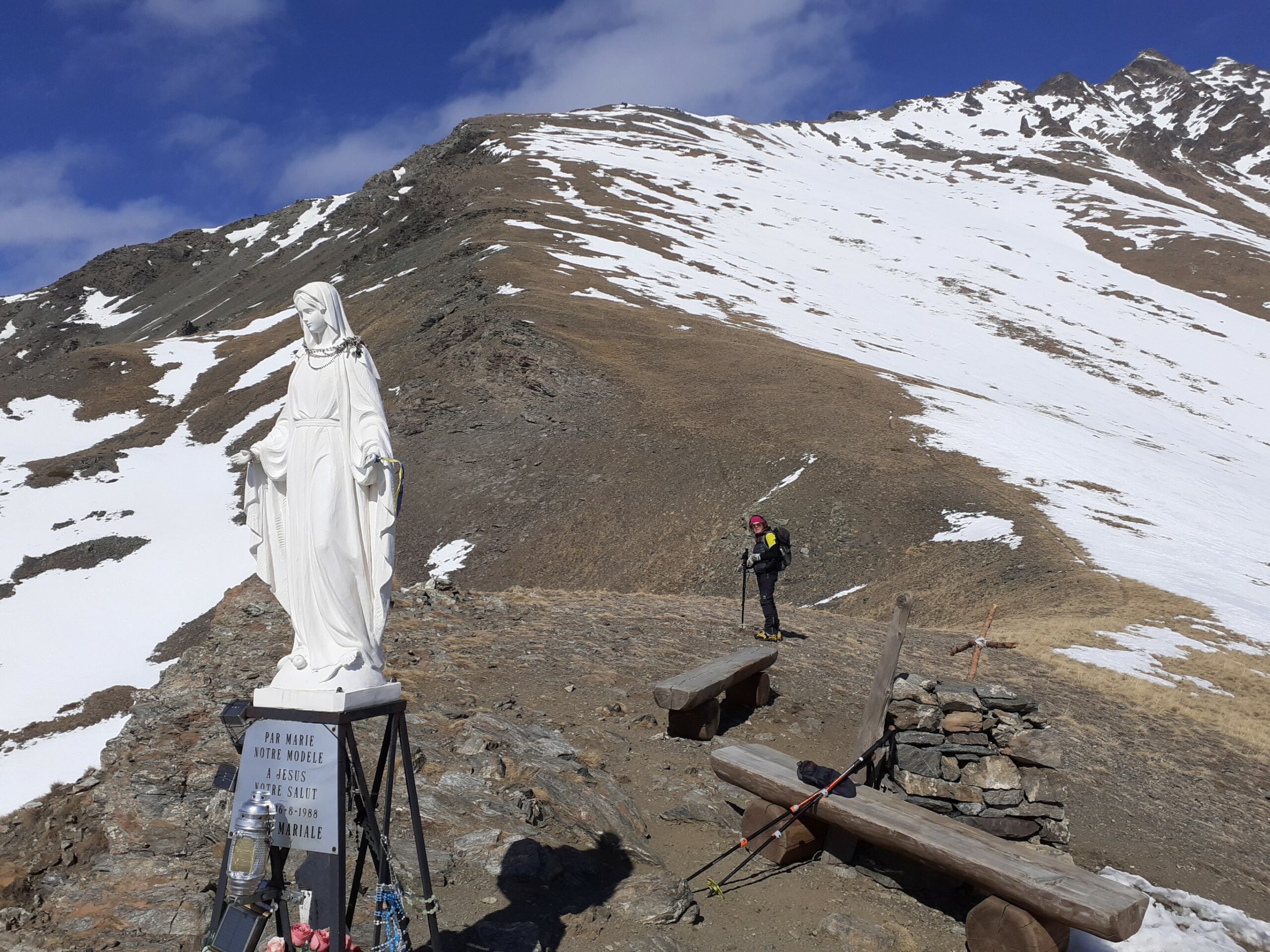 Seguirlo per circa 500 metri, fino a che si incontra un bivio con una palina dei sentieri (q.2000). Svoltare per il sentiero 3B che senza altre deviazioni conduce alla madonnina della Tsaplana.