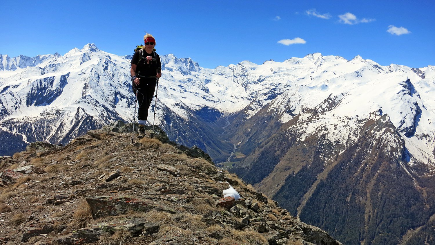 Partiti dal parcheggio vicino all’area giochi, nessun problema nel reperire il sentiero 3b grazie anche all’ottima segnaletica,abbiamo avuto solo qualche dubbio quando leggendo la relazione questa dice che dopo Pian Teppe proseguire per 500 metri fino a trovare la palina di segnalazione che fa deviare decisamente a destra, a me sono sembrati più di 500 metri.Il bosco è fiabesco, il sentiero è morbido tutto su aghi di pino.Usciti dal bosco lo spettacolo è fantastico.Segnalo una bellissima vipera a quota 2350 circa, alla faccia di coloro che sostengono che le vipere non superano i 2000 metri, questa è la terza che vedo a queste altezze e quindi mi sento di sfatare questo luogo comune.Arrivati a circa 100 metri dalla punta il sentiero attraversa un canalone innevato, abbiamo evitato di attraversarlo perchè in caso di scivolata si arriva fino sotto nella valle del Grauson, abbiamo quindi percorso il ripido versante sulla sinistra dove diversi lamoni/ometti indicano la via giusta da percorrere.Arrivati in punta abbiamo fatto qualche foto di rito e siamo tornati subito sui nostri passi per trovare un punto al riparo dal vento gelido.