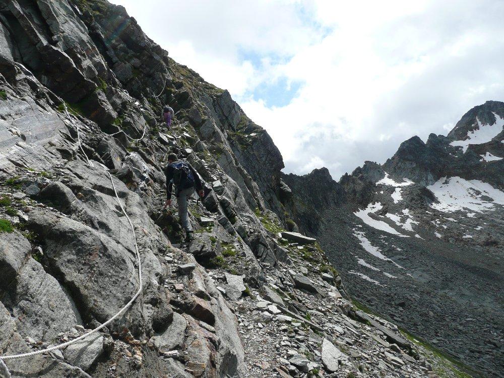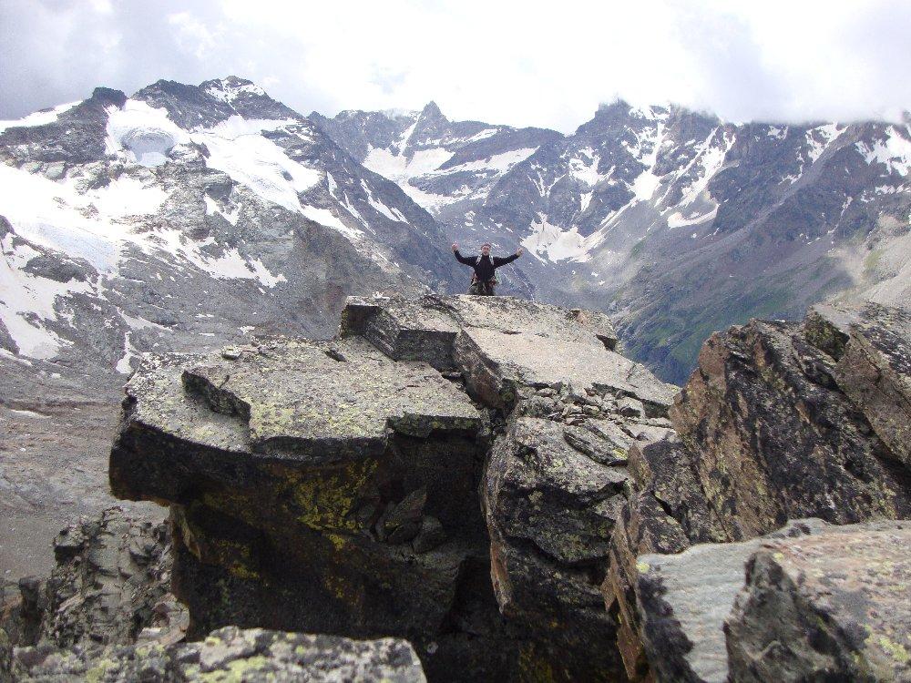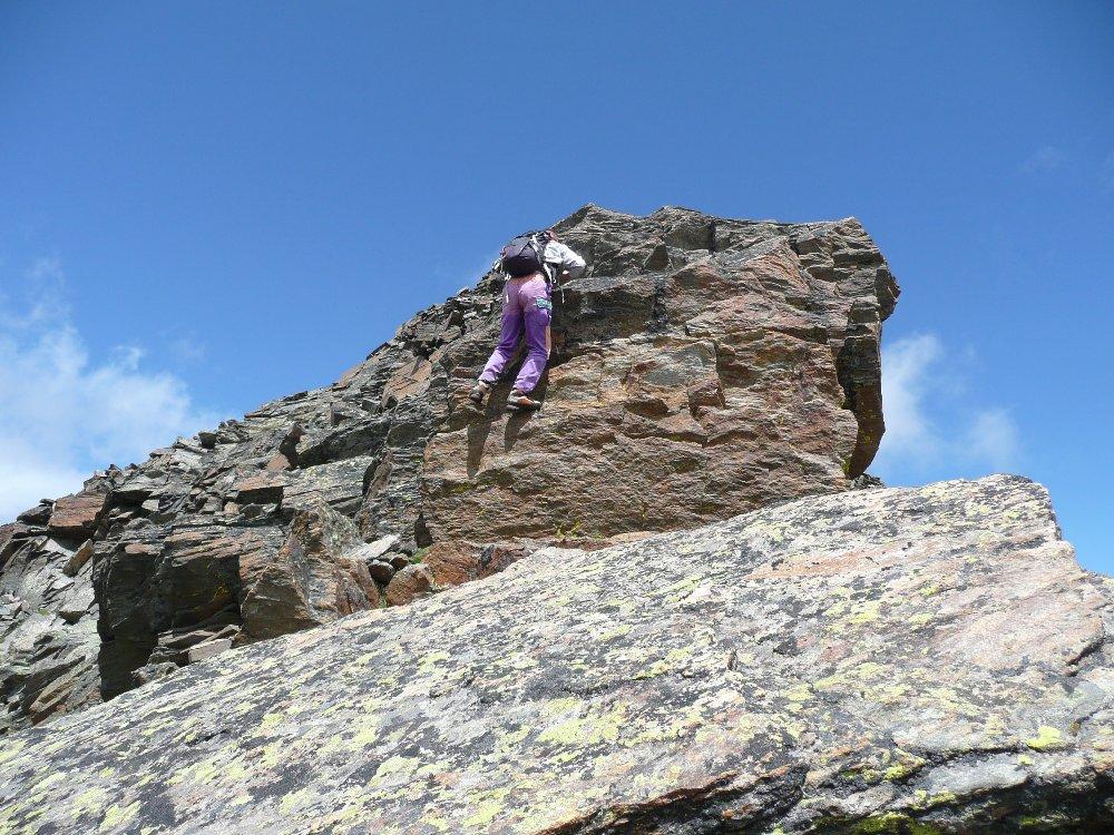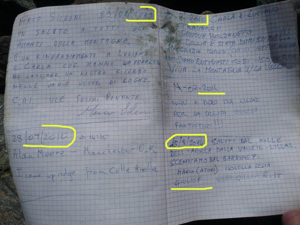 Abbiamo inserito la cima nell’ampio anello che percorre la Valleile ed il vallone del Bardoney, passando dal colle dell’Arolla, zona che da tempo intendevo visitare dato che non ci ero mai stato. Il giro complessivo comprende 1560 metri d+ e circa 22 km. di sviluppo. I sentieri di accesso al colle sono ben segnati ed agevoli su entrambi i lati ma un po’ bagnati. La salita alla cima vale la pena farla sulle rocce in prossimità del filo di cresta dove ci sono buoni appigli piuttosto che cercare cenge erbose ma umide poco più in basso, la parte finale obbliga comunque a stare sulla roccia ed è valutabile PD, difficoltà analoghe alla normale del Monviso ma con roccia peggiore e percorso tutto da cercare, tempo di salita della cresta di circa un’ora, idem per la discesa. Nell’ometto di vetta è presente un cilindro di plastica con quaderno iniziato nel 1995 del quale sono stati scritti solo 4 fogli, a dimostrazione della scarsissima frequentazione di questo rilievo, se salite portate una biro, quella presente scrive male. Salita fatta senza corda con Marco (atoki) e Andrea T. che dopo un breve tratto di rocce ha preferito rinunciare ed attendere al colle che già comunque ripaga bene la gita. La salita al castello finale, collegato all’ anti cima seguendo facili placche coricate, credo si potrebbe affrontare direttamente con le scarpette da roccia salendo le evidenti placche fessurate, altrimenti con scarponi o scarpe basse è possibile aggirarlo sulla sinistra (grossi blocchi) ad intercettare un breve canale detritico ma con buoni appigli che porta in pochi minuti alla sommità del rilievo e da qui all’ometto di vetta dove la cresta diventa più comoda, come abbiamo fatto noi. Temperature buone ma non troppo estive, nel fondovalle molta gente girava con spesse giacche a vento e berretti, qualche fiocco di neve salendo al colle, poi sereno in cima con panorama più che accettabile sulle montagne locali che ci interessano, in particolare la maestosa Torre Lavina: ben visibili le tracce iniziali che portano al bivacco ai piedi della cresta ovest delle torre nord. Parcheggi zeppi a Lillaz: per stare comodi, 3 euro x 24 ore sulle strisce blu.