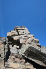 La cresta è molto lunga e talvolta conviene spostarsi qualche metro a sx (lato Valleille) per velocizzare: gradini un po’ erbosi, ma abbastanza stabili. Nella parte alta il terreno è più roccioso: fatto il salto finale sul filo… abbastanza aereo, ma sono due singoli passi molto ammanigliati intervallati da una comodissima cengia (si può proteggere con friend medi). Al ritorno abbiamo aggirato sul versante ovest per ritrovarci alla base del salto, evitando doppie.