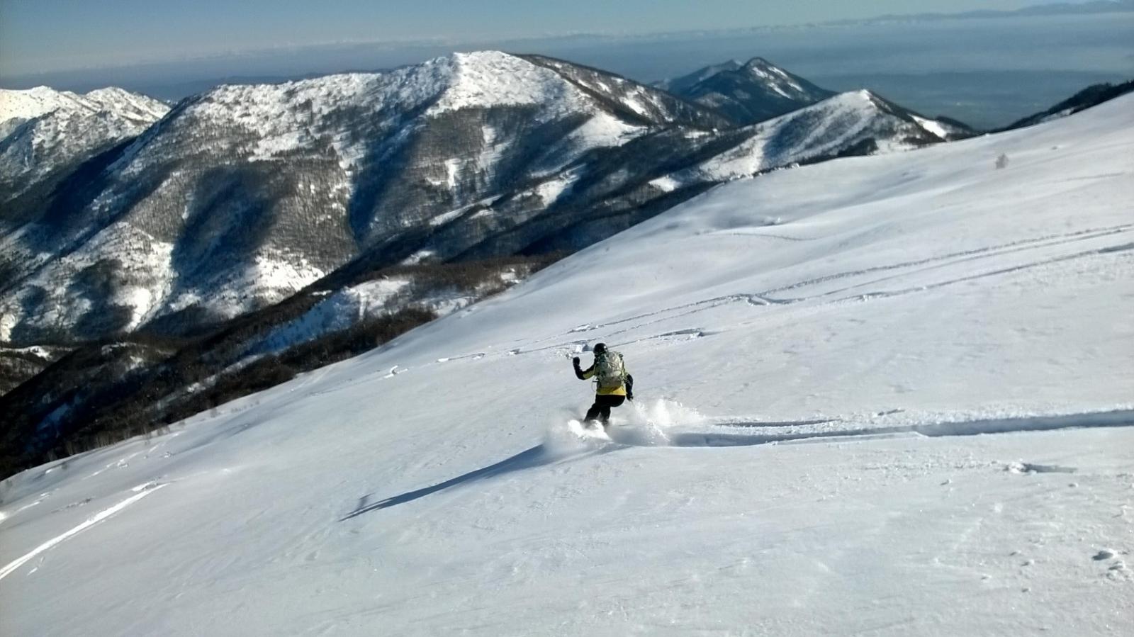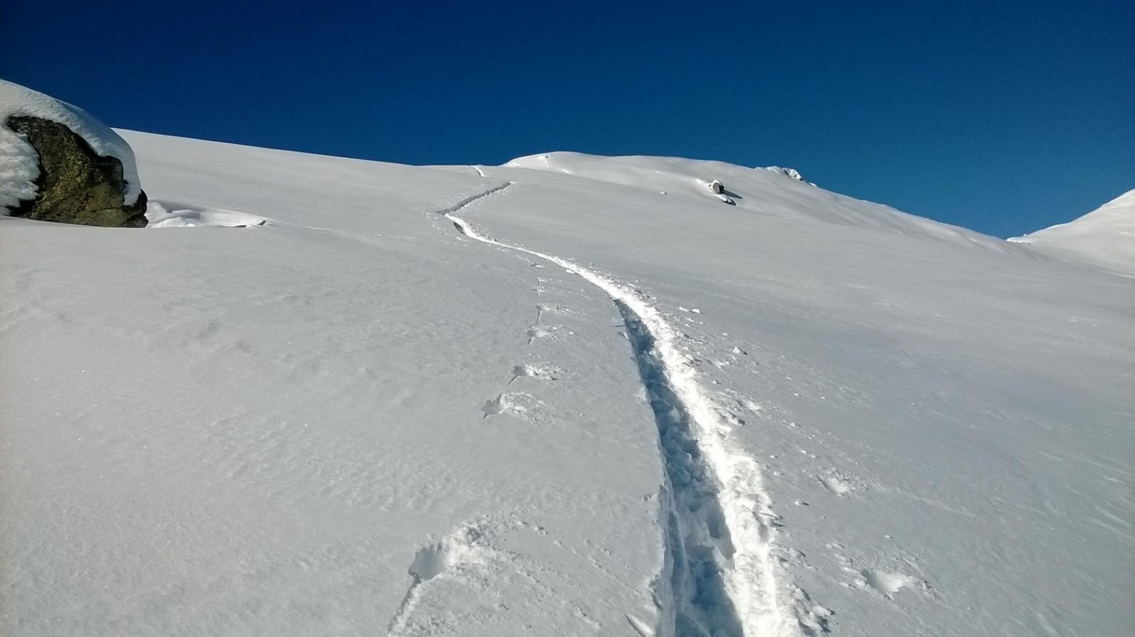 In punta raggiunti da due skialp di Almese ,che risaluto,e discesa su neve bellissima appena appena appesantita dall’esposizione e dal caldo,un pò di bosco e per finire di nuovo pendii aperti con neve che iniziava a crostare.