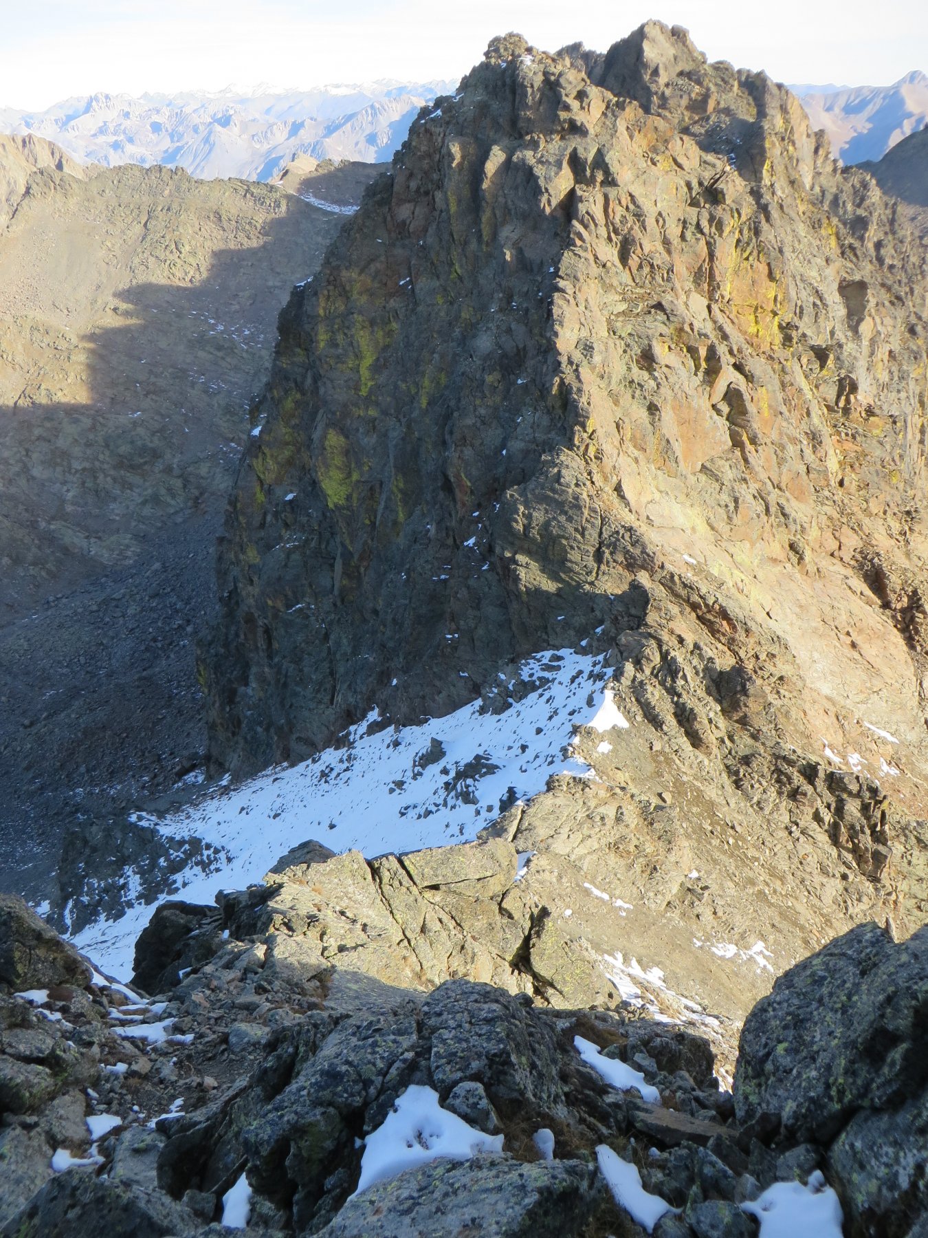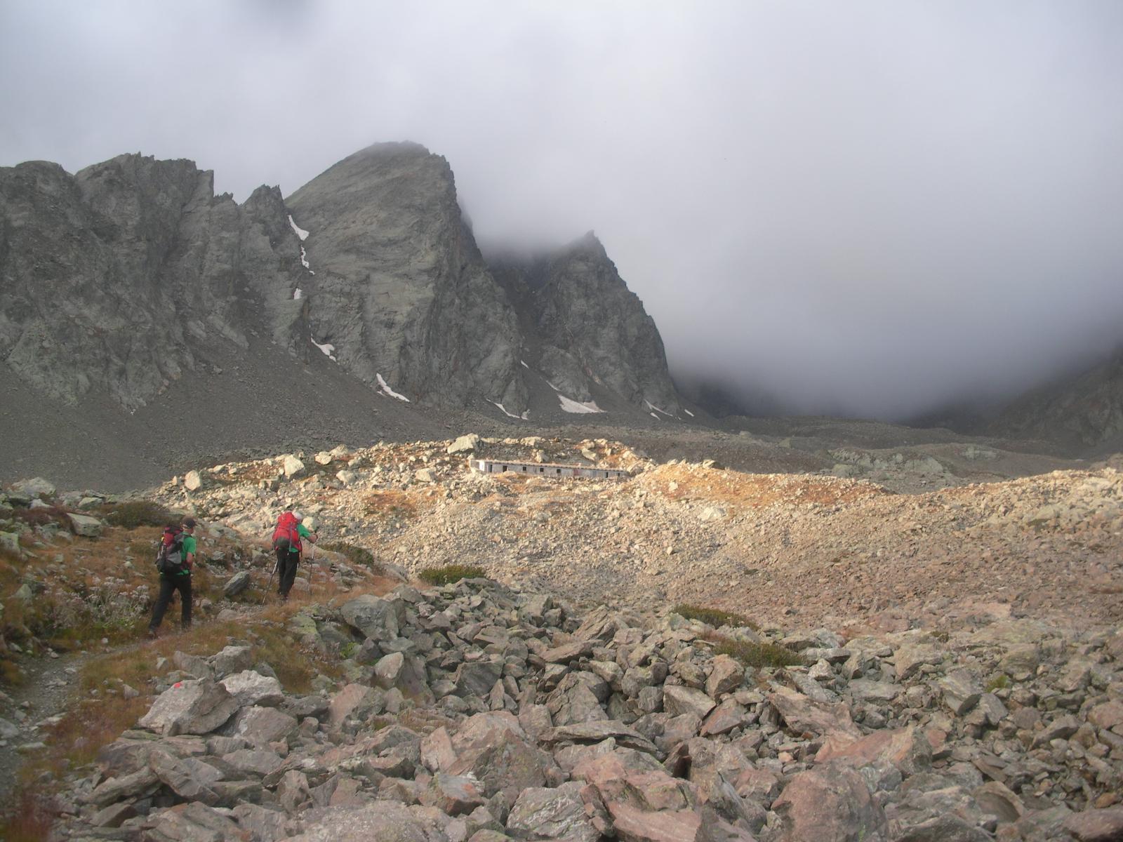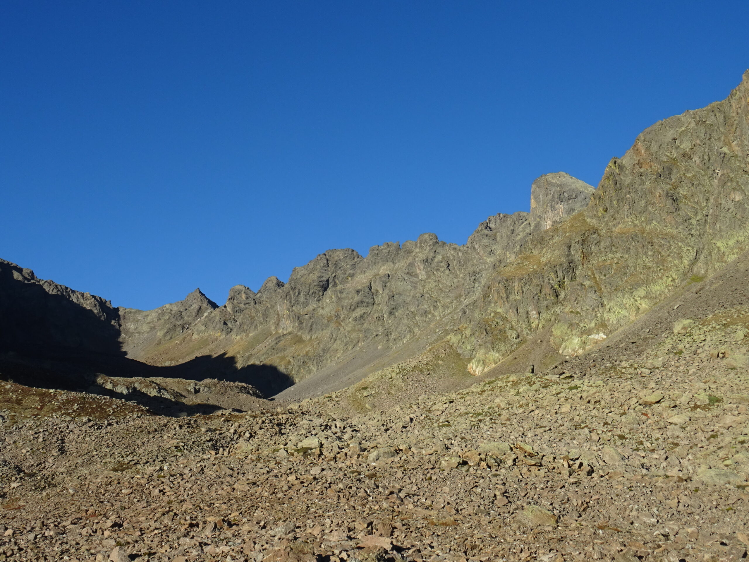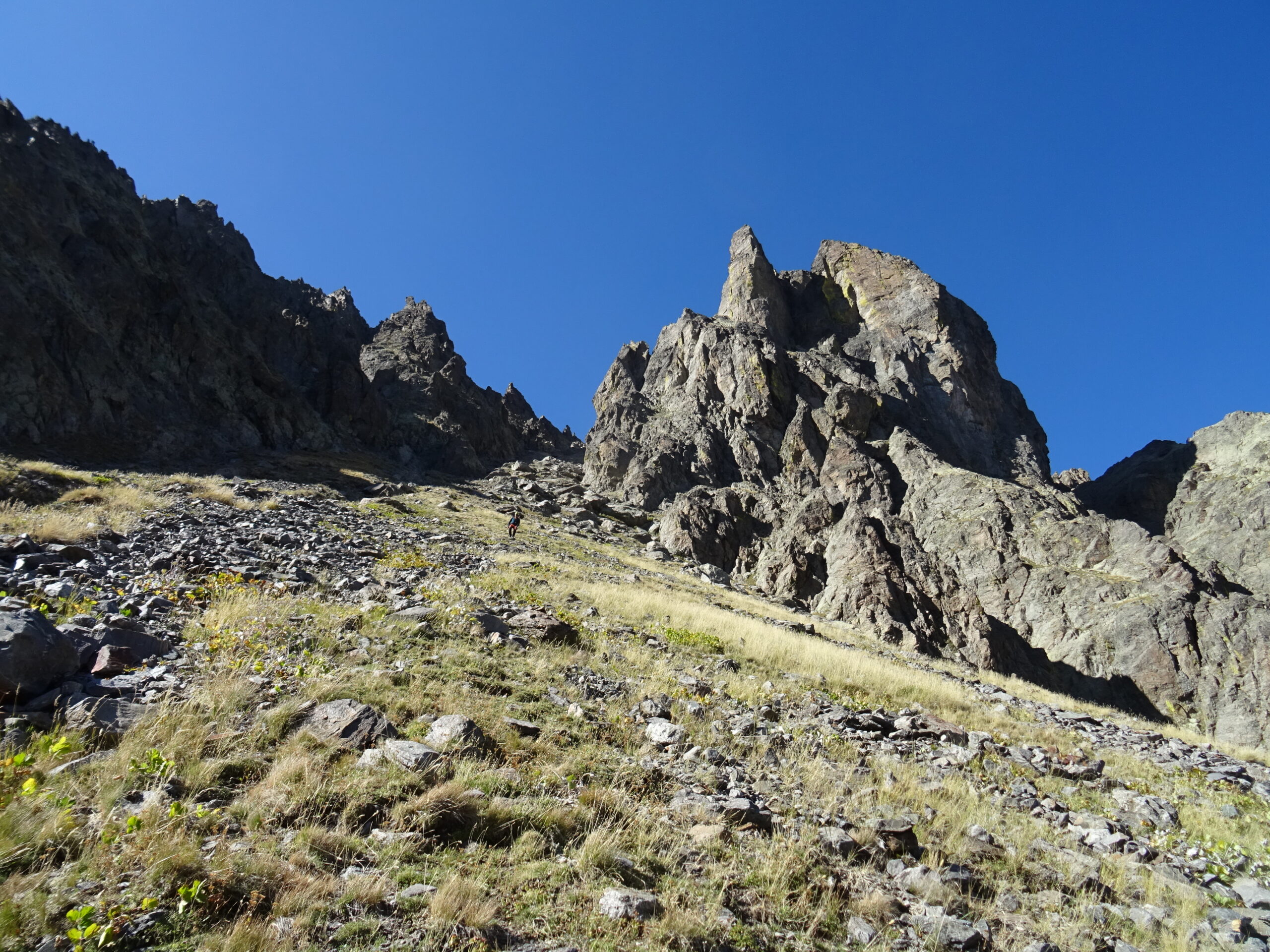 Discesa: proseguire verso N fino alla forcella Gallean, quindi piegare a dx nell’evidente canalone (ripido all’inizio e poi via via più largo e sassoso), fino a raggiungere il sentiero fatto all’andata più o meno alla q. 2670m.