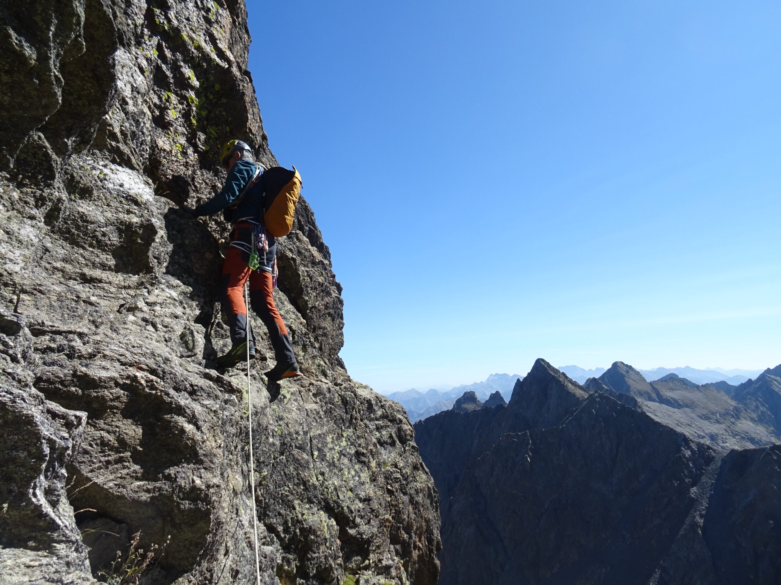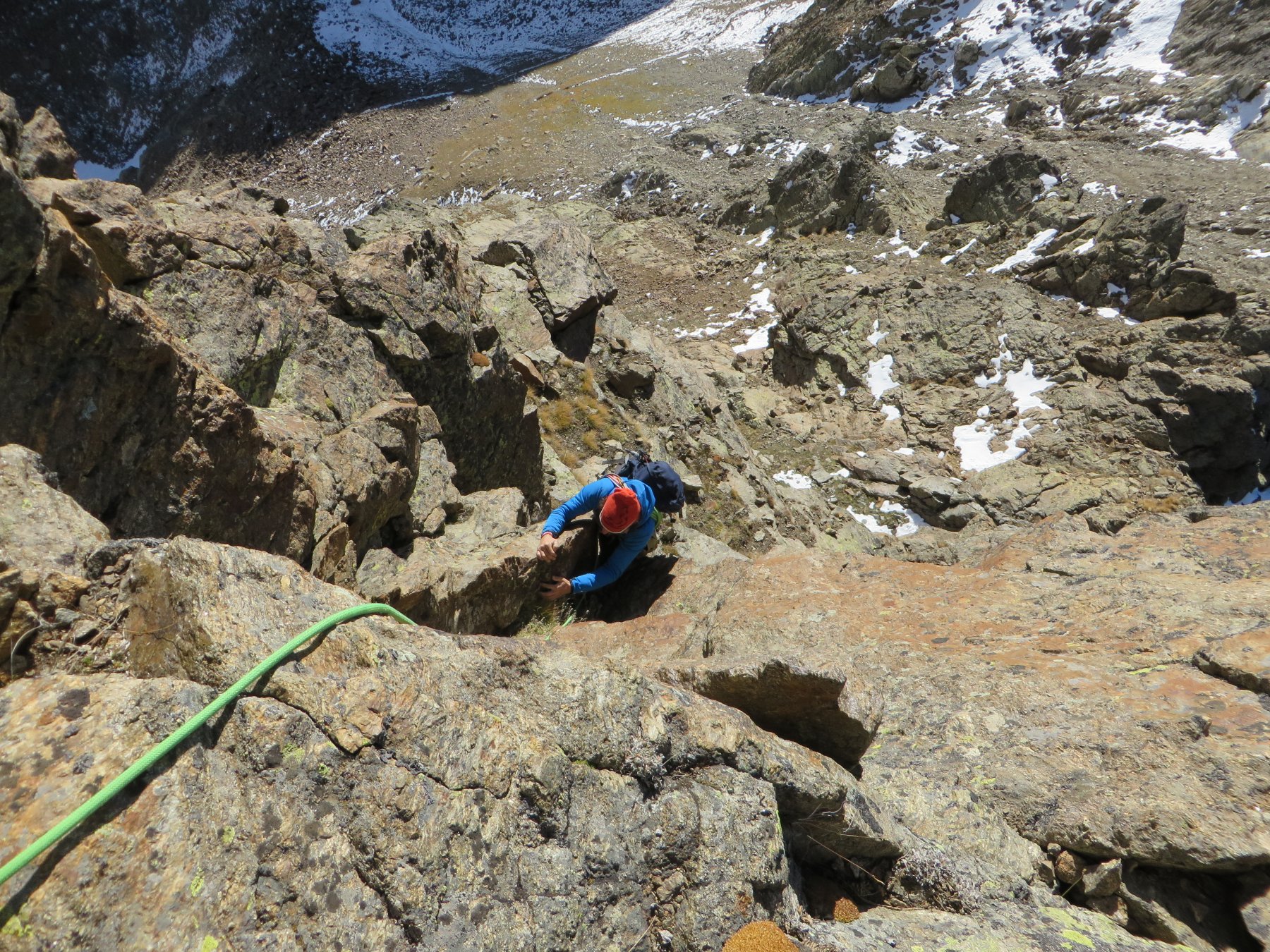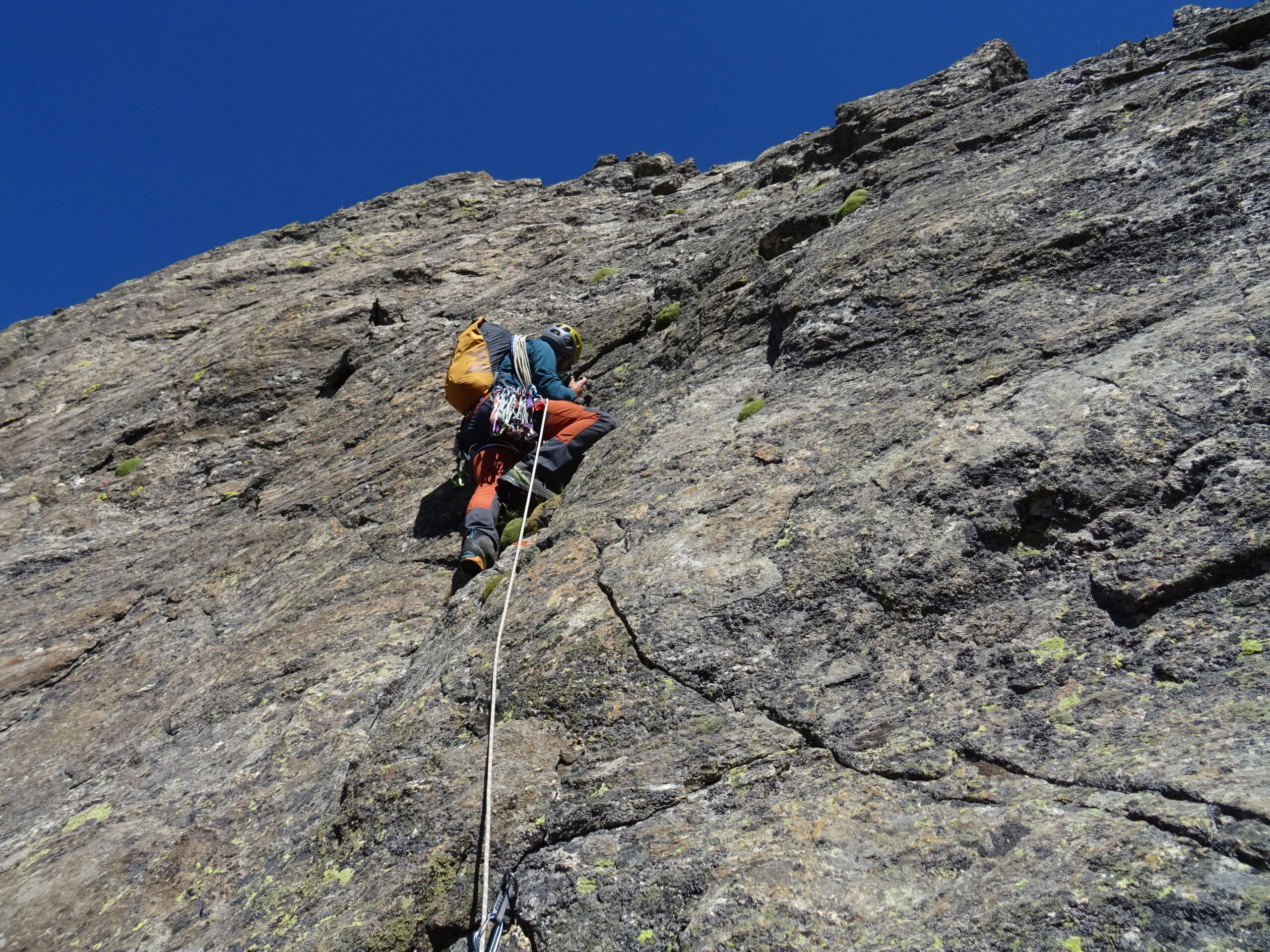 Rocca Brossé – Colletto Bertrand (2915m), PD: si prosegue brevemente verso N fino a raggiungere una sosta. Ci si cala per 25m su ripide placche, quindi ci si sposta a dx e si ritorna a sx su cengia, dove si raggiunge una grossa fettuccia su blocco. Da qui o ci si cala (25m) o si disarrampica (II/+) fino alle ultime placche che danno accesso al C.tto Bertrand.