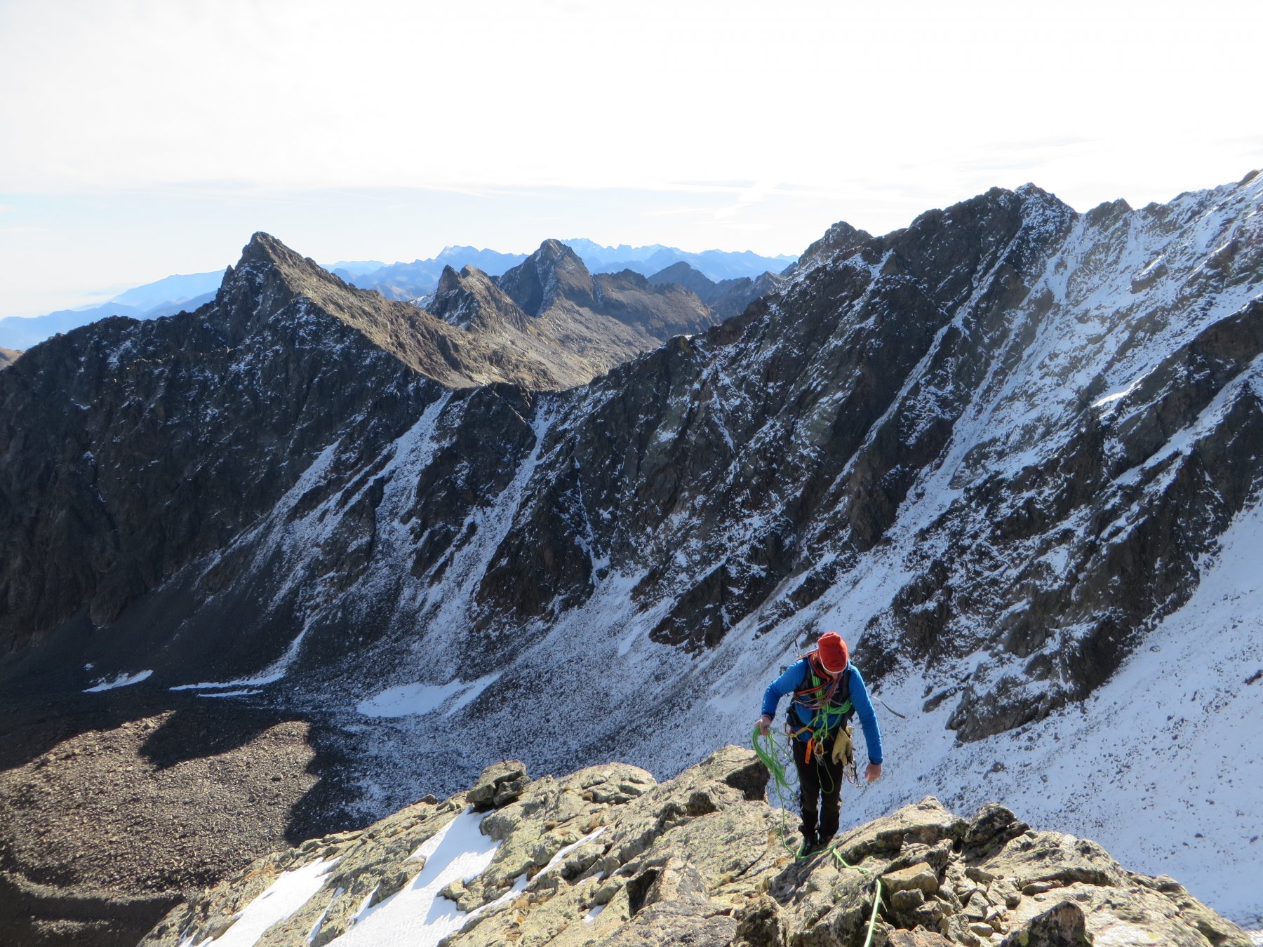 Cima Bertrand – Forcella dell’Ubac (2900m) – Testa dell’Ubac (2991m), PD: si scende facilmente in disarrampicata verso N, fino a raggiungere la base di un gendarme staccato. Salirlo o scontornarlo con decisione sulla sx, senza perdere troppa quota. Una delicata traversata in placca e una breve disarrampicata portano alla forcella dell’Ubac. Da qui si risale il gendarme successivo senza grosse difficoltà (II) e si disarrampica lungo il suo lato, fino a raggiungere l’ultima breve paretina che termina proprio in cima alla Testa dell’Ubac (paletto).