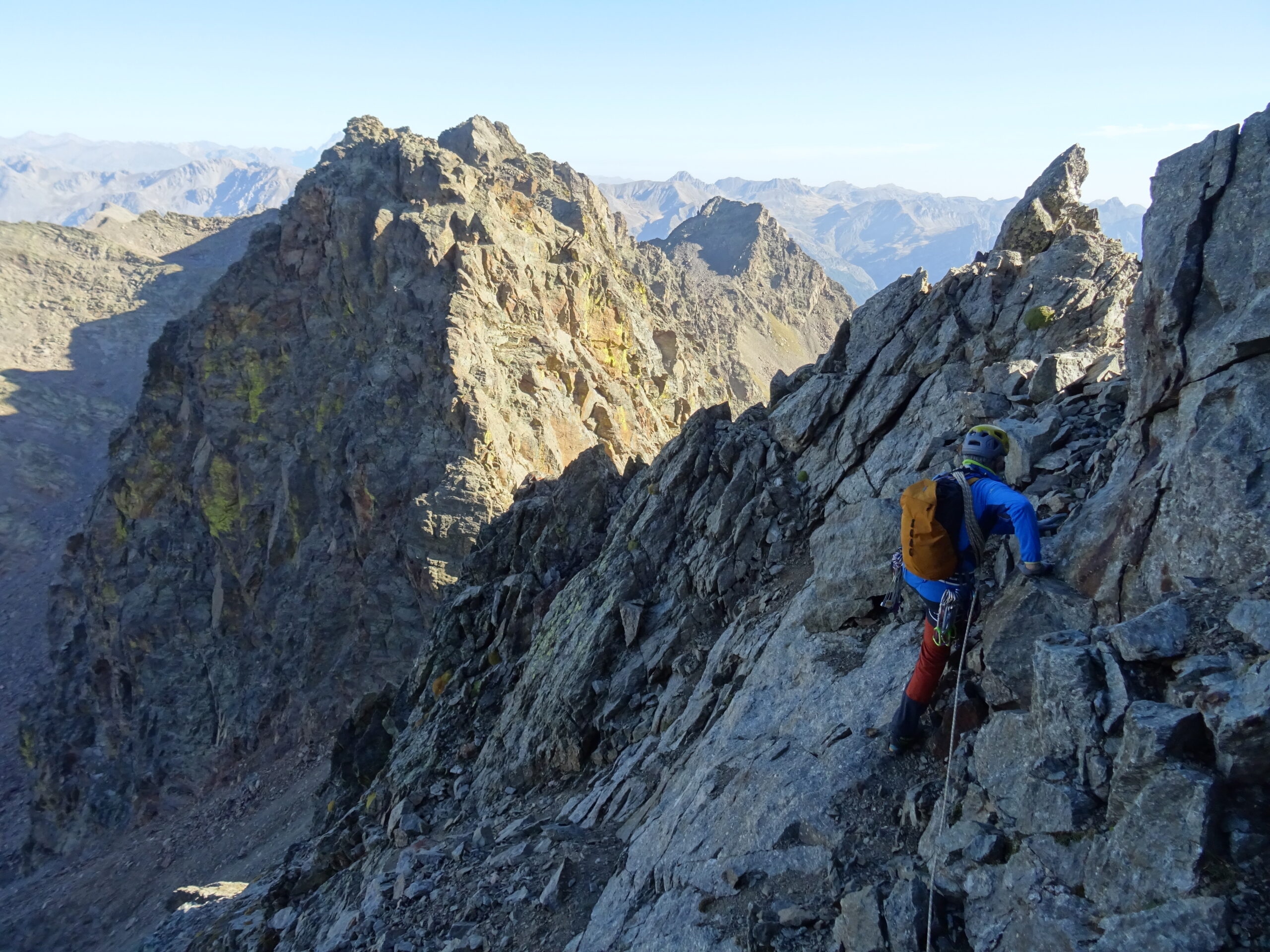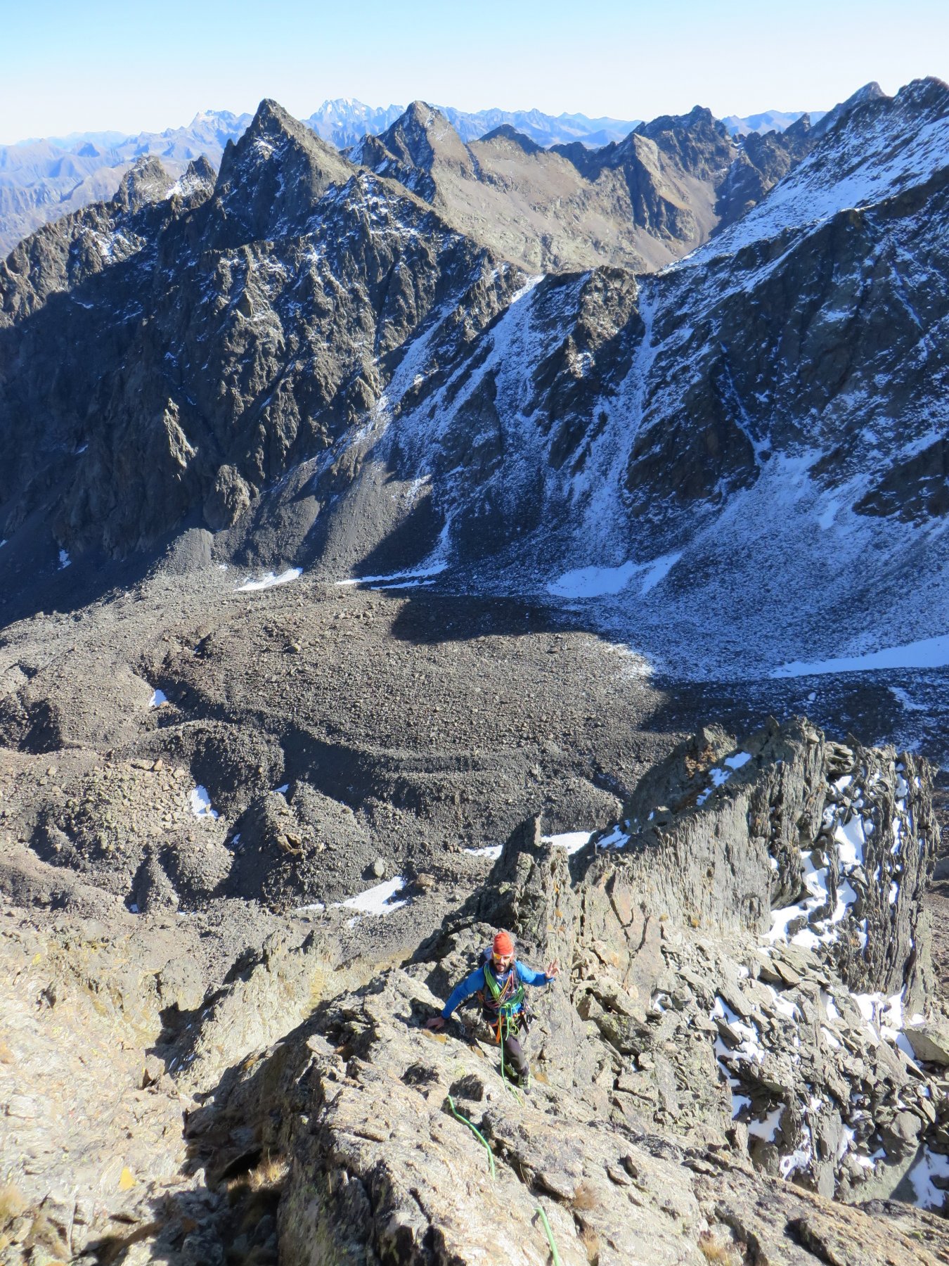Colletto Bertrand – Cima Bertrand (2982m), AD: dal colletto seguire la cresta di facili gradini (max II+), quindi raggiunta la cima Sud si prosegue su terreno orizzontale, fino a raggiungere un gendarme a lama di coltello che si scende con una breve doppia di 15m. Da qui si supera il gendarme che si ha di fronte sul suo lato dx (IV, ben proteggibile a friend), dopo 15m si raggiunge la sosta a ch.+cordino e si prosegue più facilmente verso sx lungo la cresta. NB: il gendarme di IV è evitabile con una delicata traversata a sx lato Francia, su roccia delicata.
