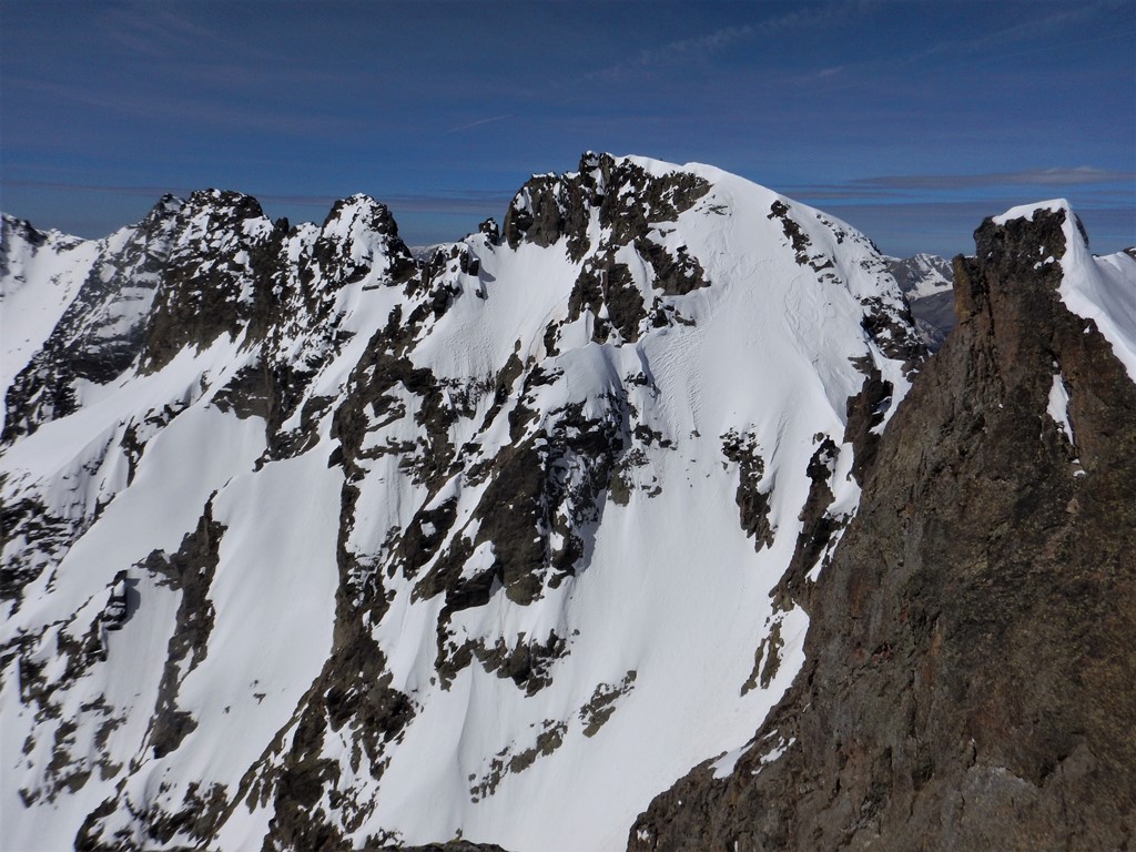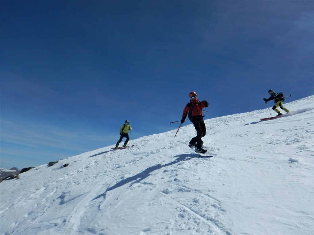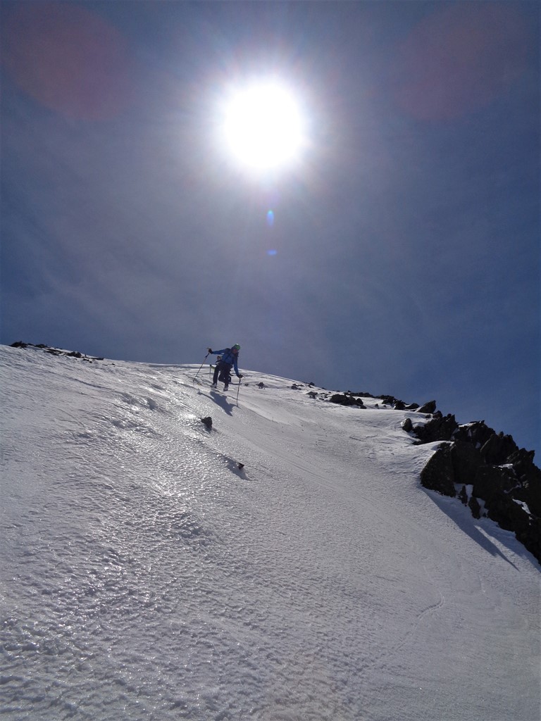 Calzati gli sci poco sopra il rifugio, ottimo rigelo; saliti prima in direzione Becco Alto del Piz al Passo del Vallone con l’intenzione di scendere il canale sul versante opposto ma rinunciato poichè la parte alta è ormai senza neve. Da poco sotto il passo traverso un pò delicato per raggiungere il conoide del canale NE della Testa del Vallone, risalito il canale e di qui in breve in cima. Dalla Testa del Vallone scesi su farina pressata nel bacino del gh. dell’Ubac, risalito il pendio nord est sino al passaggio in cresta e di qui alla Testa. Discesa dalla cima su neve marmorea (tolto gli sci in un tratto) sino al passaggio a nord, qui farina pressata irregolare sino alla conca del ghiacciaio, meglio le expo al sole e poi ancora mix di neve ventata e sastrugi a raggiungere il cippo della Lausa, dove finalmente la primaverile ha “sistemato” la discesa.