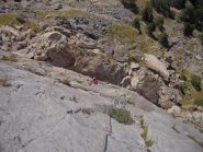 - L7: 5a a dx verso un diedro erboso, uscirne e puntare ad una sosta con catena.