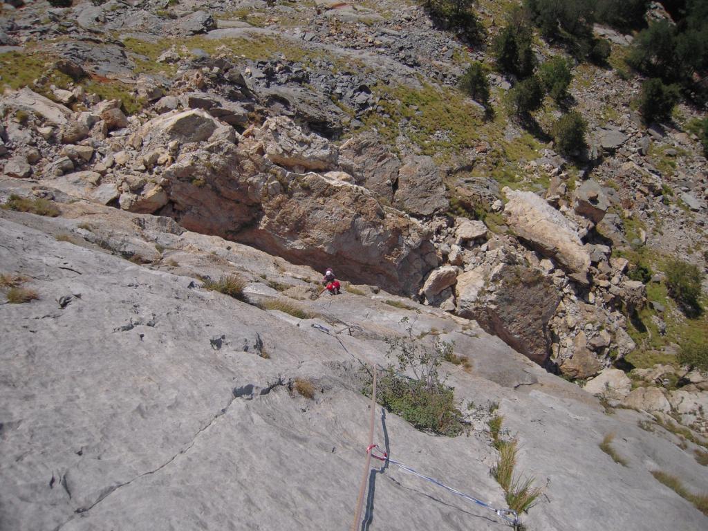 Dopo il primo tiro in fessura strapiombante di Accademiche seguire per una lunghezza gli spit della via francesca che sale diritta sopra la prima sosta e supera una magnifica placca(nel suo genere e difficoltà forse il tiro più bello della sud del pizzo!) che diventa presto verticale ma molto lavorata e concrezionata.