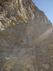 - L4: in discesa sulla cengia fino al secondo albero con cordino, fix visibile cinque metri sopra la sosta alla fine di un esile fessura all interno di un vago diedro