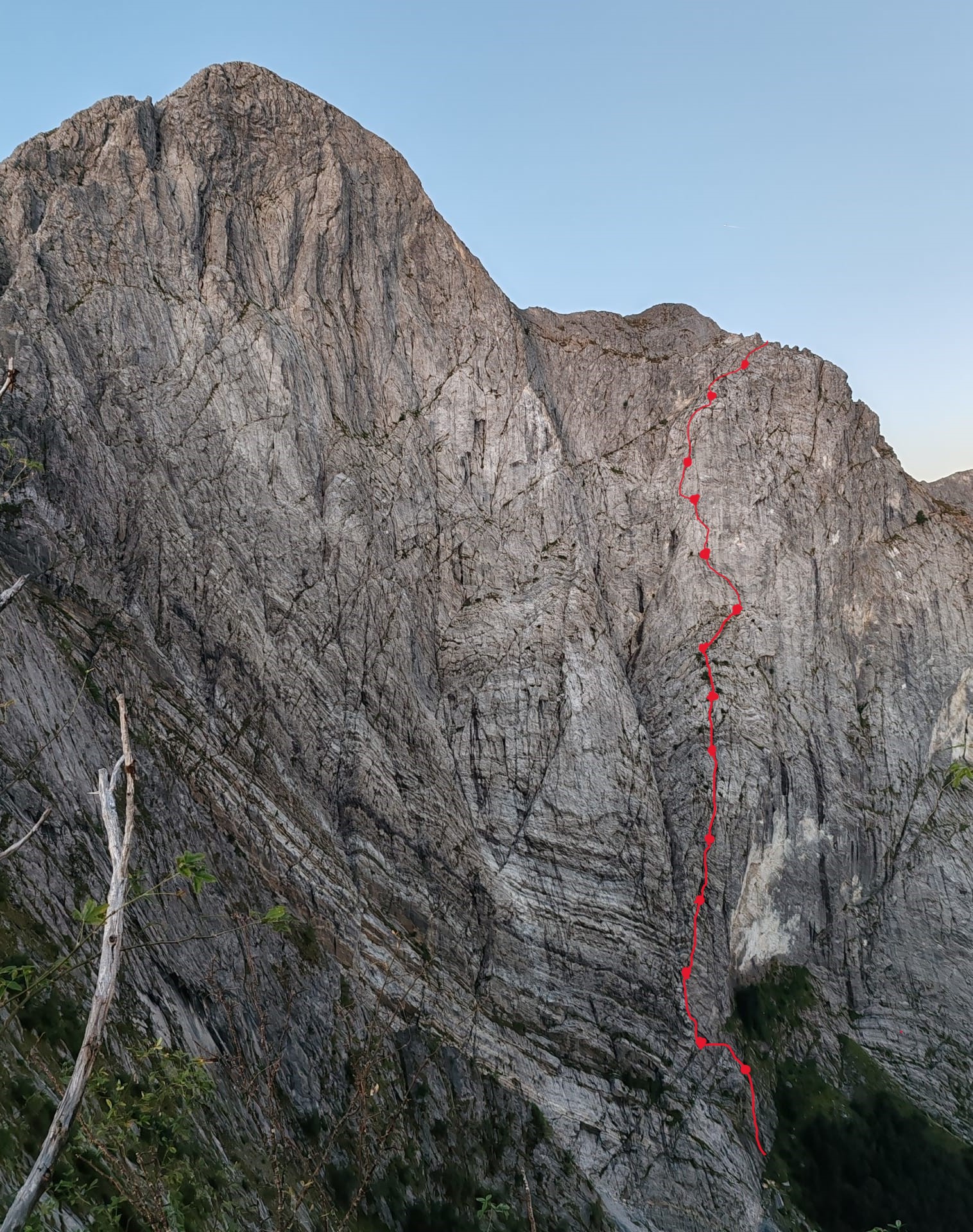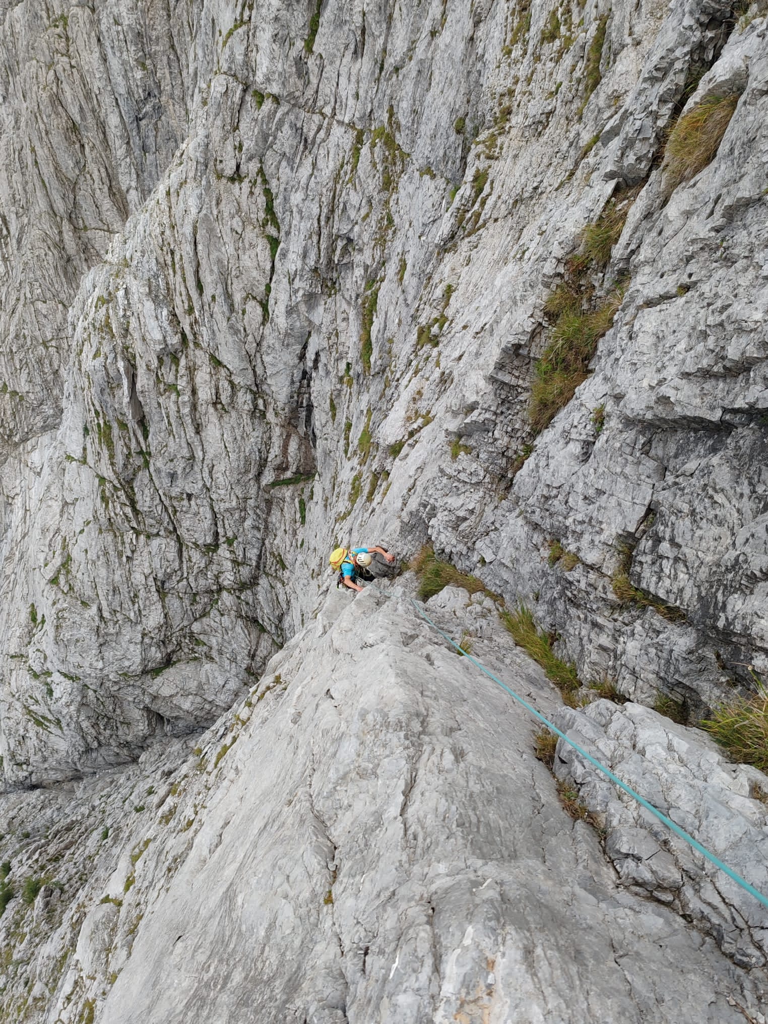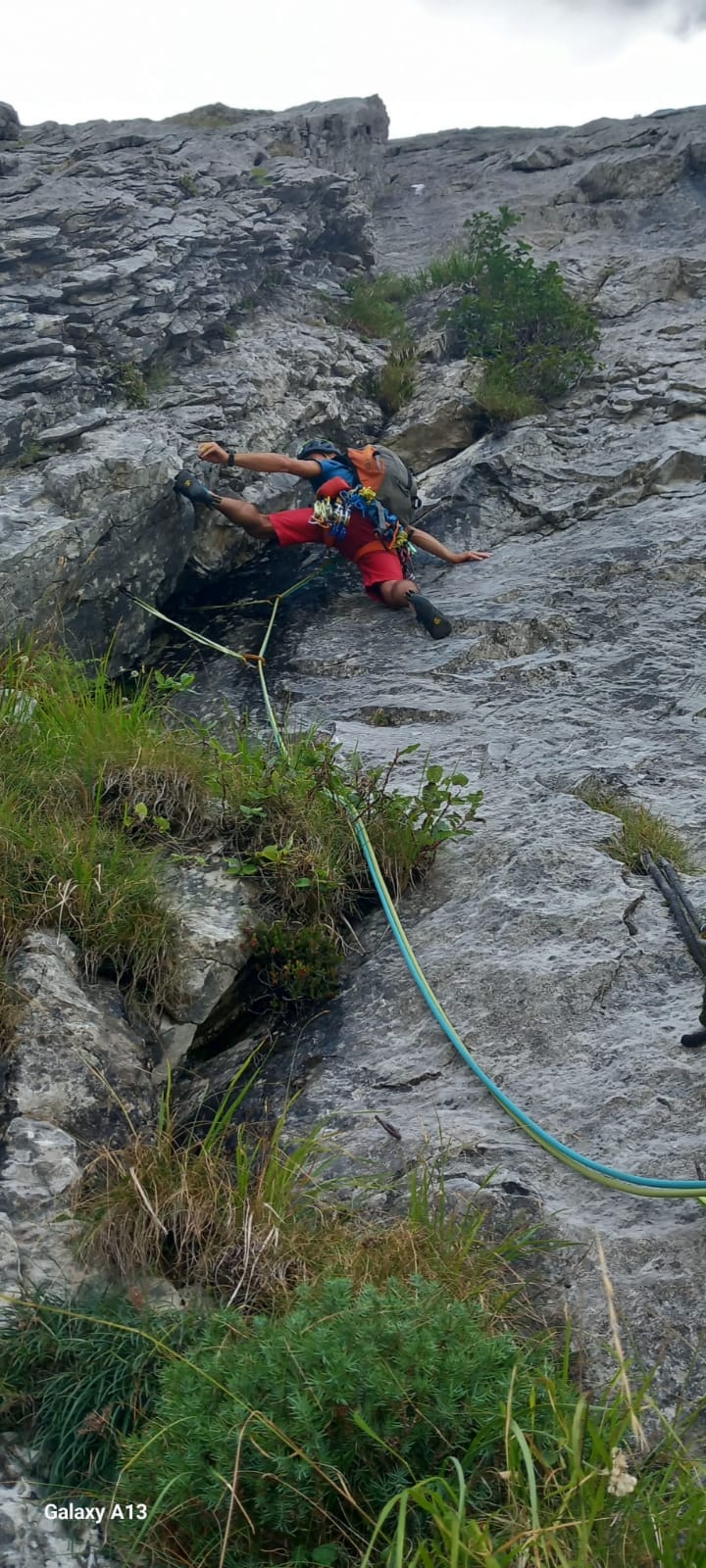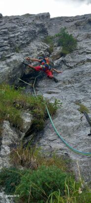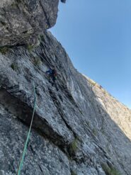 13. Salire sopra la sosta piegando leggermente verso sx fin sotto uno strapiombino, sopra sulla destra c’è l’unico spit di passaggio di tutta la via, raggiungerlo e salire direttamente vincendo una placchetta dopodiché traversare leggermente verso dx ed immettersi in un diedro e seguirlo per alcuni metri fino a raggiungere un ripiano con la sosta chiodo e spit. 25m VI