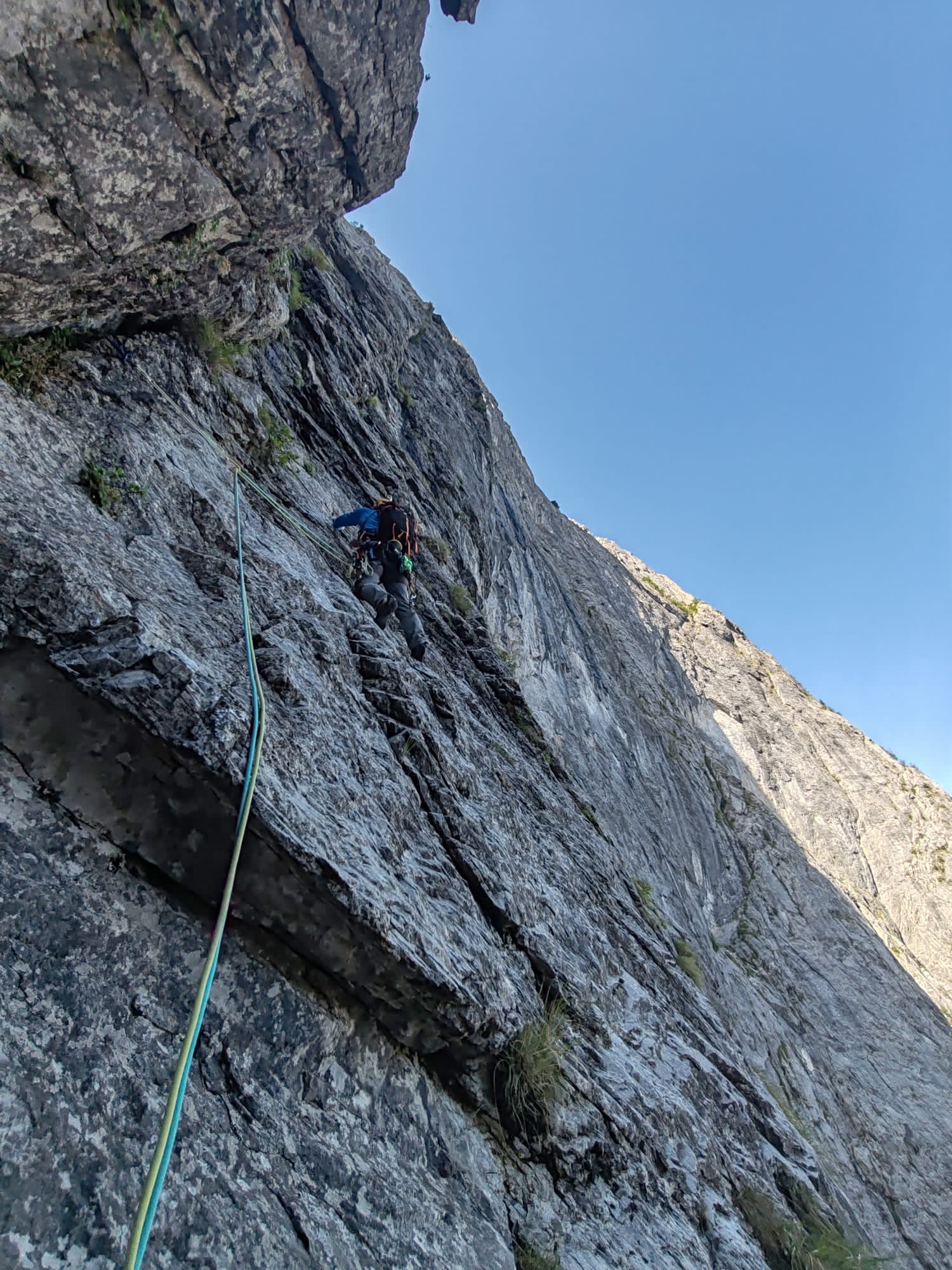 4. salire direttamente sopra la sosta piegando verso dx verso un chiodo con cordino moschettare e rientrare a sx per salire il diedro strapiombante fino al su termine poi traversare a sx e superare un altro strapiombino, per terreno più facile alla sosta chiodo e spit.50m VI