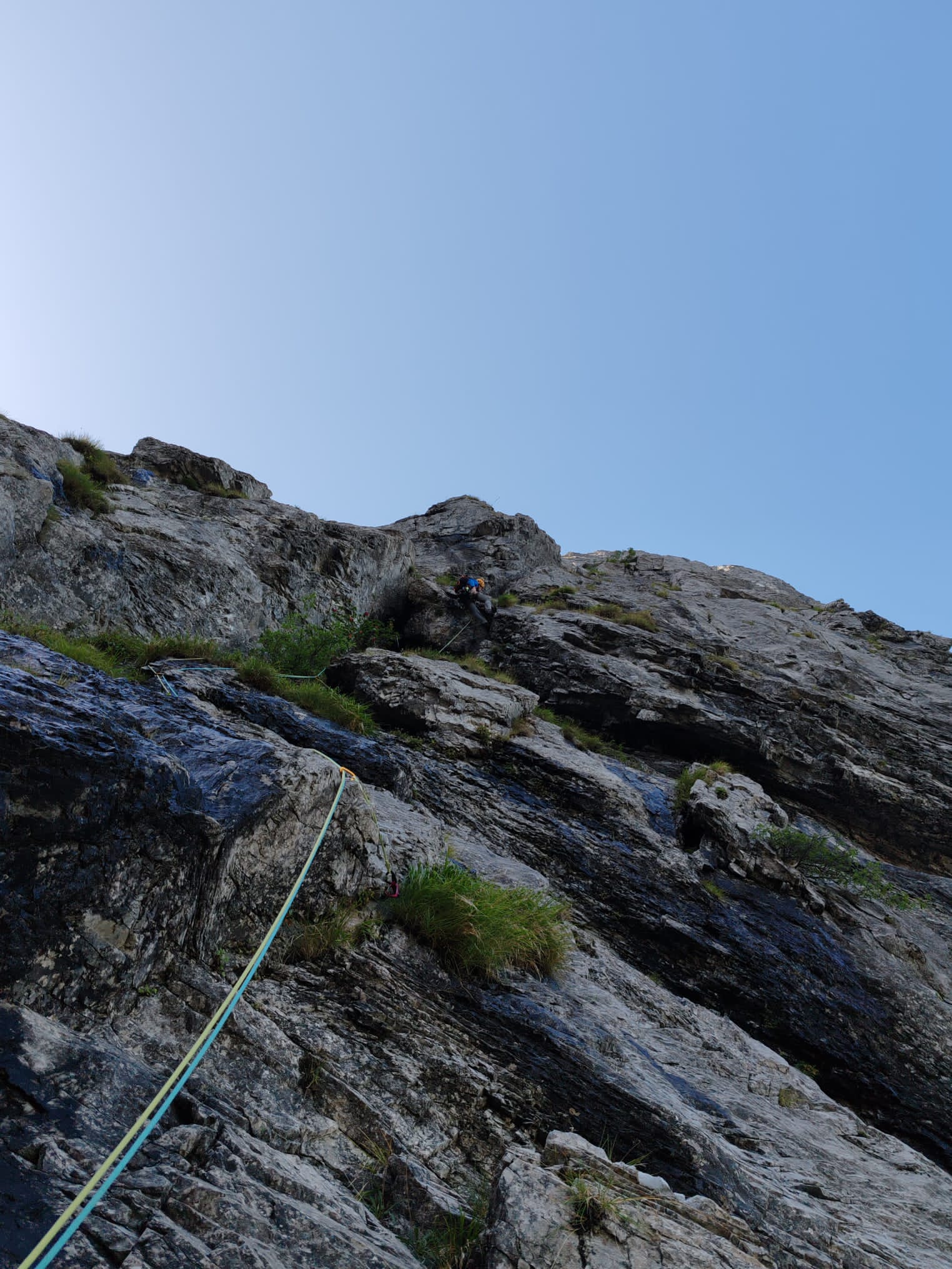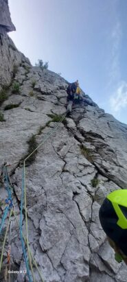 2. salire a sx sopra la sosta un canalino, piegando verso sinistra, e con un’ultima placchetta verso dx giungere alla sosta chiodo e spit presenti. 30m (qui potete arrivare anche traversando su paleo ripido dalla cengia evidente di destra oppure direttamente dal basso per paleo altrettanto ripido). IV