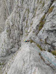 15. Salire qualche metro sopra la sosta e proseguire verso DX seguendo sulla rampa e per terreno ghiaioso e pericoloso con scarse possibilità di protezione ed estremamente esposto seguirla verso dx fino ad incontrare uno spit dove sostare sosta su uno spit non integrabile!!! Prestare molta attenzione. 50m III