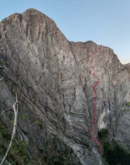 3. Salire sopra la sosta piegando a sx fino ad imboccare una fessura infida a fino al suo termine. Traversare leggermente a dx in placca e rientrare a sx alla sosta. chiodo e spit + un chiodo di via 40m VII-
