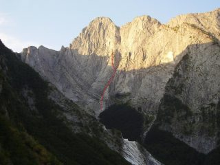 Materiale: 16 rinvii, qualche cordino per allungare le protezioni nei numerosi traversi, casco, due corde da 60m (friend medio facoltativo per proteggersi al quinto tiro dove si incrocia la via della Gola e un fix è stato tolto e il perno schiacciato!…subito dopo c’è la sosta a chiodi della via classica).