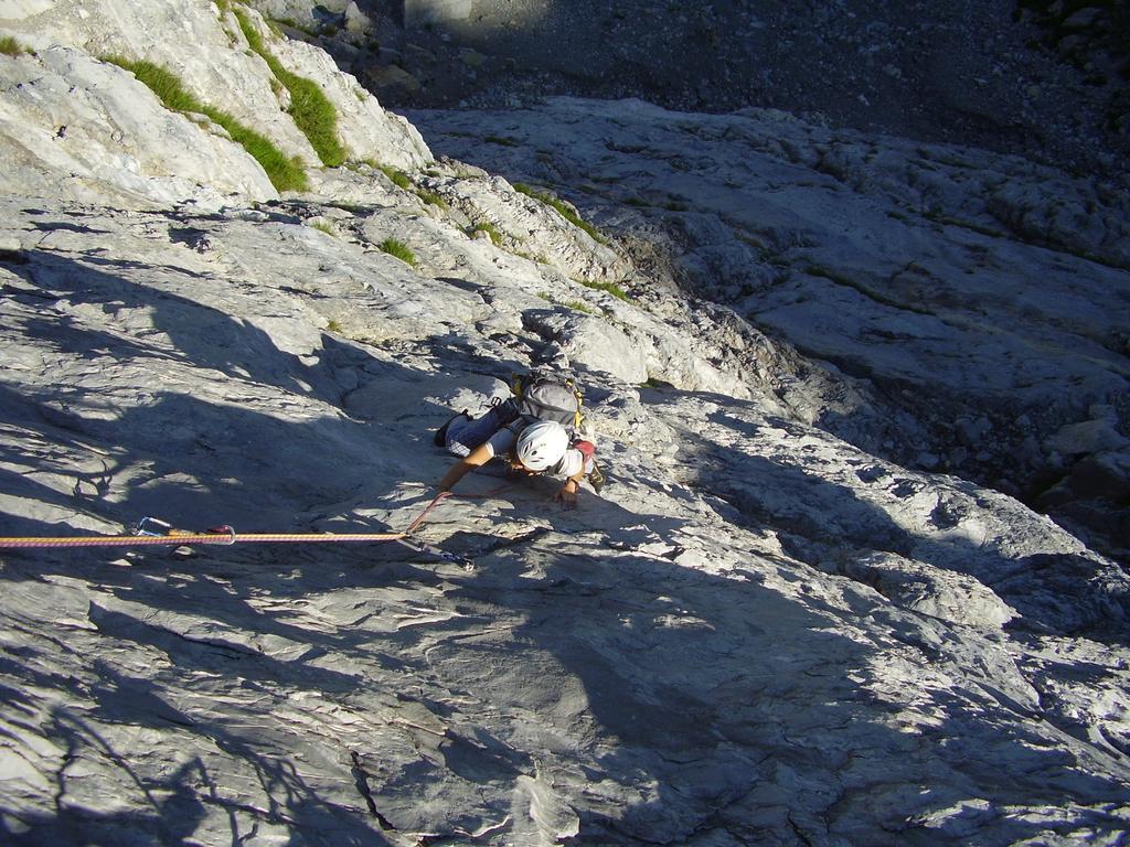 Per placca rimontare poi il successivo pilastrino e portarsi sotto il primo tettino, superarlo nella parte più facile, salire alla base del diedrino appoggiato e proseguire fino alla sosta.
