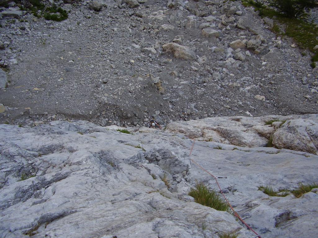 Salito il diedrino sopra la sosta, proseguire a sx per la cengetta erbosa e dopo aver aggirato il pilastrino, salire per roccette e paleo fino alla sosta dove termina la Via, all’inizio del giardino sospeso (roccia delicata).